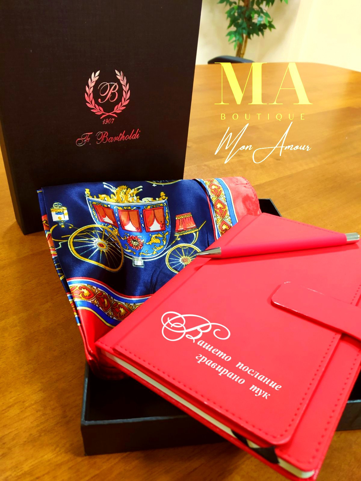 Зарадвайте специалните за вас дами с един специален подарък! Луксозен марков подаръчен комплект F.Bartholdi състоящ се от стилен шал в червен и син цвят , метална червена химикалка и кожен червен бележник , който може да бъде гравиран с Вашето лично послание ! В комплекта се включва и луксозна подаръчна кутия от черен цвят с марка F.Bartholdi. Срок за изработка: До 3 работни дни . Доставка: До адрес или офис на Еконт/Спиди. Начин на плащане: Наложен платеж, в брой, по банков път.