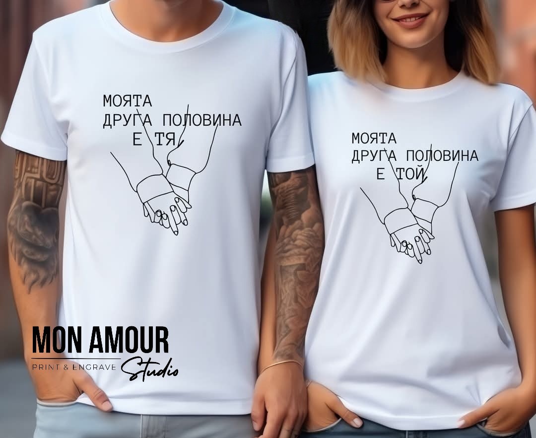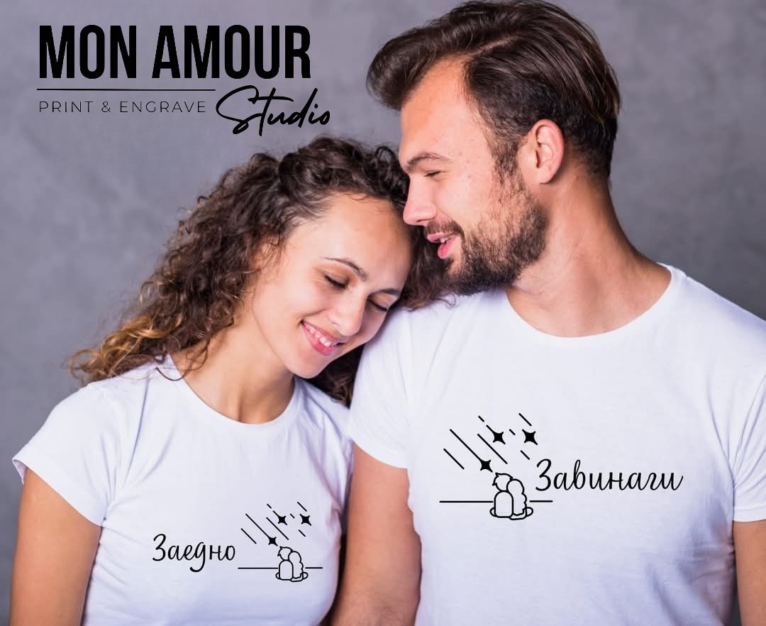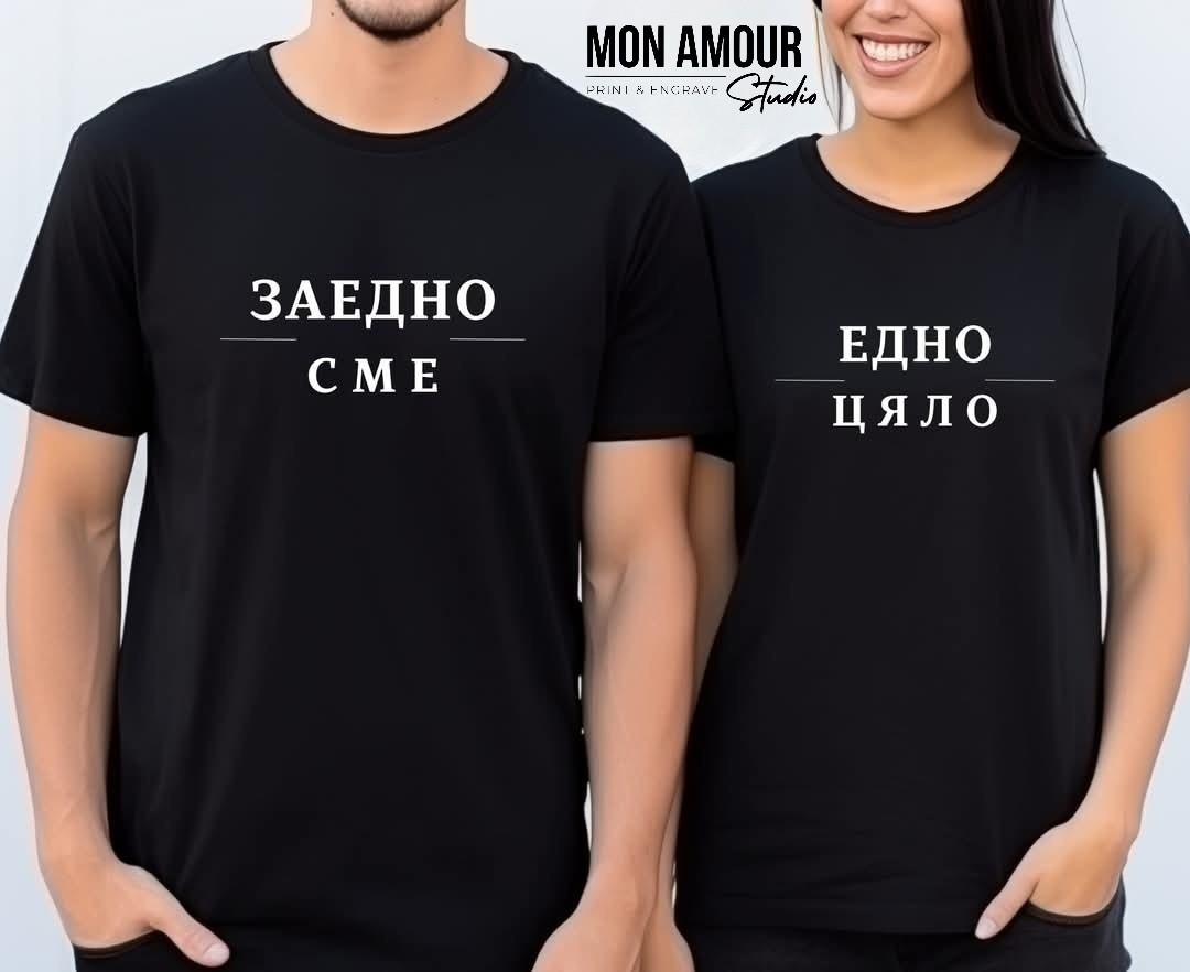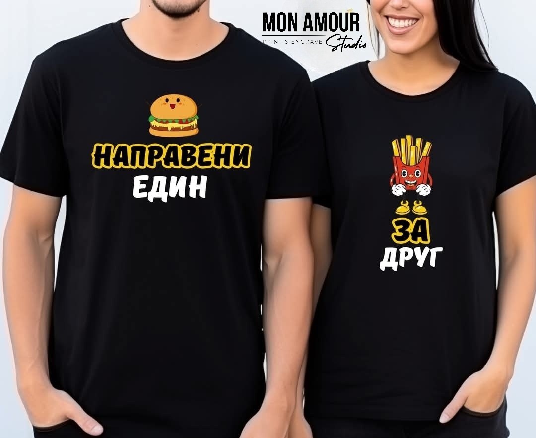Комплект тениски за двойки със снимка и/или текст по ваш избор! Тениските се предлагат основно в бял и черен цвят. Ако желаете тениска в друг цвят е нужна предварителна заявка. *Посочената цена е за 2 бр. тениски с печат на снимка или текст 52.99 лв. като се предлагат и поединично на цена 26.50 лв. Срок на изработка: 3-4 работни дни Плащане: В брой, с наложен платеж или по банков път. Доставка: До адрес или офис на Спиди / Еконт.