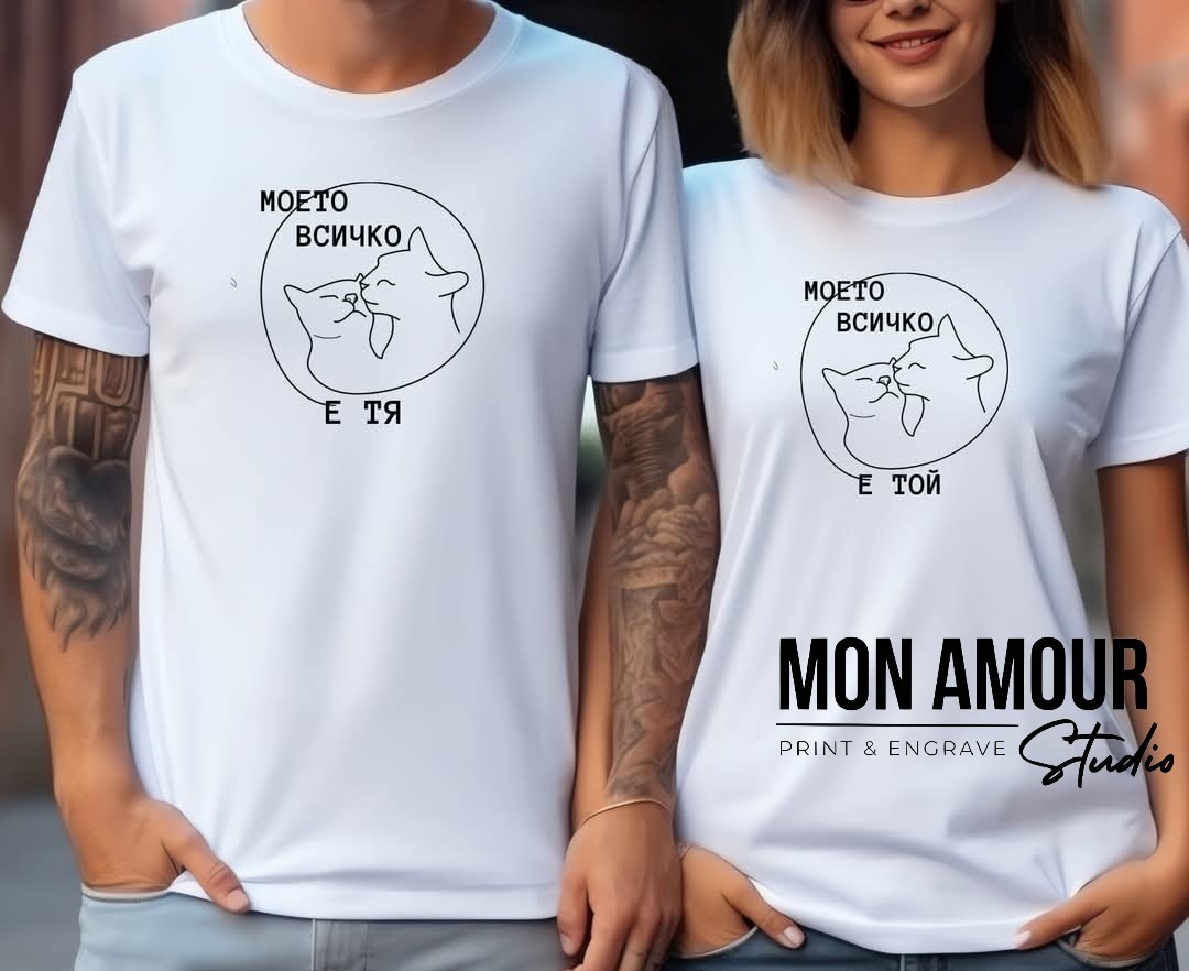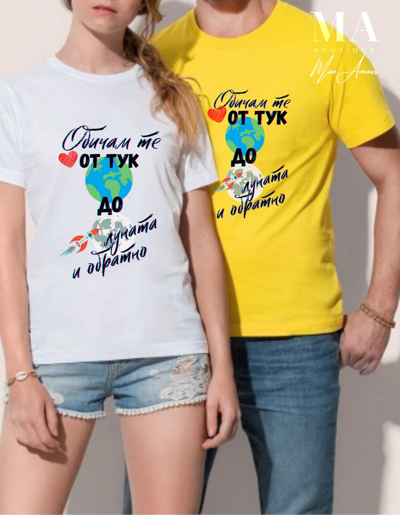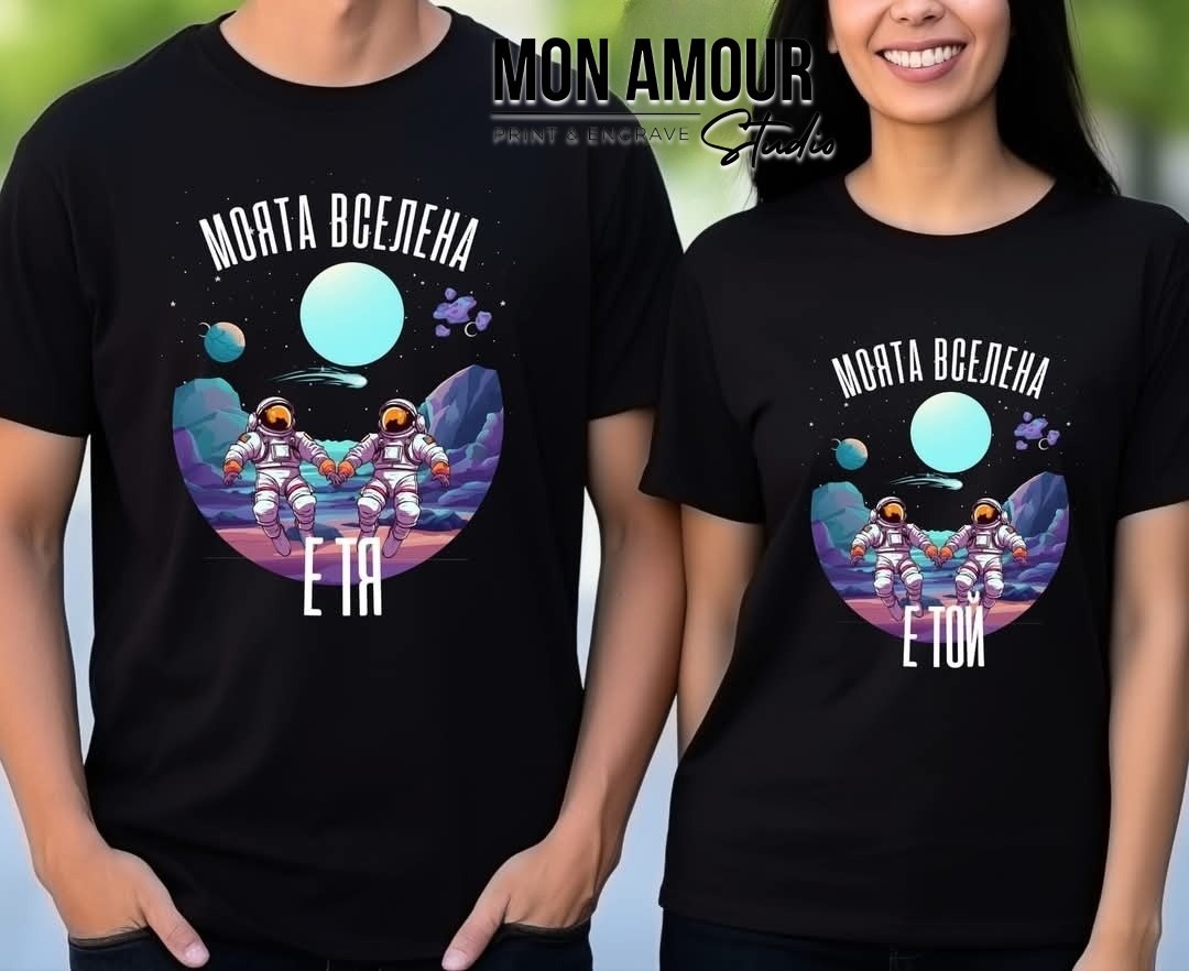 Комплект тениски за двойки със снимка и/или текст по ваш избор! Тениските се предлагат основно в бял и черен цвят. Ако желаете тениска в друг цвят е нужна предварителна заявка. *Посочената цена е за 2 бр. тениски с печат на снимка или текст 52.99 лв. като се предлагат и поединично на цена 26.50 лв. Срок на изработка: 3-4 работни дни Плащане: В брой, с наложен платеж или по банков път. Доставка: До адрес или офис на Спиди / Еконт.