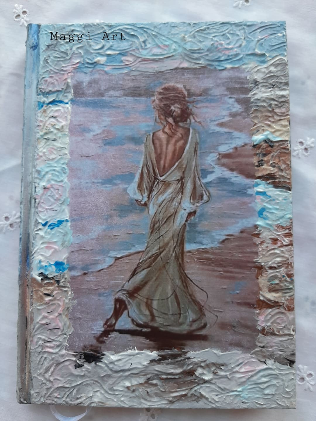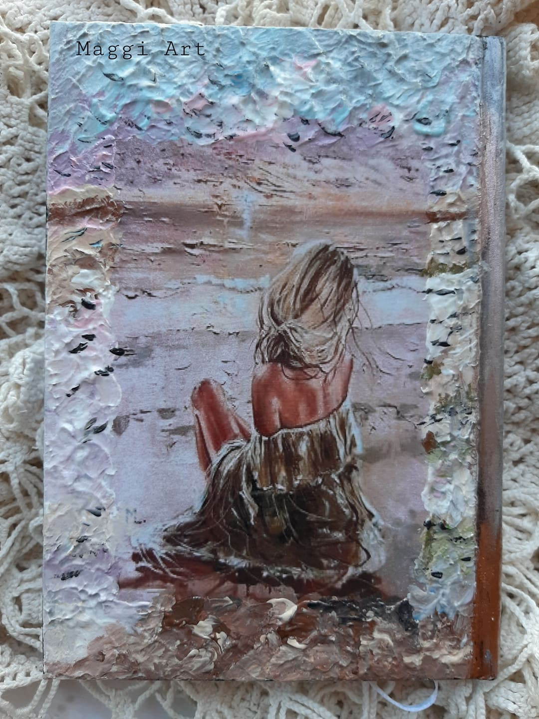 Здравейте и успешна,щастлива нова седмица на всички. Отново съм на любимата ми тема-Морето и за начало на седмицата ви представям новият ми ръчно декориран кожен тефтер"В очакване".Тефтерът е с разделител и има 150бр. луксозни листове за писане.Размер-А5. Мога да направя и с мотиви по ваше желание.