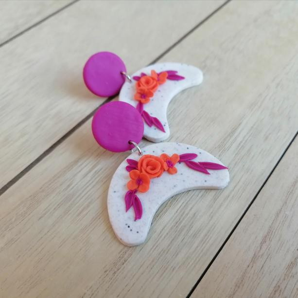 Ярки обеци с цветя, изработени на ръка от полимерна глина. На щифт от стомана. - Обща дължина: 4 см.