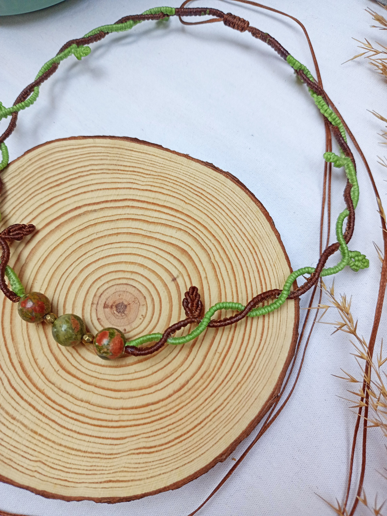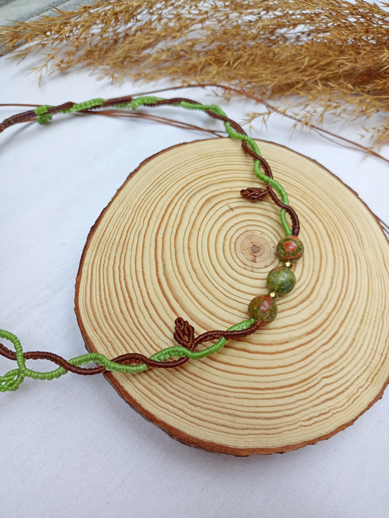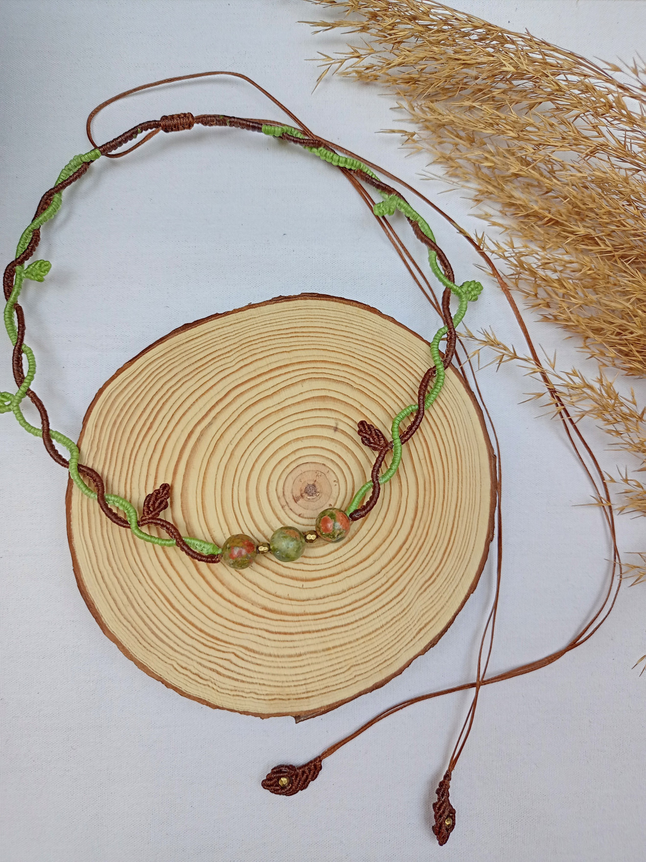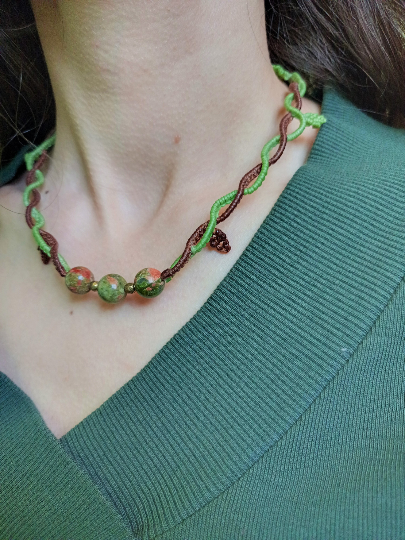 Горско макраме колие "Горска приказка". ?Елегантно колие с три естествени камъни Унакит в цветове светло зелено и кафяво. ?Техниката на изработка е микро - макраме, като съм използвала висококачествени турски восъчни конци. ?Размери: дължина на изплетената част е 42 см. Ширина: 1,8 см. ?Каишката се регулира, като дължината е около 51 см. Регулира се и е подходящо за всяка дължина. ?Пакетирано в официална подаръчна опаковка, готово за поднасяне и подаряване. #микромакраме #макраме #абитуриентскибал #ръчноизработенибижута #ръчнаизработка #подарък #подаръкзанея #амарантмакраме