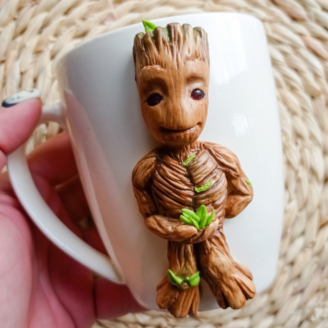 Керамична чаша с релефна, ръчно изработена декорация от полимерна глина бебе Грут. Моля, свържете се с мен за актуален срок на изработка. #чашасполимернаглина #бебегрут #бръшлянка #чашасгерой
