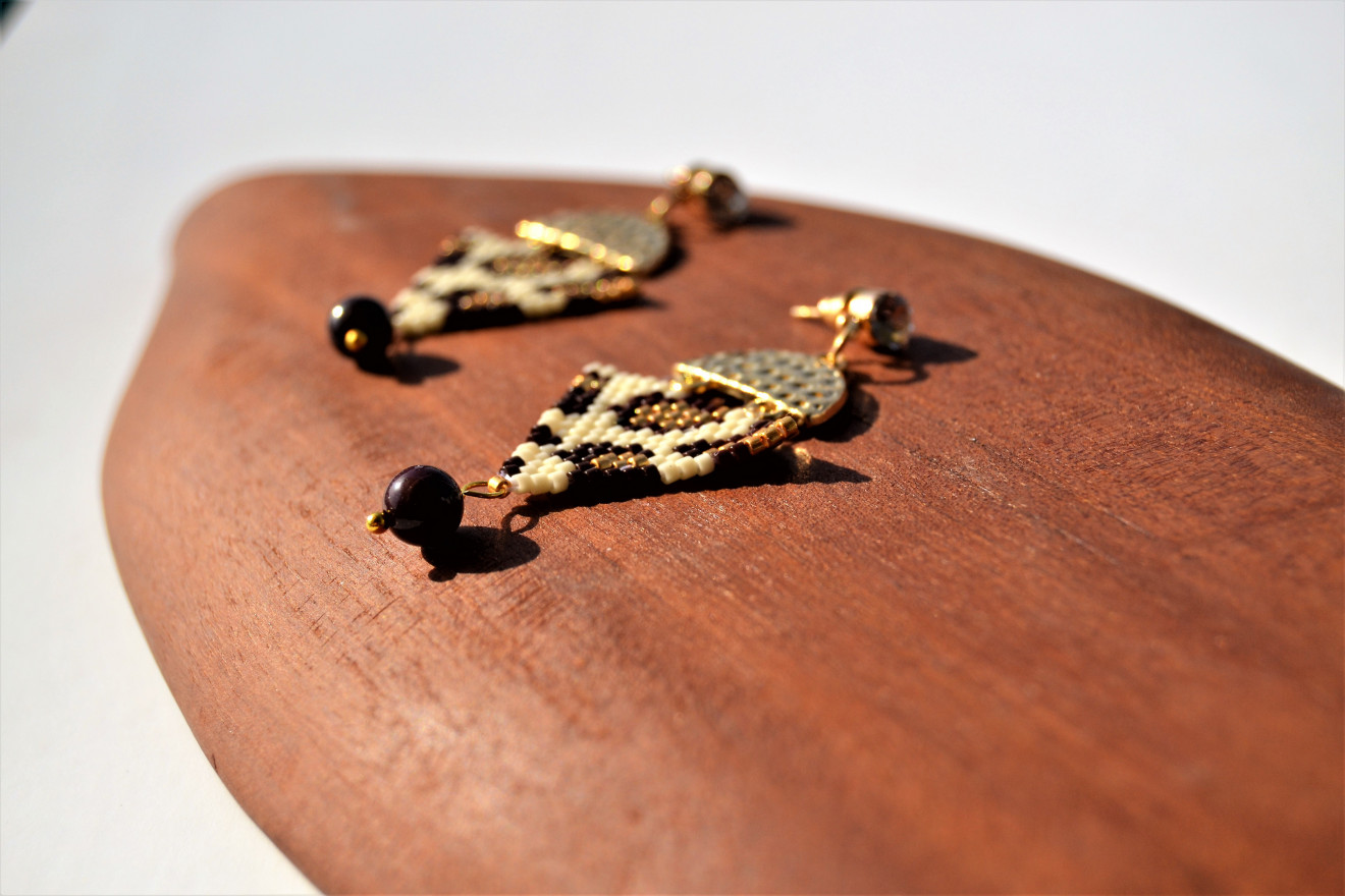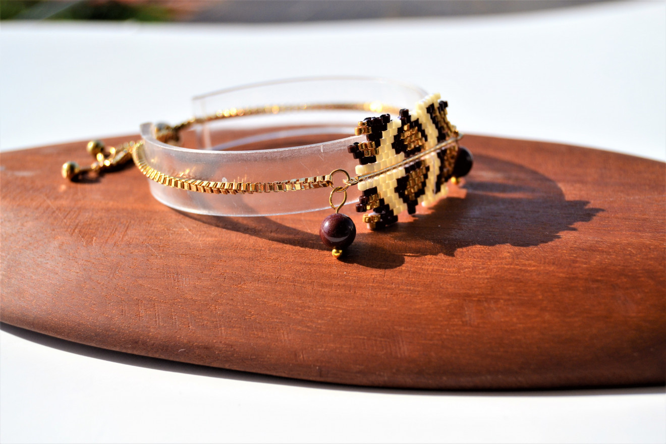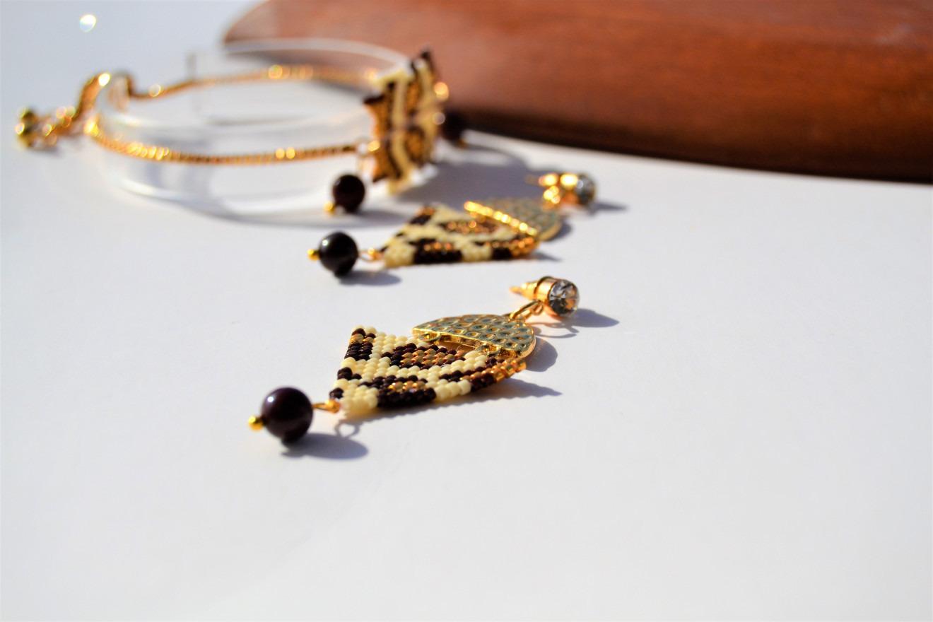 Комплект от гривна и обеци . Бижутата са изработени в стил ,,сафари,, от японски стъклени мъниста, метални елементи и естествени камъни-мукаит. Камък , който ни дава баланс между вътрешните и външни нива, стабилизира и внушава дълбоко спокойствие.