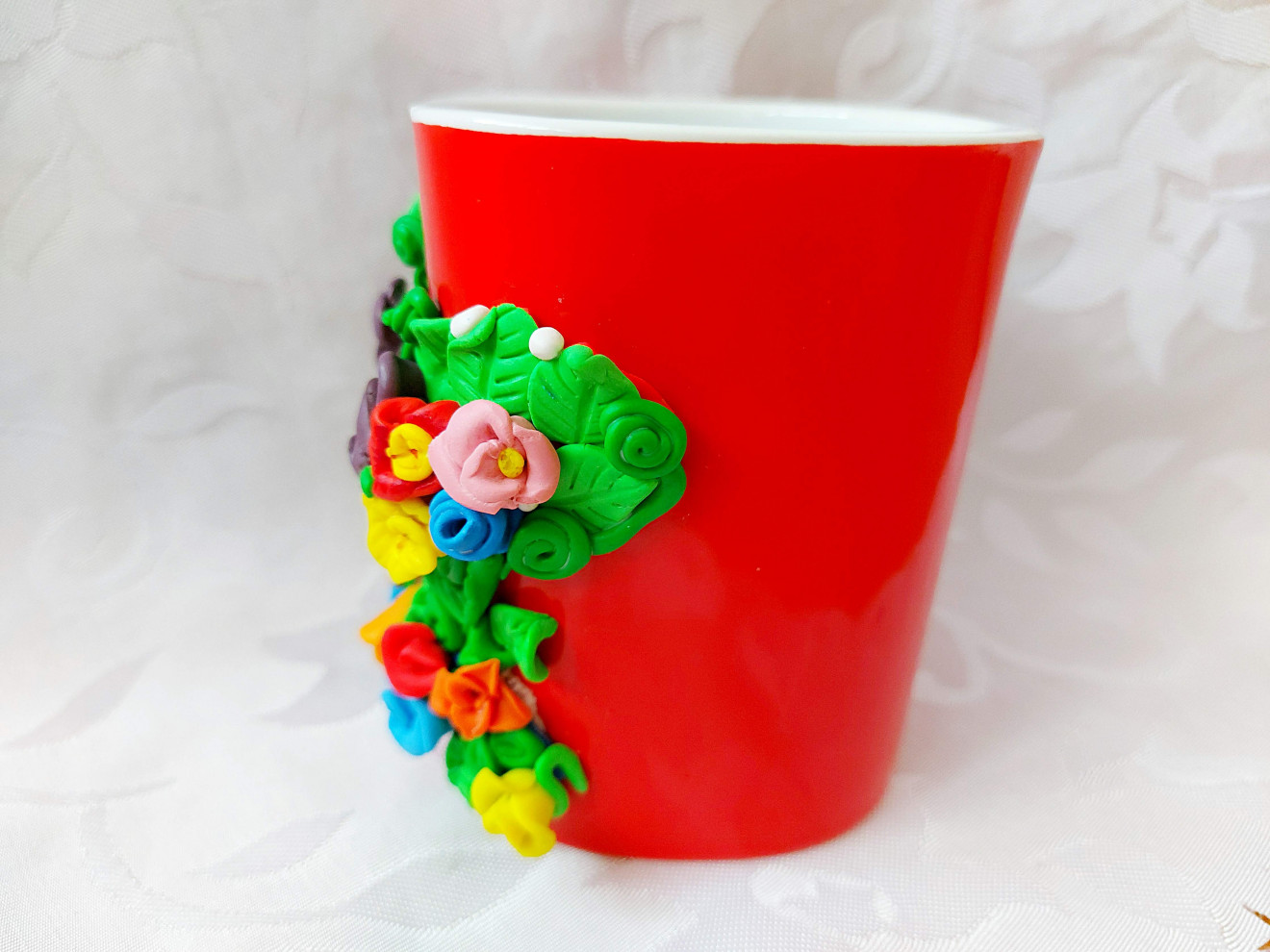Голяма чаша в червен цвят и ръчно изработена декорация от полимерна глина. На гърба може да се изпише и име.