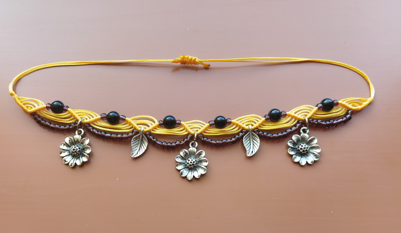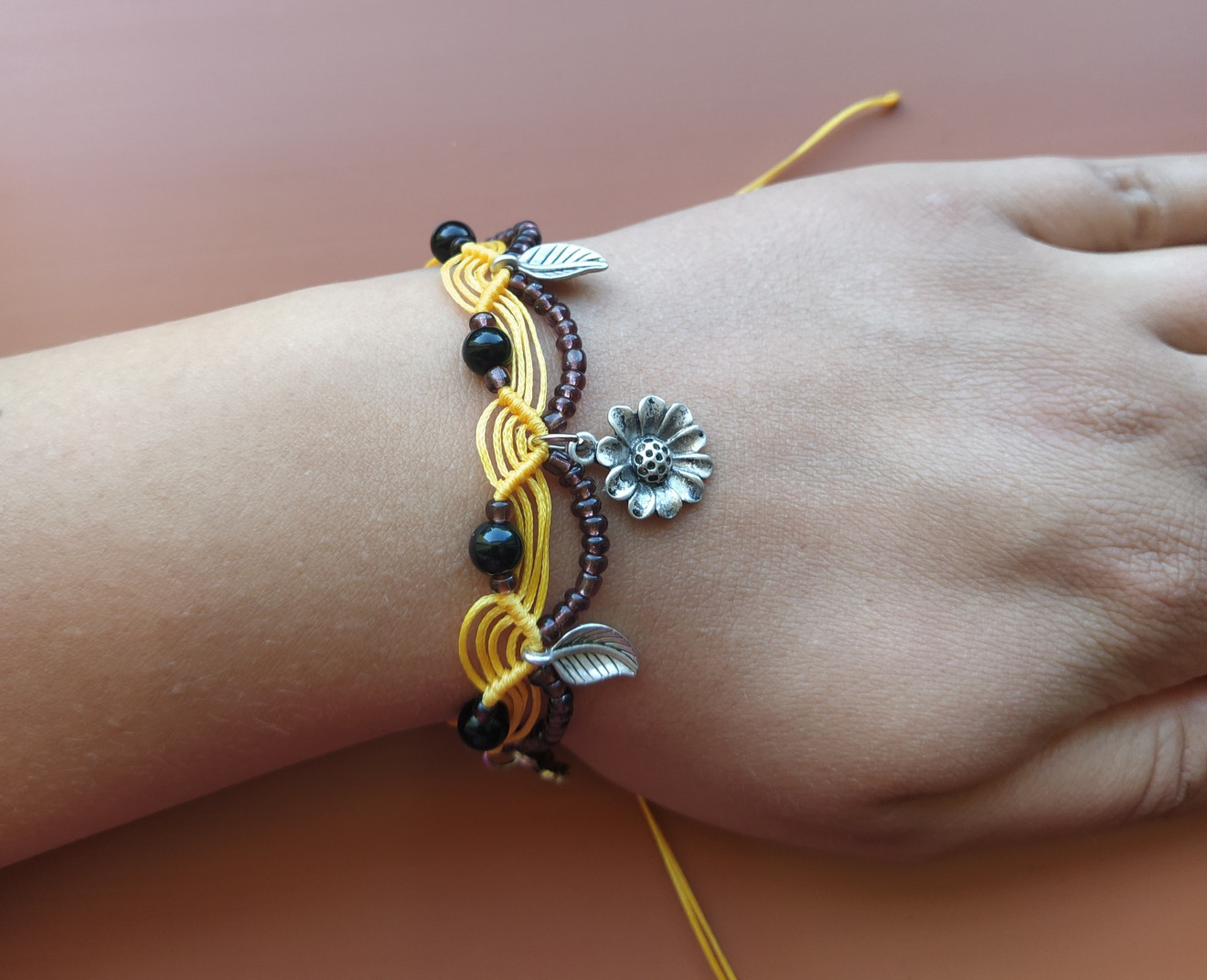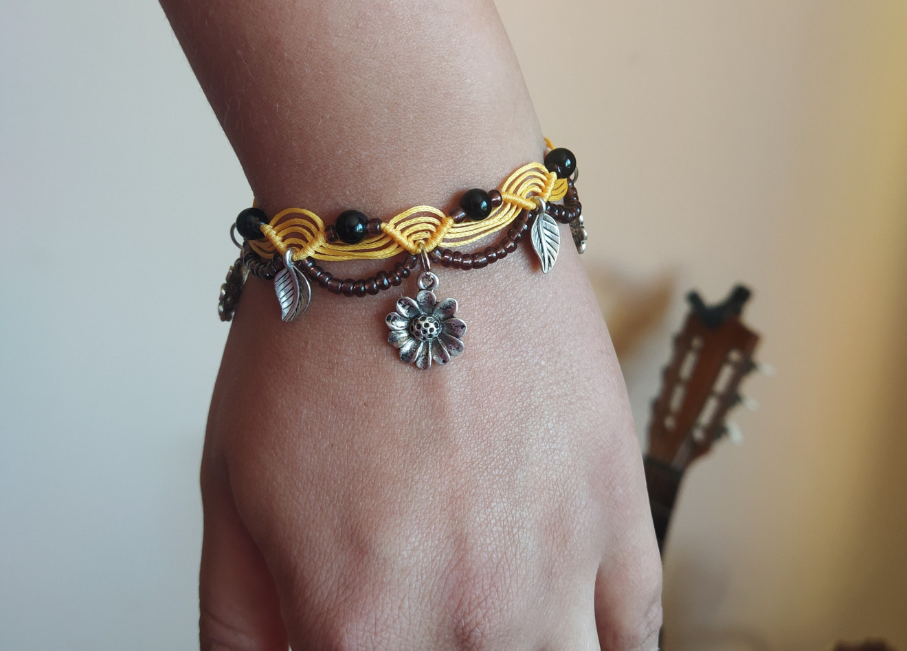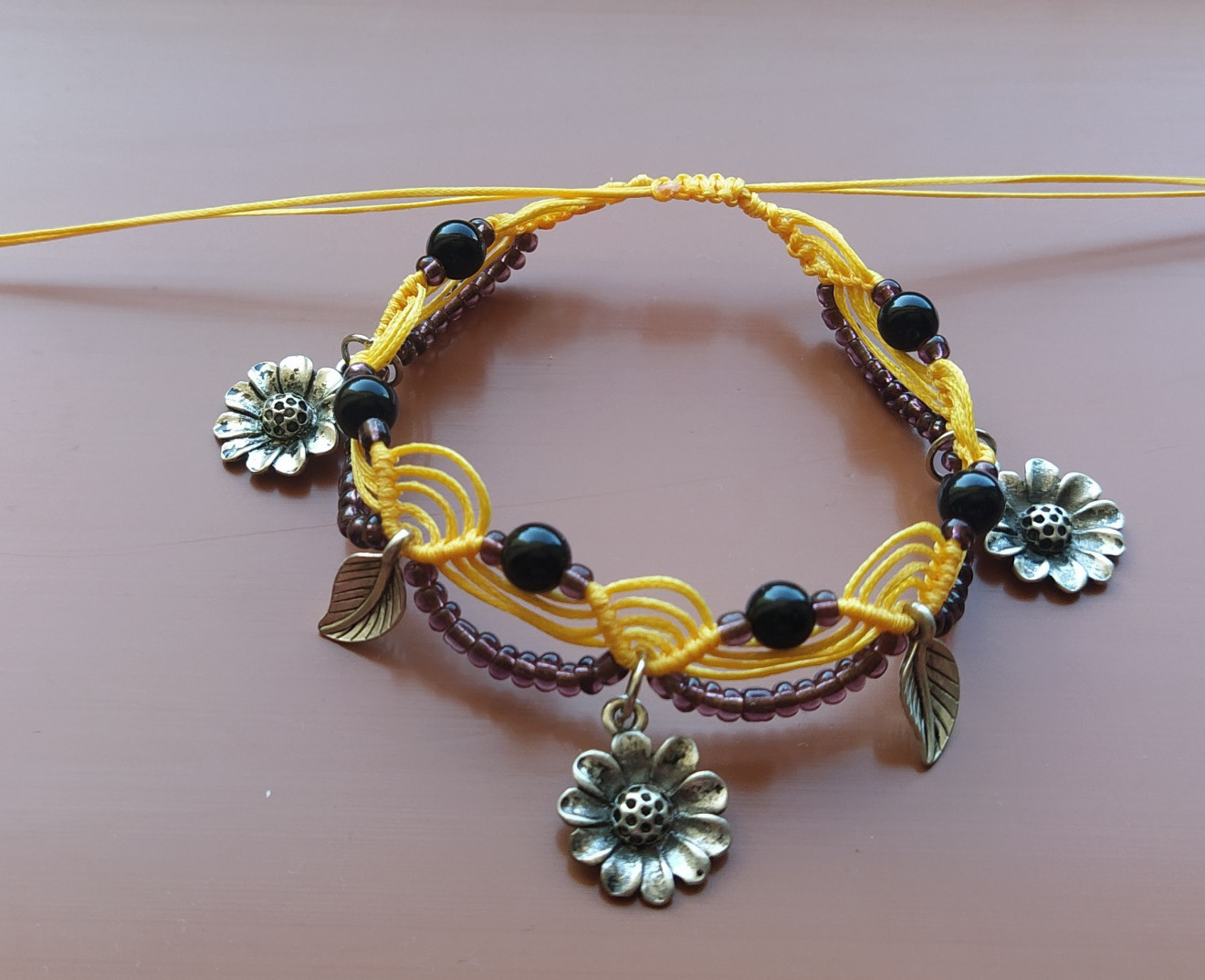 Гривната е изработена от восъчни конци, дребни мъниста, метални елементи и естествен камък Оникс 6 мм. Подходяща е за носене, както на китката, така и на глезена. Плетената част е 19 см., регулира се чрез пристягане като в най-разпънато състояние е близо 36 см. Артикула идва при Вас опакован и готов за подаряване. За повече информация, въпроси или друго, моля, не се колебайте да се свържете с мен.