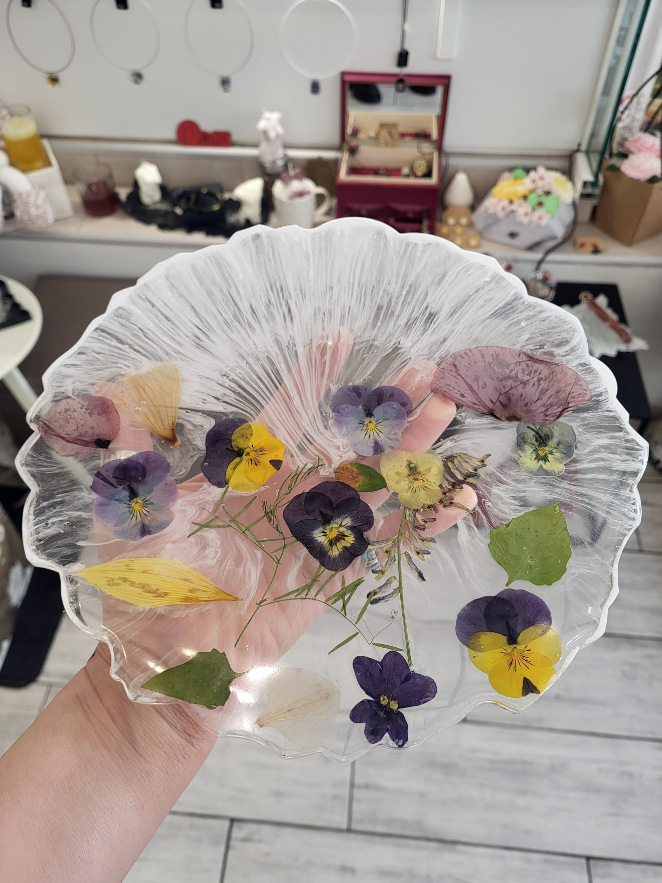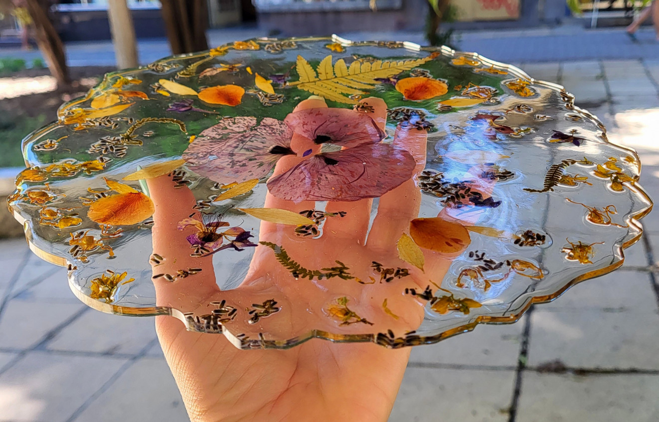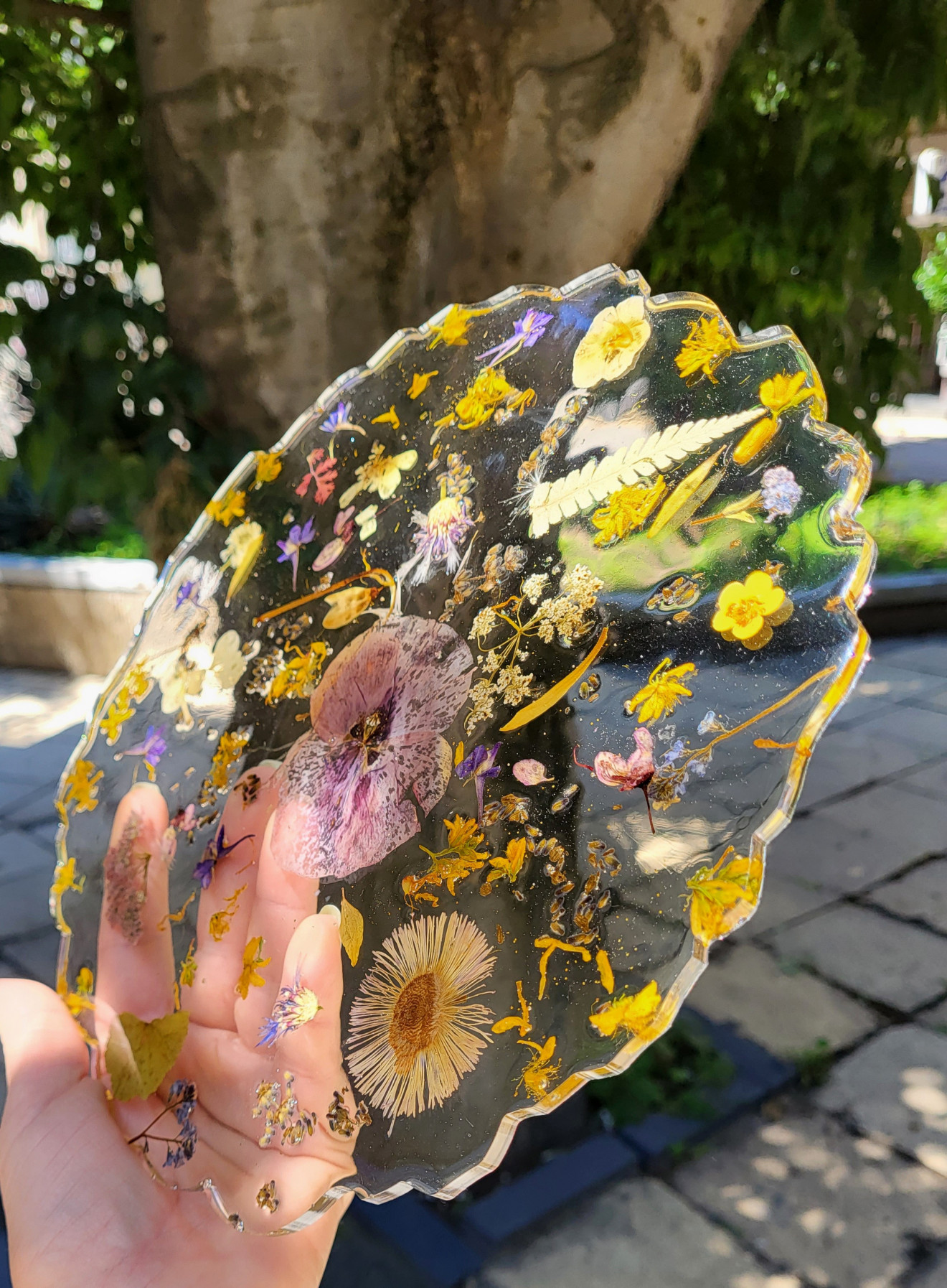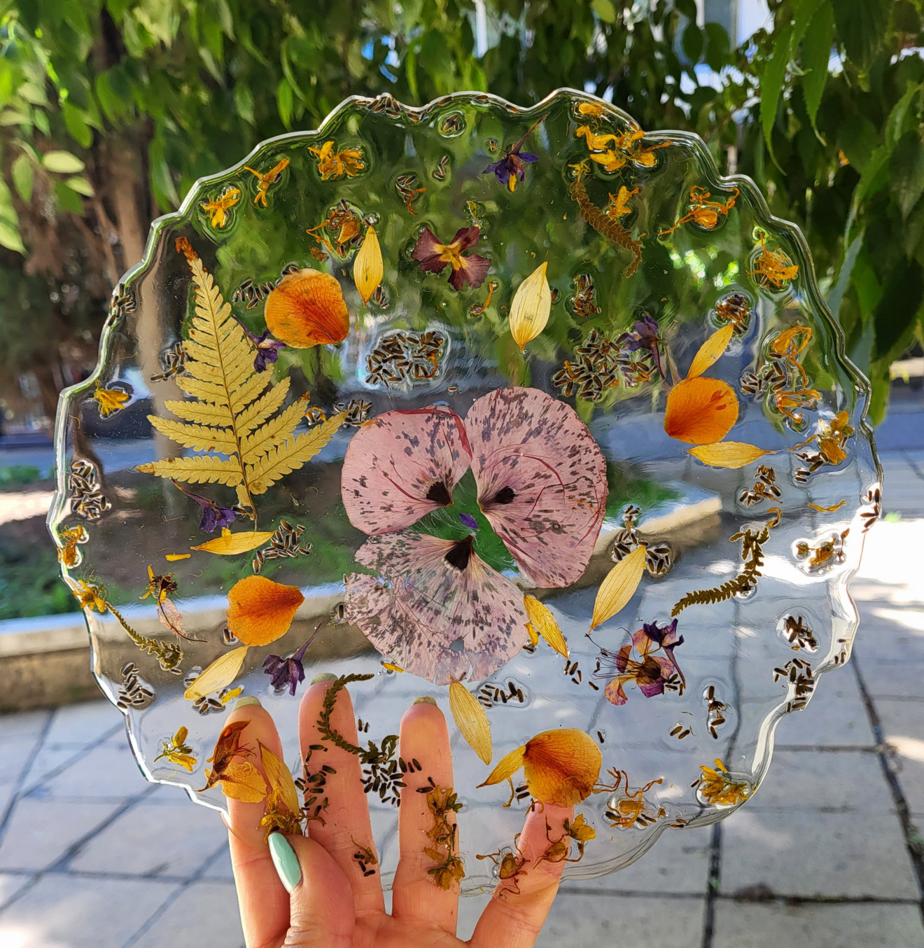 Ръчно изработен поднос от кристална епоксидна смола с вградени естествени цветя