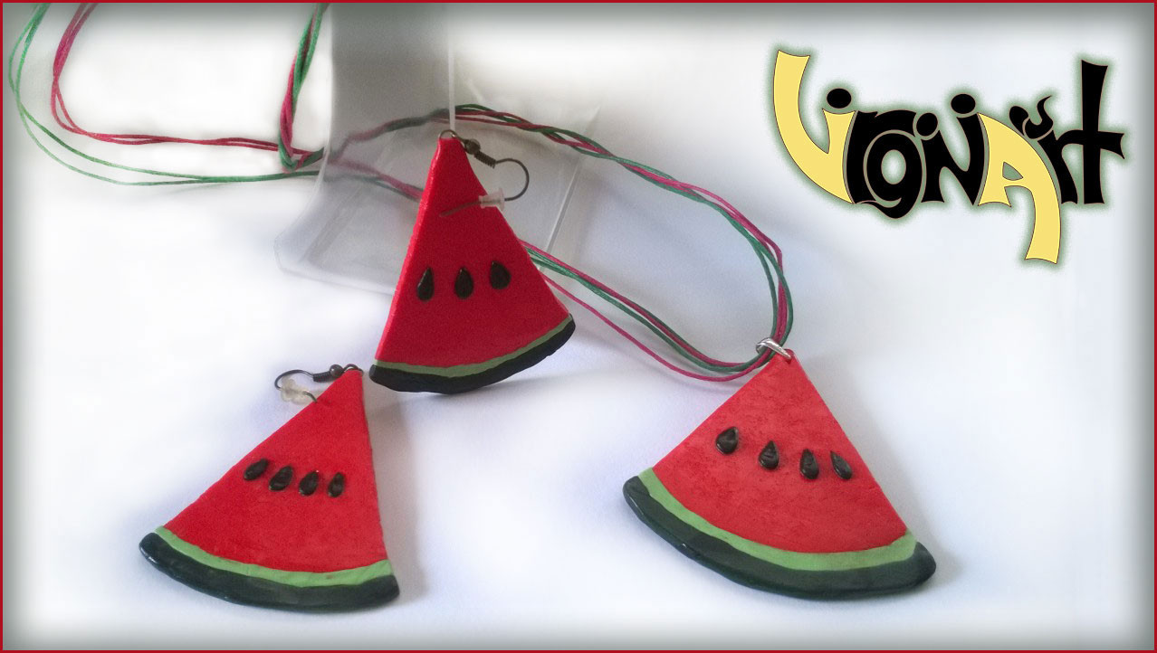 Авторски ръчно изработен комплект от полимерна глина, шнур и метални елементи. Дължина на колието: 41 см. Дължина на обеците: 8 см.