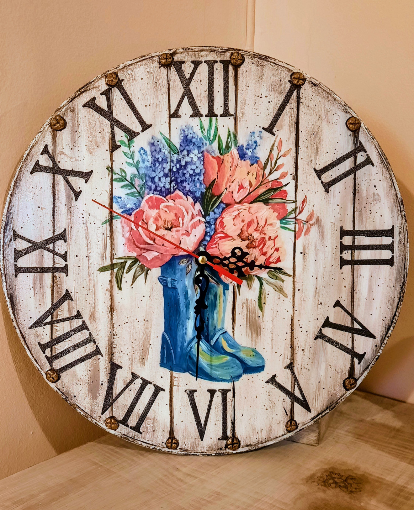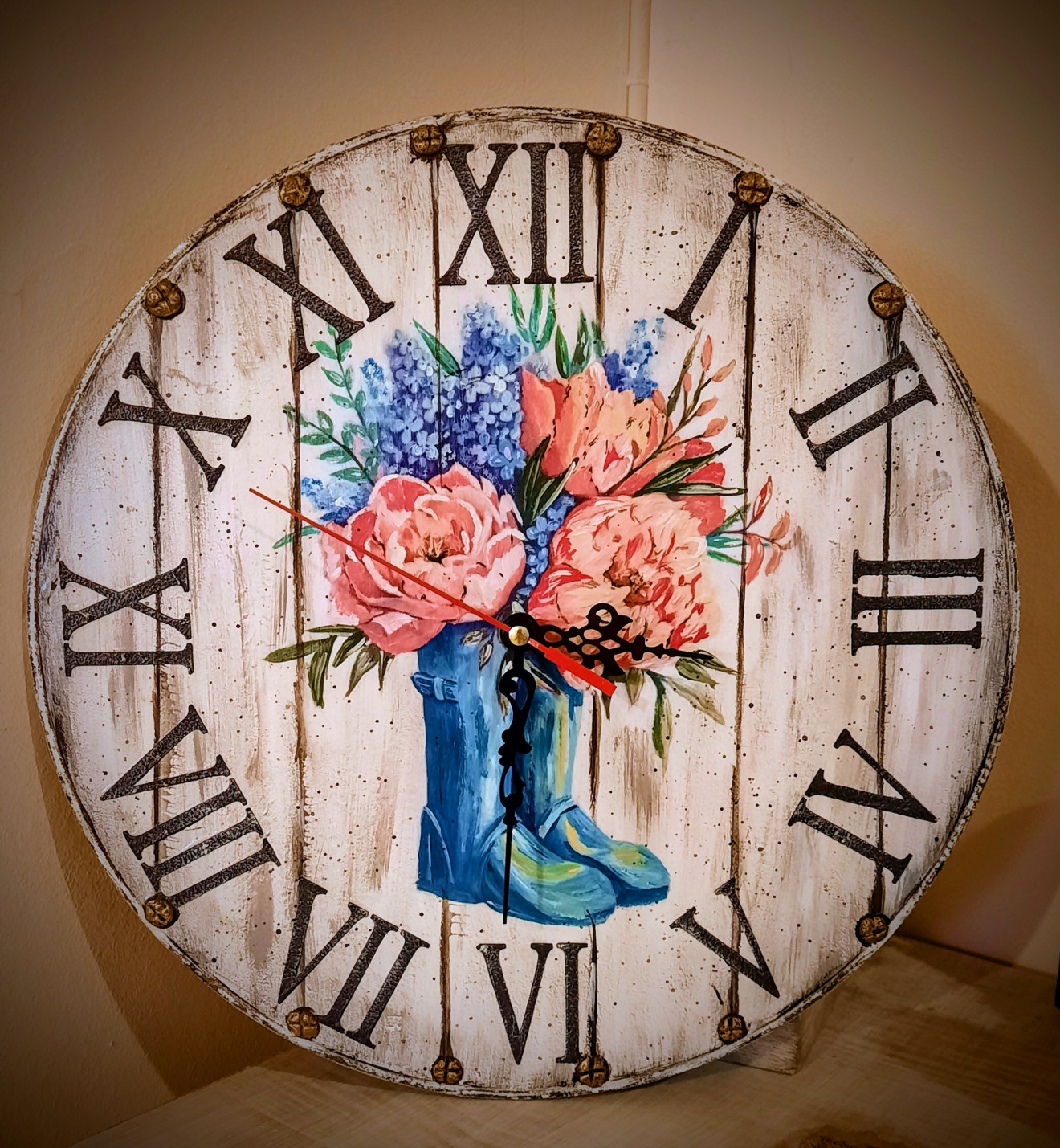 Един страхотен стенен часовник с безшумен механизъм. Използвани материали акрилни бои, малко глина, структурна паста за направата на цифрите и лак за завършек. Диаметър на часовника 30 см. Наличен!
