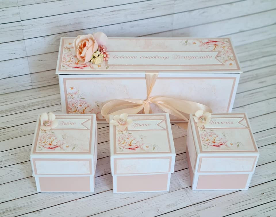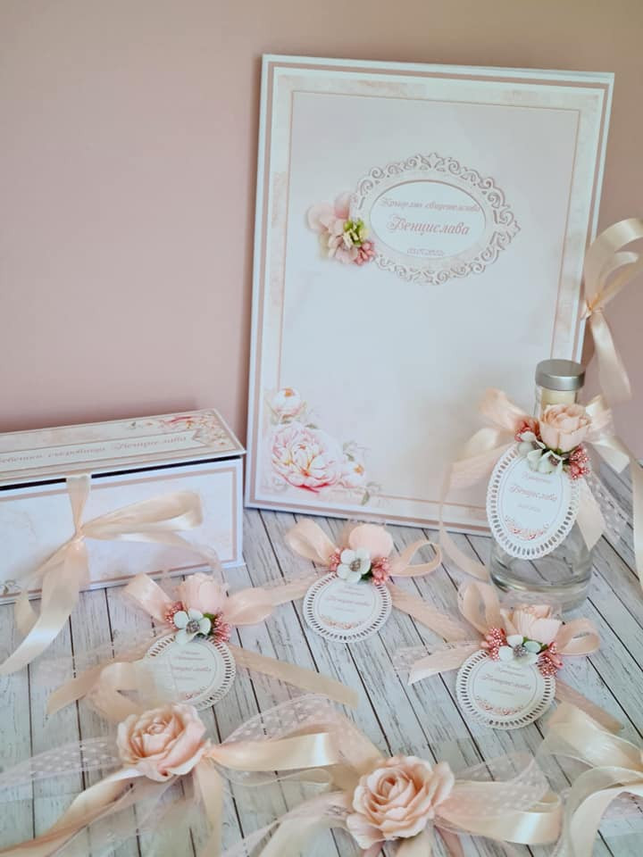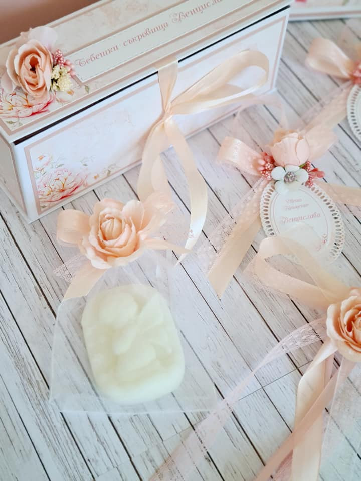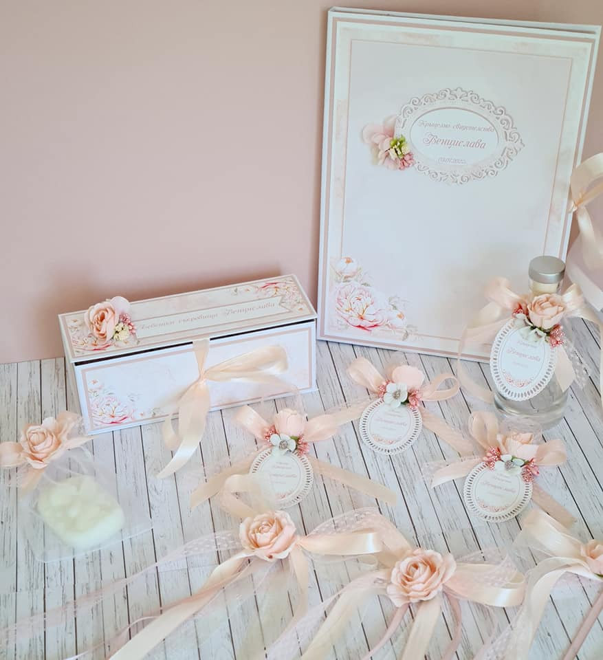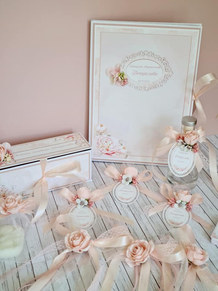 ??Комплект за кръщене нежно бяло, праскова и екрю. ?? Комплектът съдържа: ?Папка за кръщелно свидетелство ?Шише за светена вода с украса ?голяма кутия за бебешки съкровища, съдържаща 3 бр кутийки за косичка, кръстче, пъпче. ?Украси за свещи ?Украси за бутилки ?Сапунче с украса ? Етикети за бутилки- персонализирани #craftytreasuresstudio #кръщение #кръщене #бебешкиподарък #празник #светокръщение #ръчнаизработка #комплекти