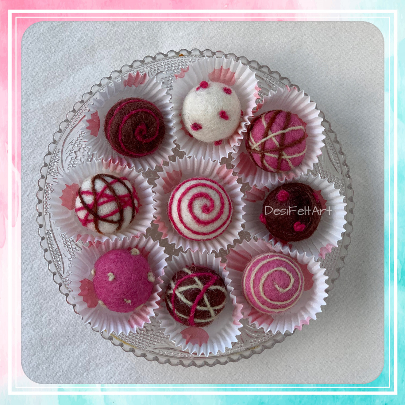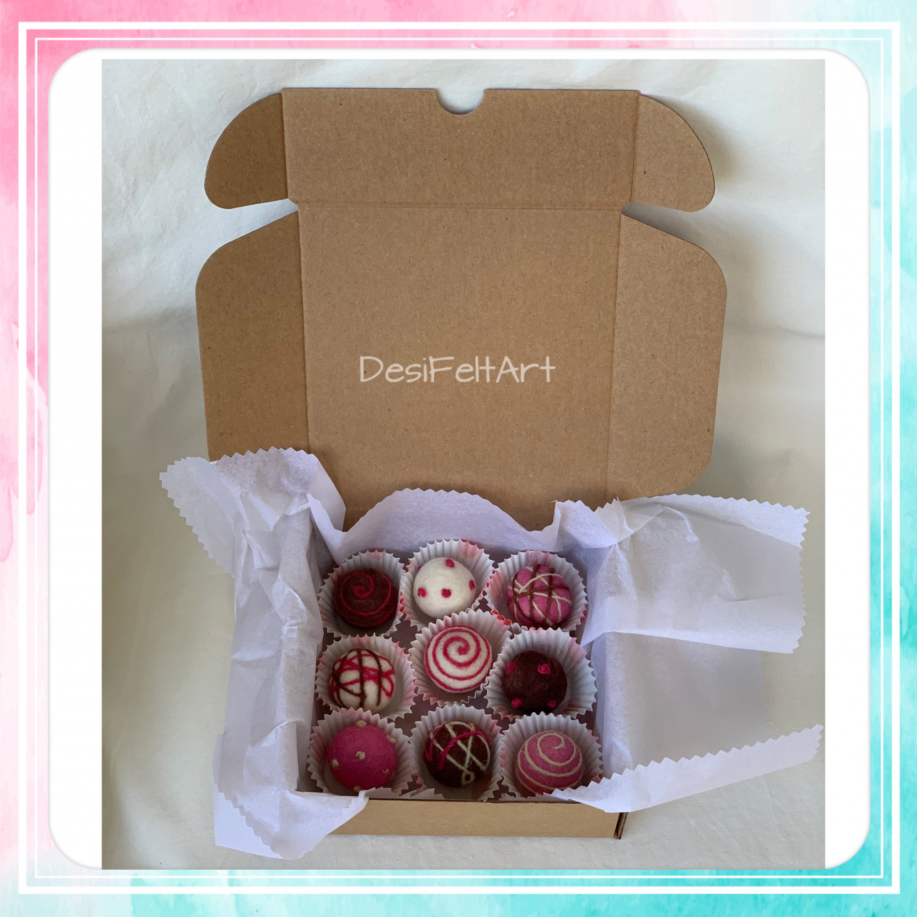 Бонбоните са чудесен подарък - различен и закачлив жест за всеки повод 😋 Не се топят и не свършват, винаги ще са до Вас 😀 Ръчно изработени от 100% българска вълна, чрез смесена техника (сухо и мокро плъстене). Размери около 3см (диаметър) Могат да бъдат изработени и в цветове по Ваша идея. Цената е за кутия от 9 броя бонбони