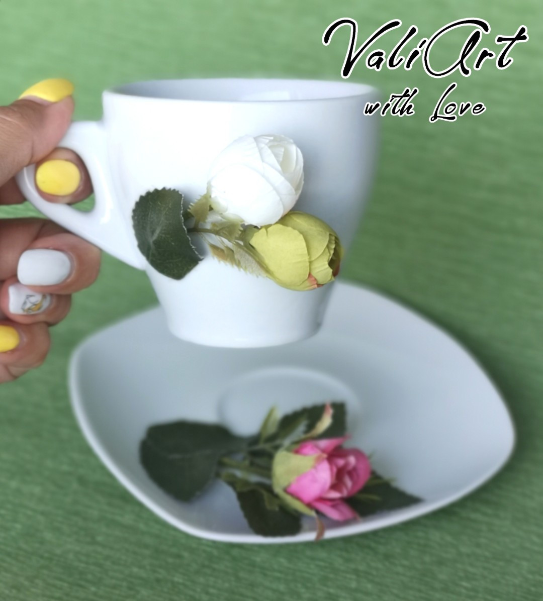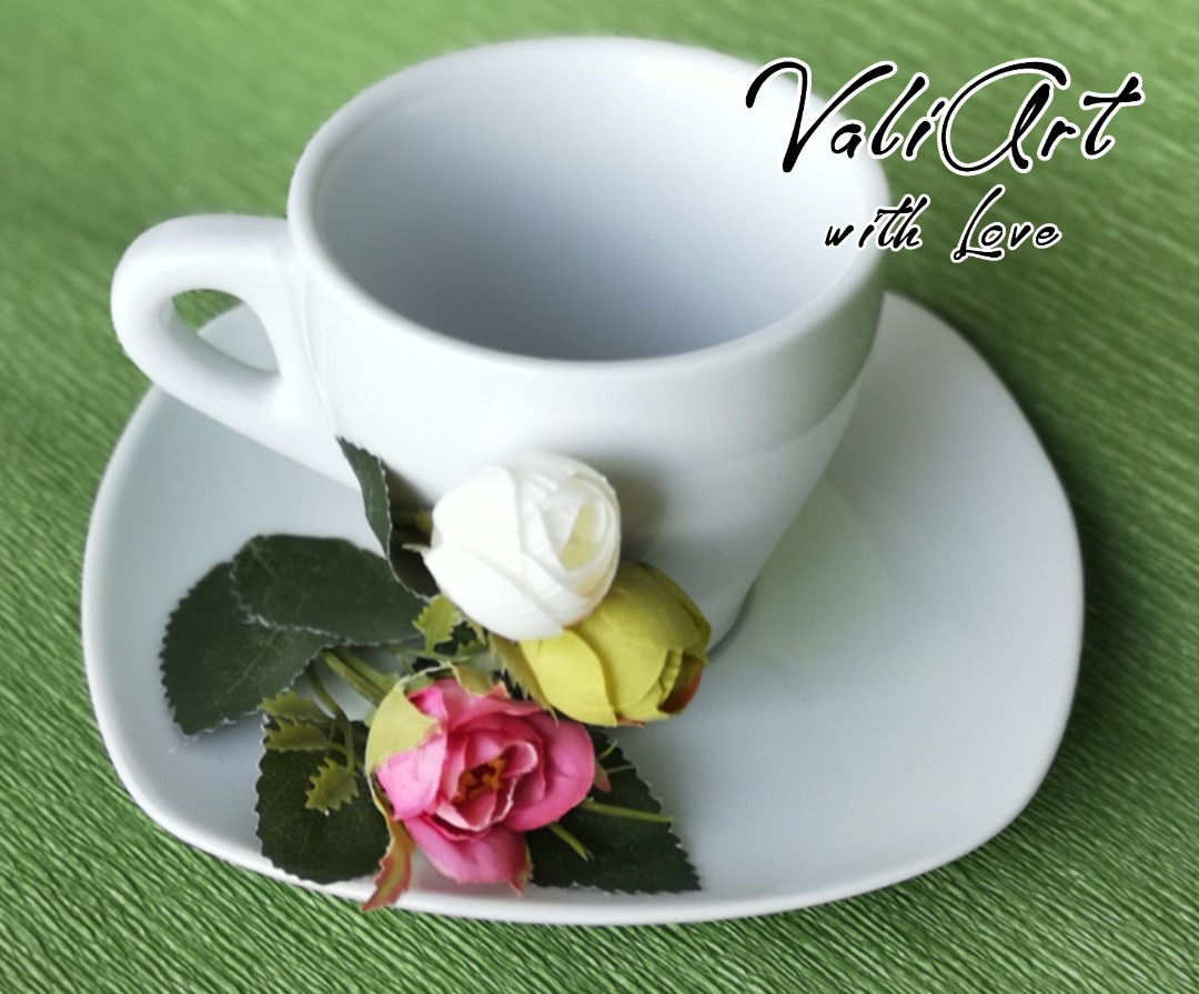 Порцеланов комплект декорирани с водоустойчиви цветя чаша за чай или кафе с чинийка. Може да бъде изработен с различна декорация.