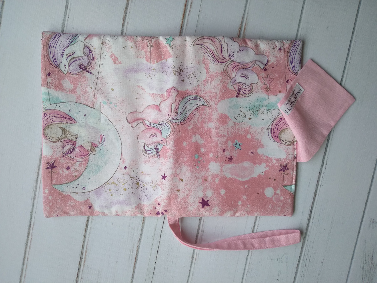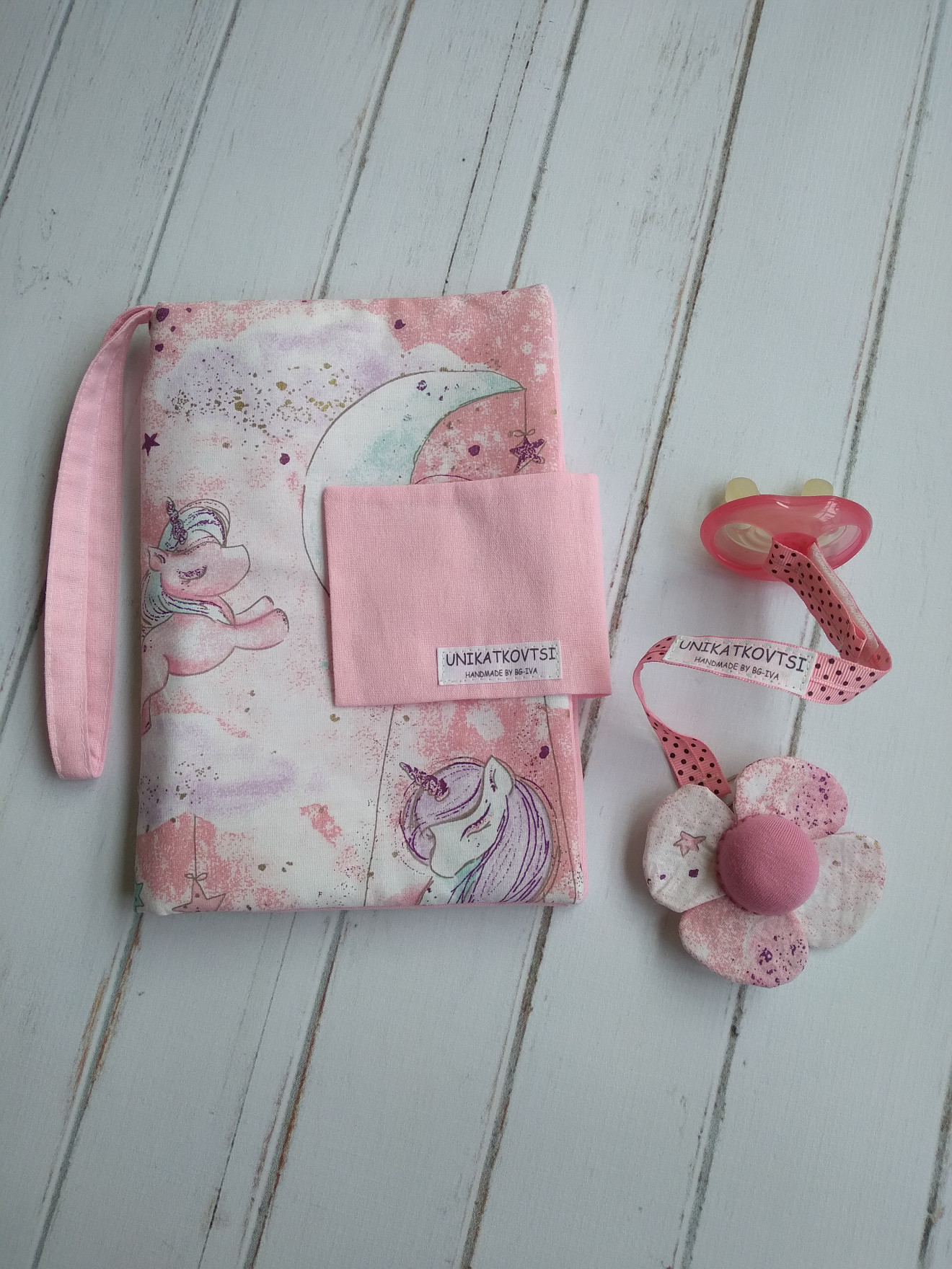 Органайзер с 4 отделения- 1 за мокри кърпи, 2 за пелени/памперси и 1 с цип за по-дребни необходимости по време на разходка. Има удобна дръжка за носене. Изработен от памучни платове, подплатен с вата. Клипс за биберон/залъгалка Възможност за изработка в различни десени