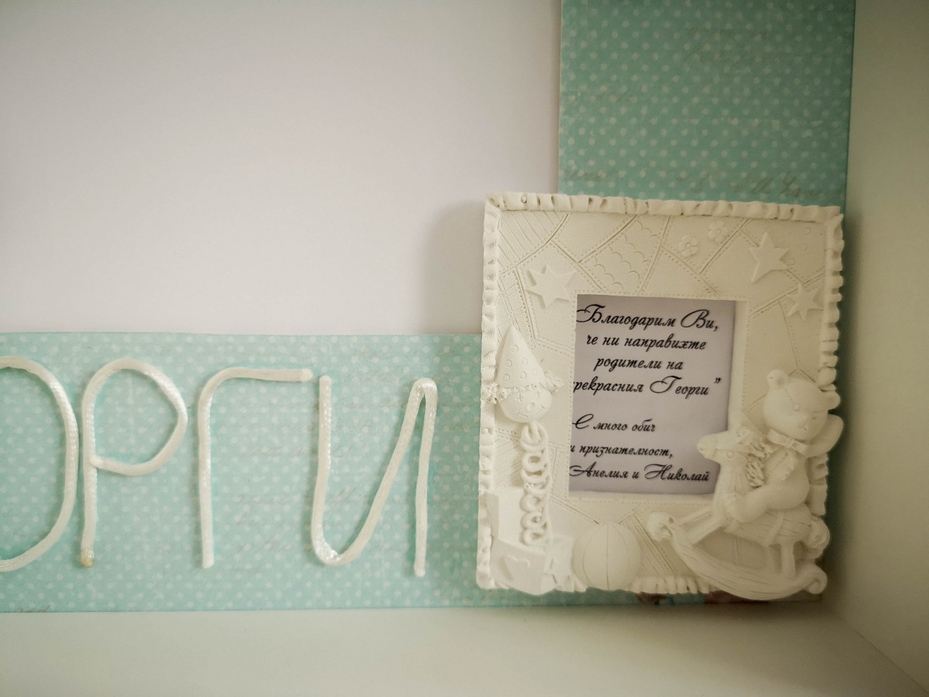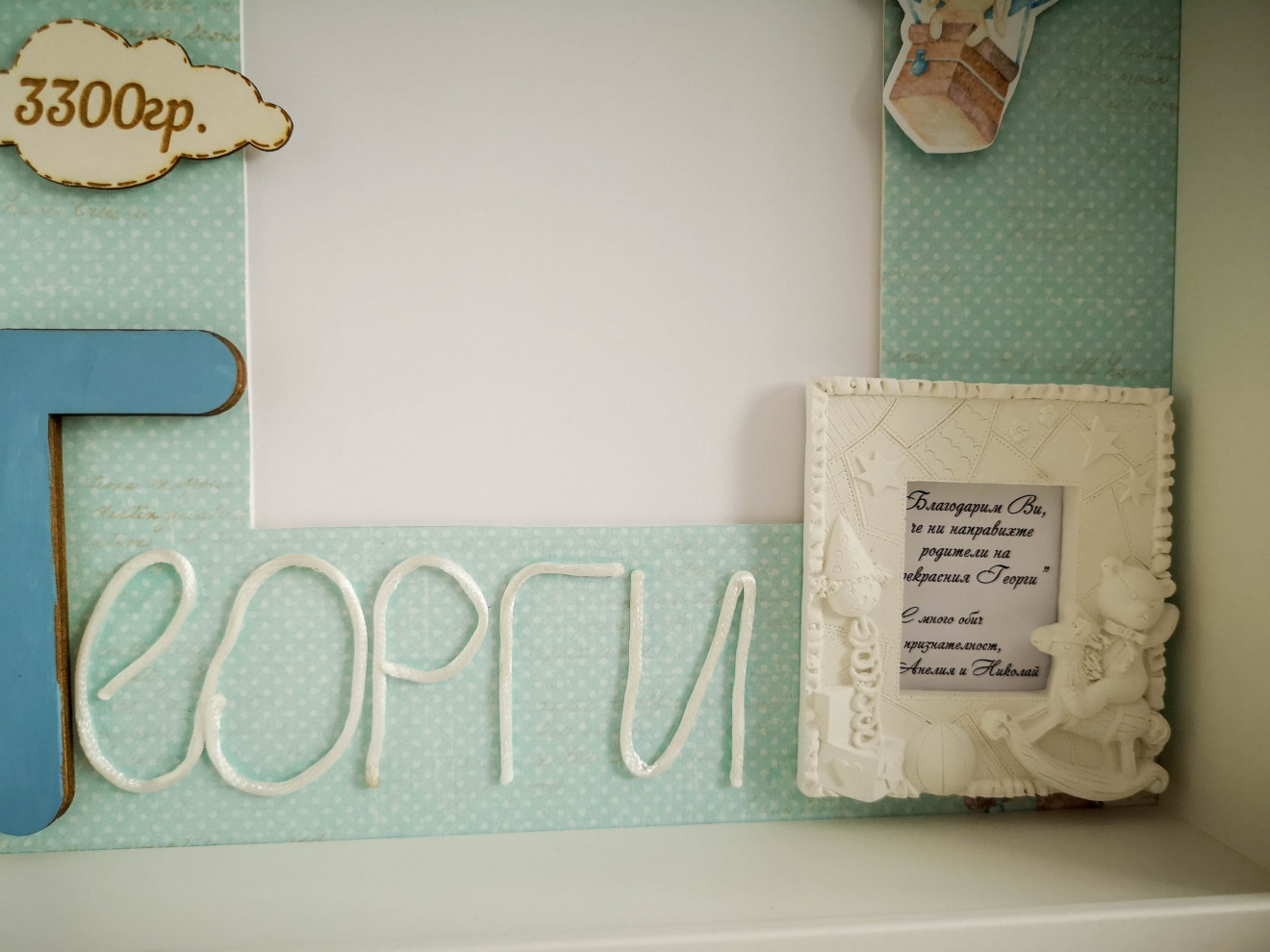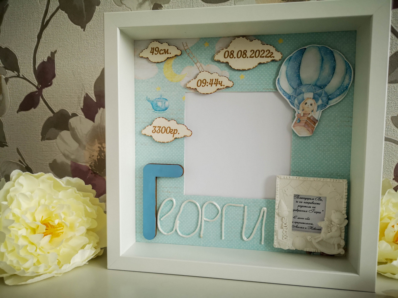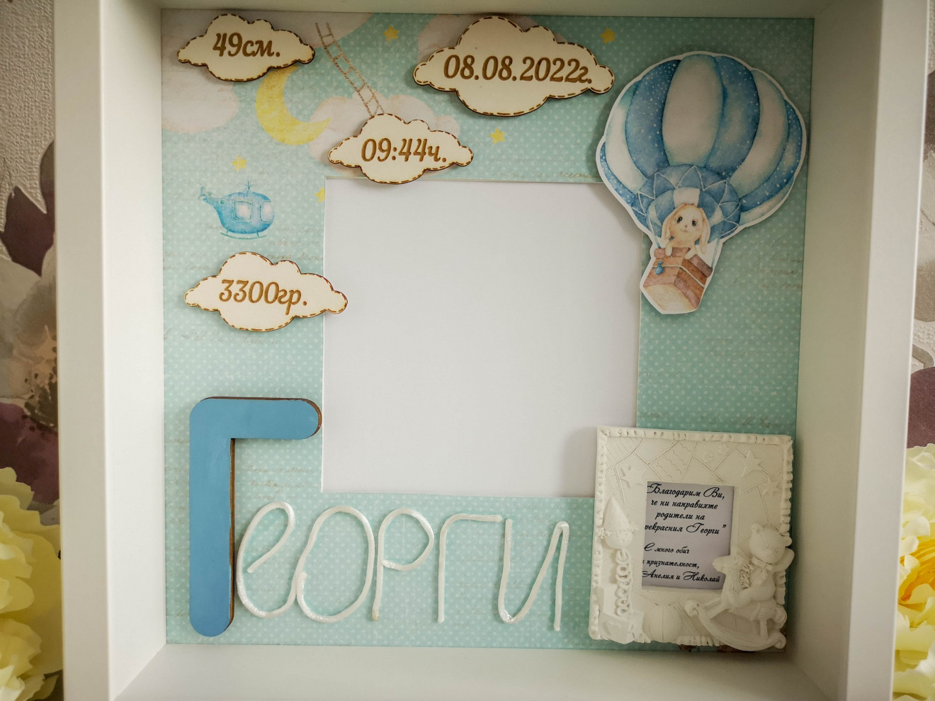 Рамка за снимка бебешка визитка. Ръчно изработени, оригинални и персонализирани рамки с данните около раждането на бебето. Прекрасен спомен и сигурен начин да запазите този неповторим момент за поколения напред. Размер на рамката 25х25х5см. Може да се комбинира в комплект с: - клипс за биберон - кутия за съкровища - албум - пачуърк одеало - торта от памперси - картички и експлодиращи кутии Изработвам по поръчка в рамките на 3 дни. Обявеният срок е ориентировъчен и варира в зависимост от моментната ми натовареност. При интерес, пишете ми или се обадете на посочения телефон. Заповядайте и да разгледате още от моите творения за бебета и деца на страницата ми https://facebook.com/HandmadeByYasnaBozhinova/