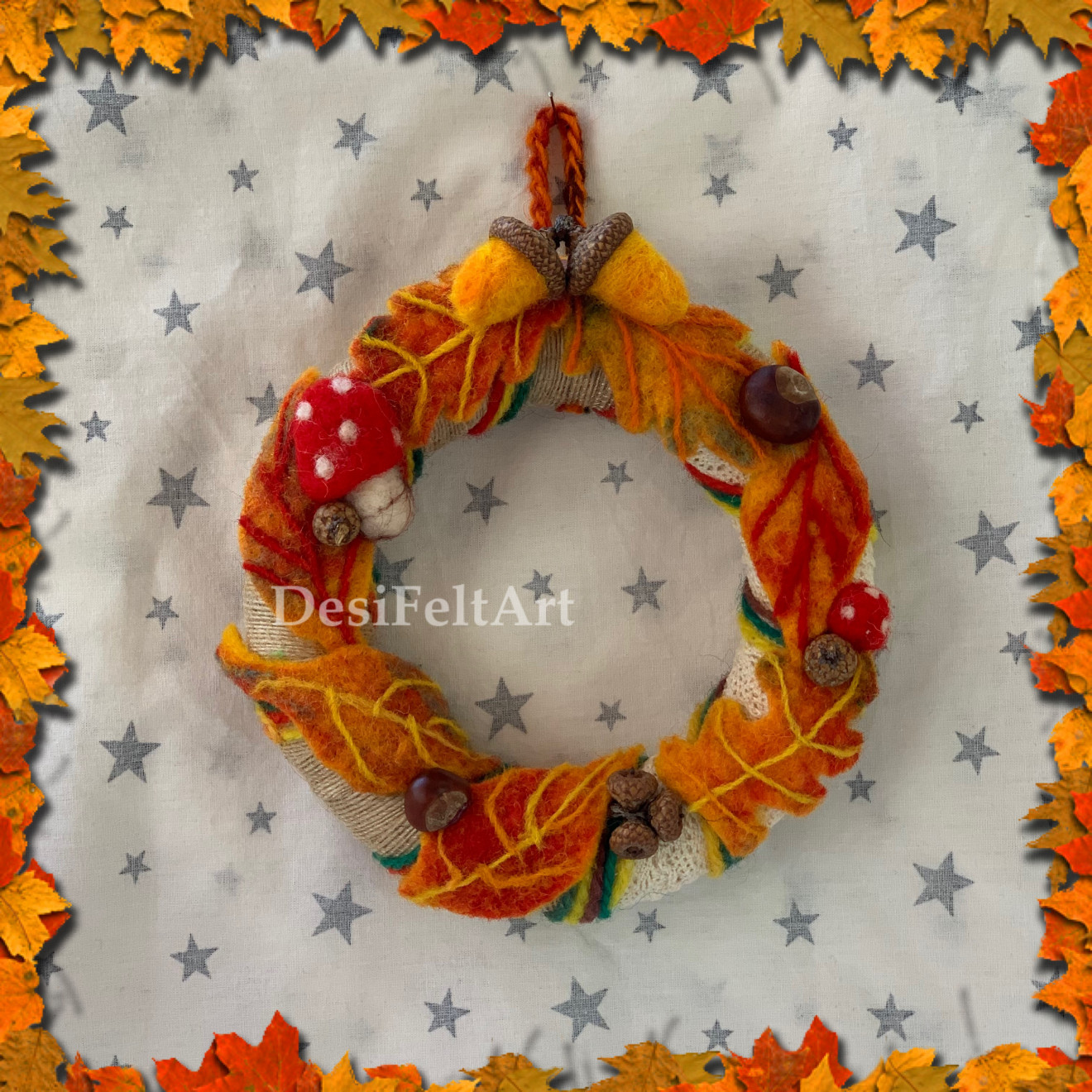 Ръчно декориран венец с размери 15см (диаметър). Листата, жълъдите и гъбките са изработени от вълна, чрез техника сухо и мокро плъстене. Използвала съм и вълнена прежда, зебло и натурални елементи (кестени и шапчици от жълъдчета) . Основата е обръч от стиропор. Да поканим красивите багри на есента в домовете си :)