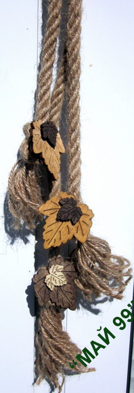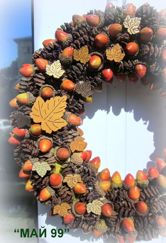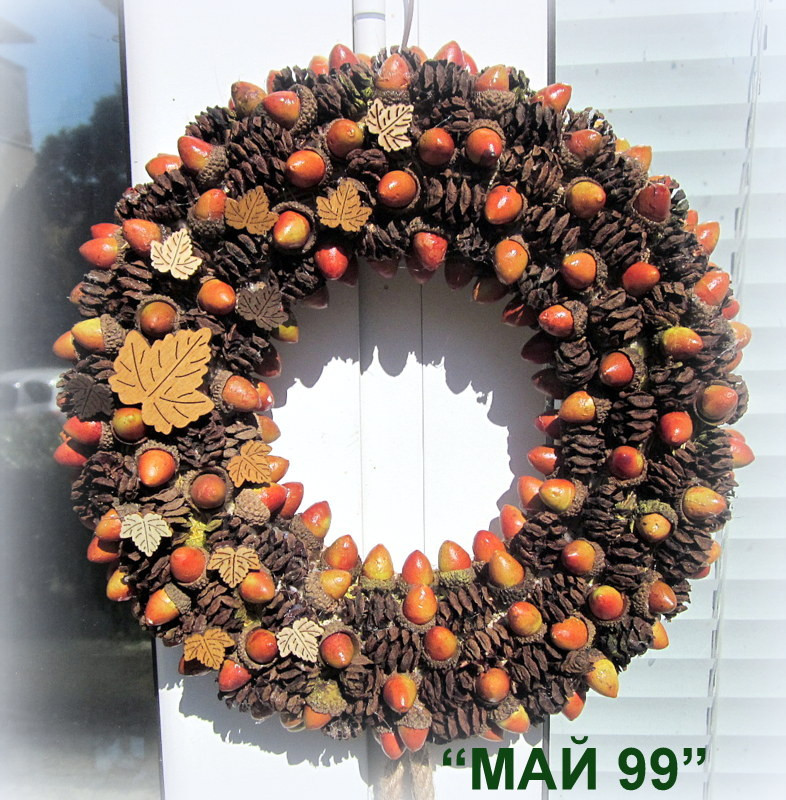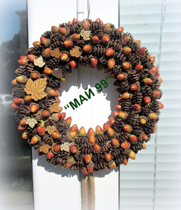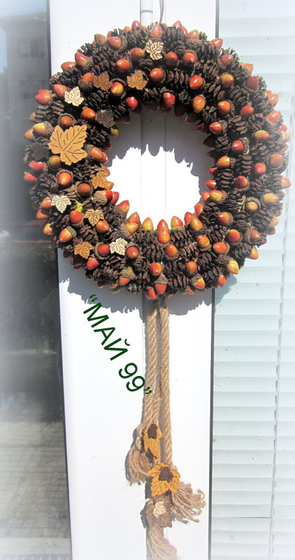 Ръчно изработен венец ф 28 см. с жълъди и мини шишарки/ подредени шахматно/като мъниста,дървени листа различни големини и висящо въже с листа. Обща дължина 58 см. Чудесен,много различен венец за всички сезони!