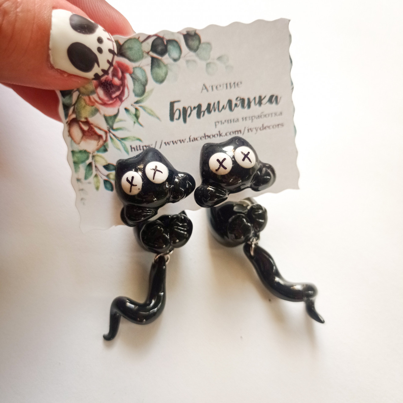 Обеци от полимерна глина и бижутерска смола Черната котка Изцяло ръчно изработени обеци. С вграден пин и с вграден винт от стомана. Тялото седи зад ухото и в него е вграден щифта. Как стоят на ухо може да видите тук: https://www.tiktok.com/@ivydecore/video/7149410993364339973 Размерите са приблизителни, всеки чифт е уникален ?