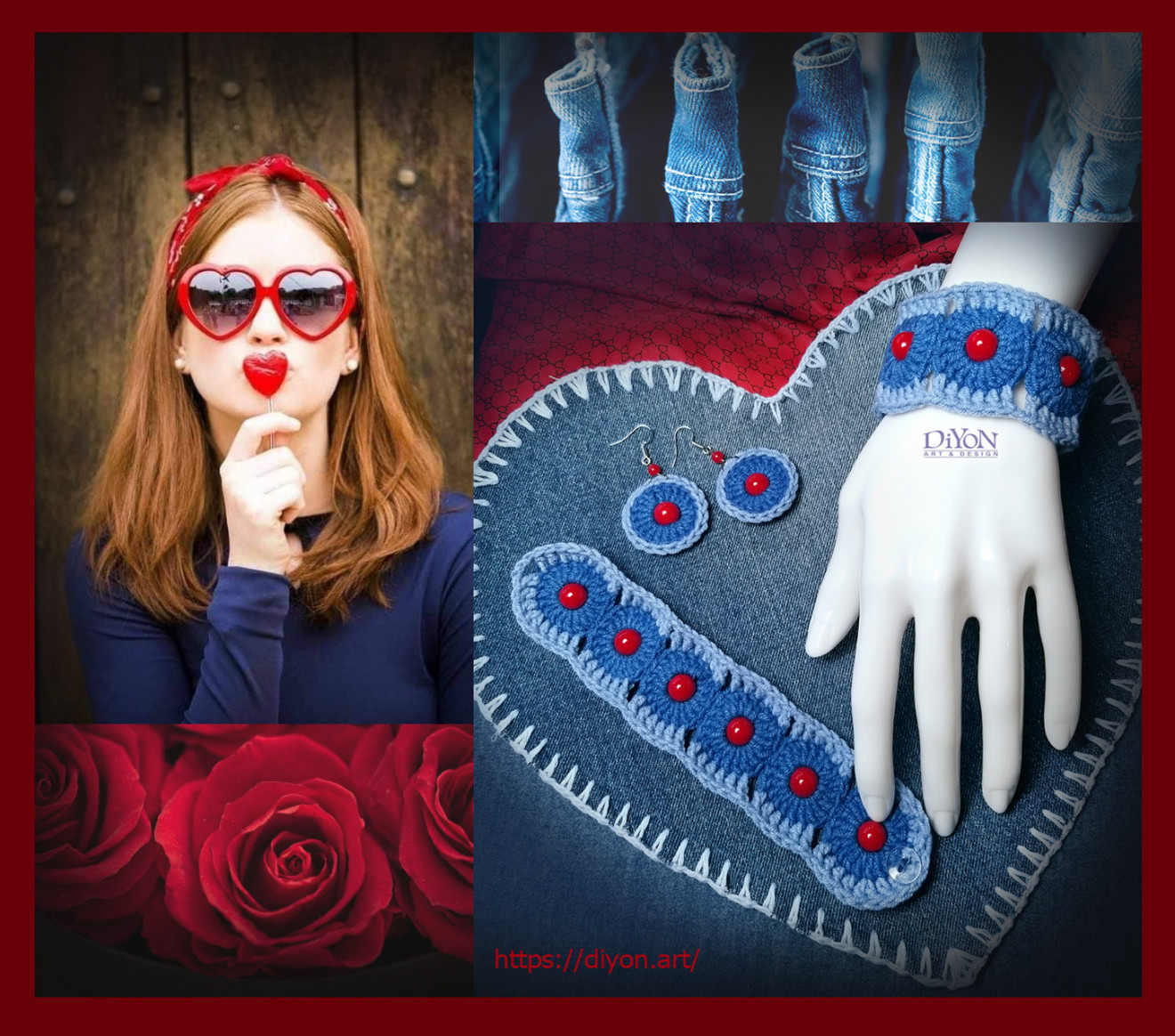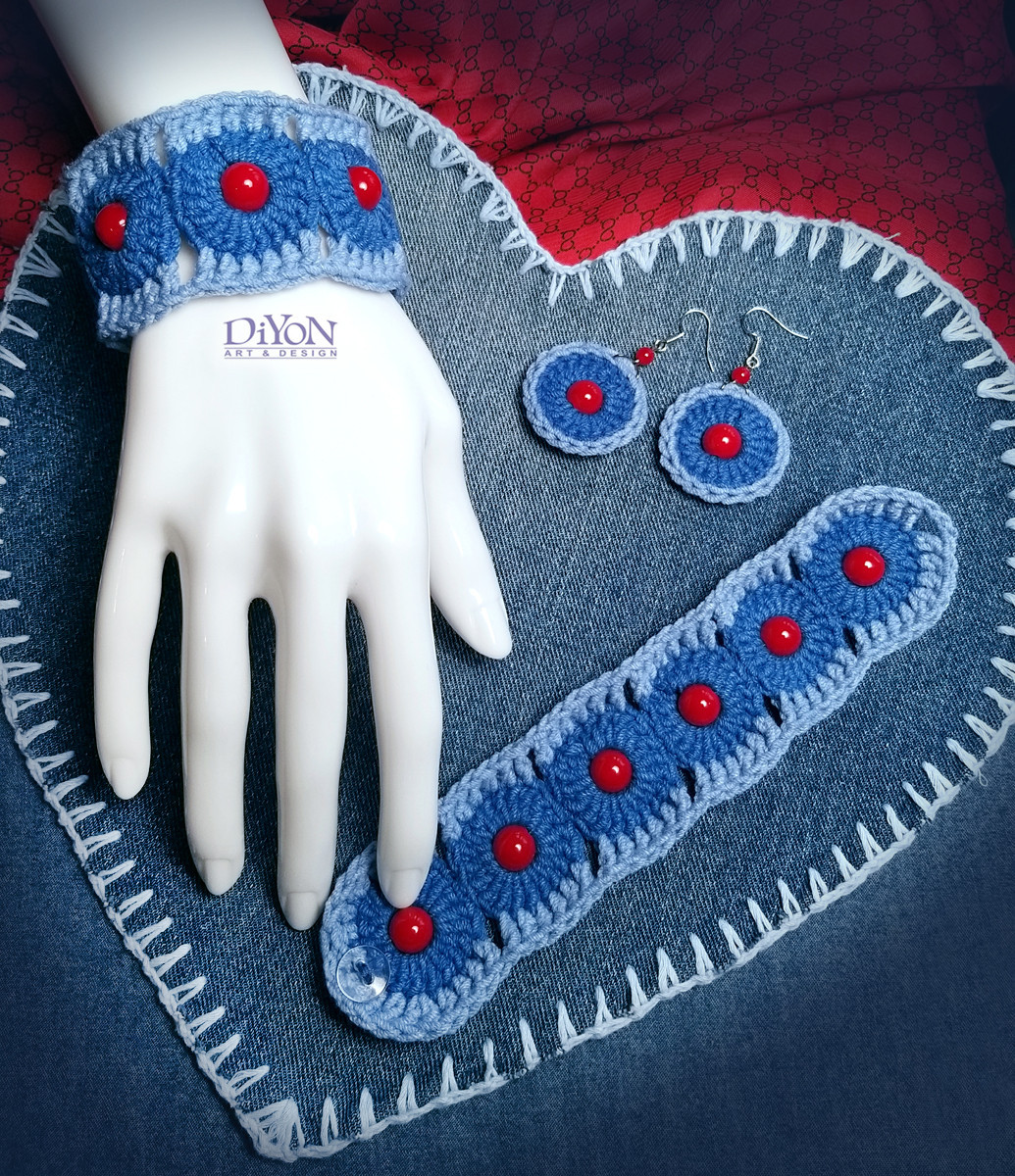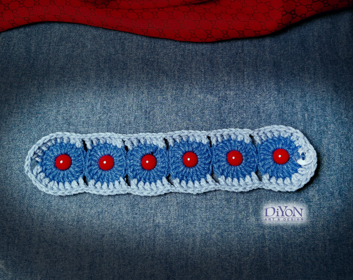 Плетена на една кука дамска гривна, памук и акрил. Два вида синьо, декорирано с червени мъниста.