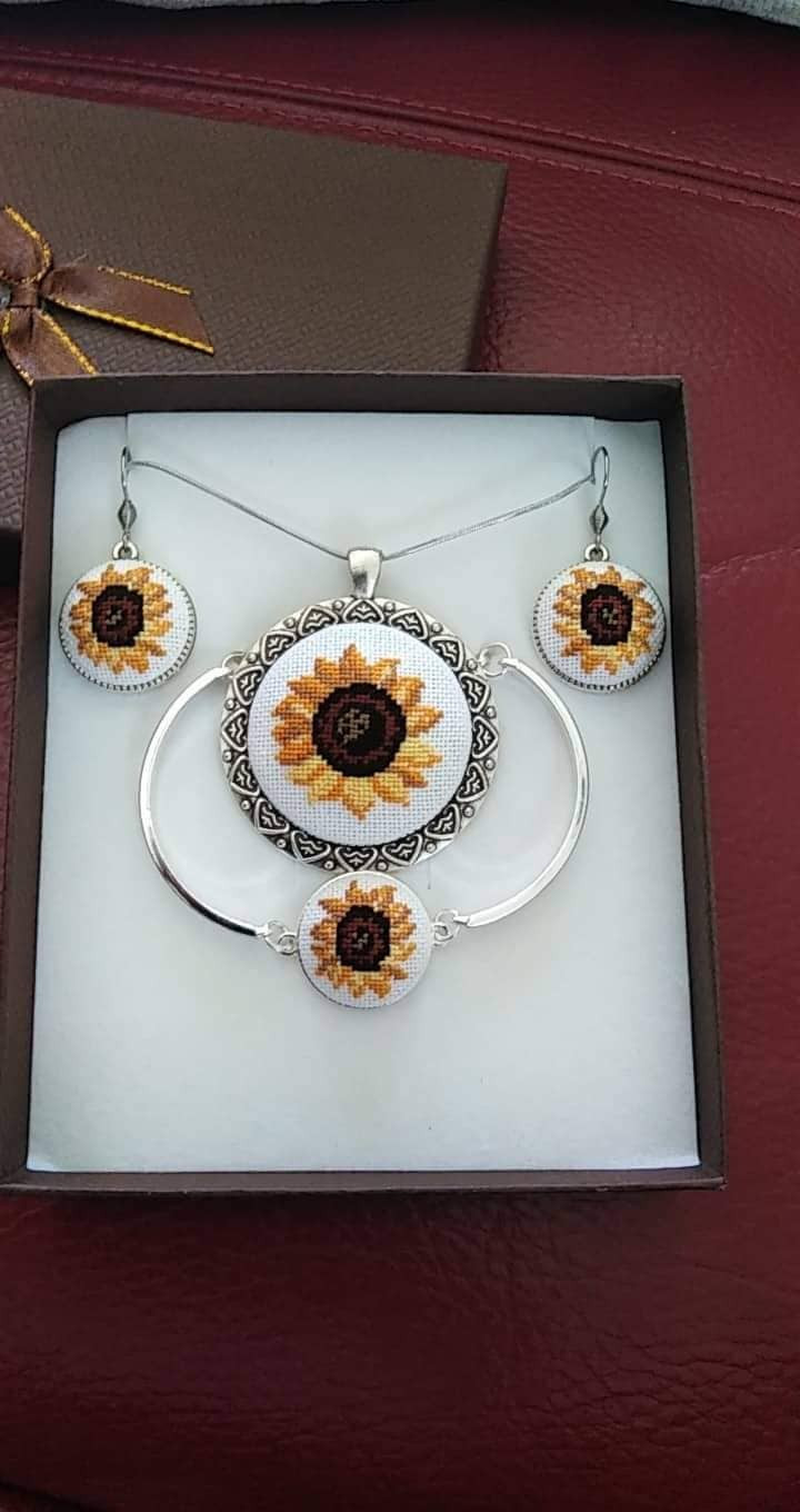 Комплект бижута със слънчогледи ръчна бродерия върху бяла панама. Изработени са върху 28 каунт бяла памучна панама с висококачествени памучни конци. Основата на медальона е цинкови сплави,а гривната,синджирчето и накрайниците за обеци са медицинска стомана.