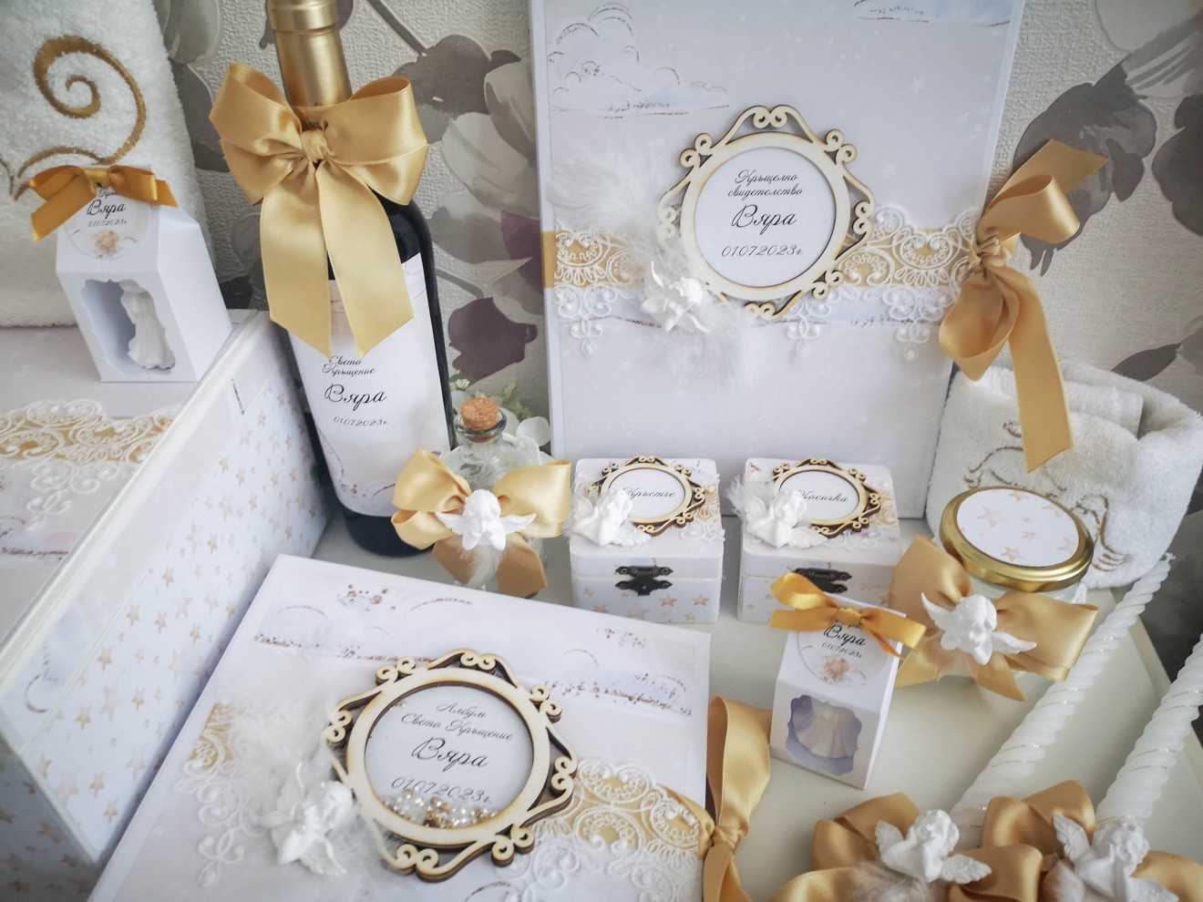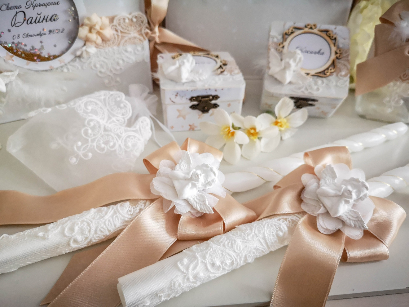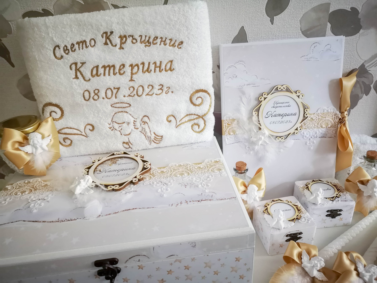 Комплект за кръщене "Ангели", в бежаво, златно и ангелчета, в декорацията още дантела, пера, цветя, керамични фигурки и сатенена панделка. Може да се изработи в различен цвят и сходна декорация, както за момиче, така и за момче. Комплектът се състои от: ?Папка за кръщелно свидетелство ?Малка дървена кутийка за кръстче ?Малка дървена кутийка за косичка ?Комплект ритуални свещи 40см. ?Бурканче за мед ?Шишенце за олио ?Шишенце за светена вода ?Торбичка със сапунче ?Комплект голяма и малка кърпи с бродерия Към него могат да се направят още - голяма дървена кутия съхранение 35х25х15см., книга за пожелания, кутия за пари, бутилка ритуално вино, кърпа за кръстниците, албум за съхранение на снимките от кръщенето, покани за гостите, подаръци за гостите, етикети и др. Изработвам по поръчка в рамките на 14-21 дни. Обявеният срок е ориентировъчен и варира в зависимост от моментната ми натовареност. При интерес, пишете ми или се обадете на посочения телефон. Заповядайте и да разгледате още от моите творения за бебета и деца на страницата ми https://www.facebook.com/ArtelinaByYasnaBozhinova