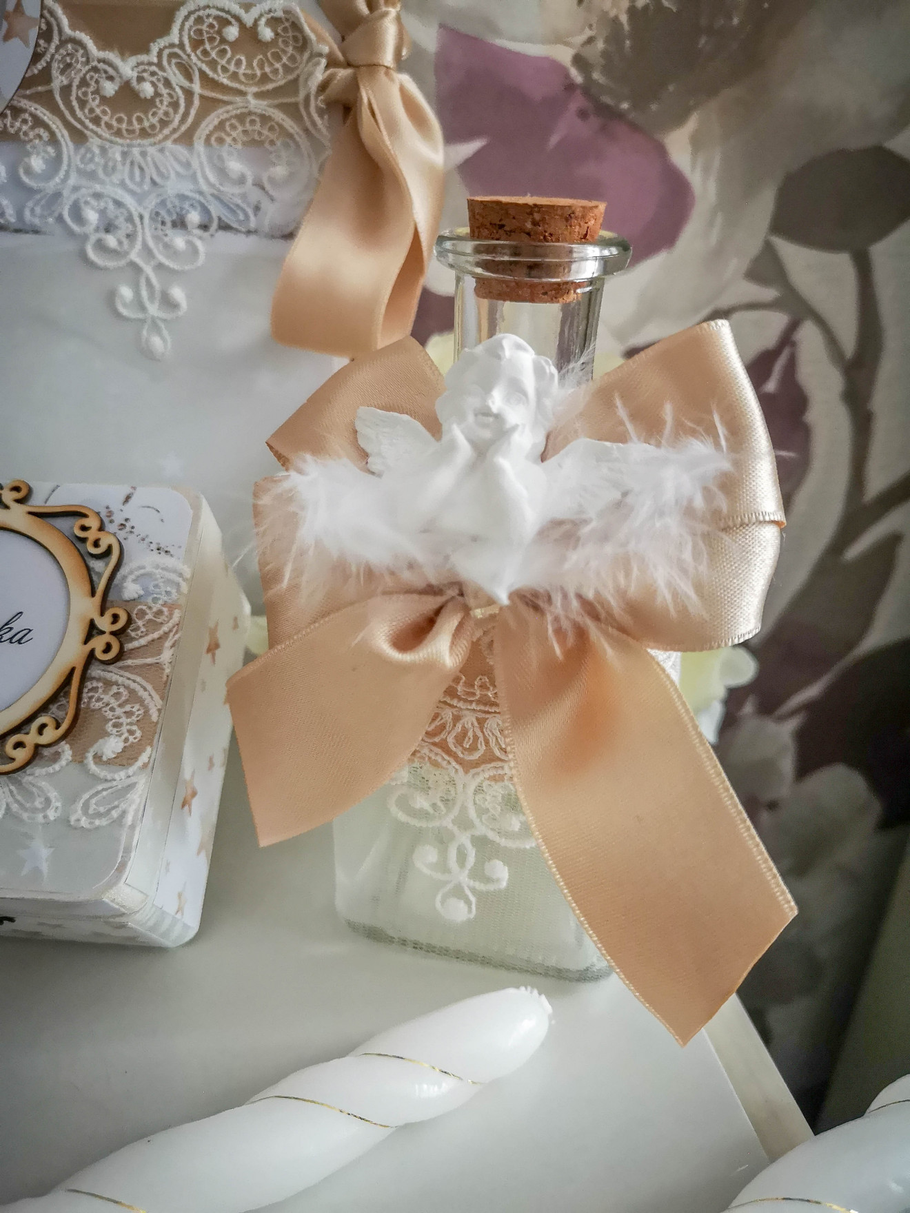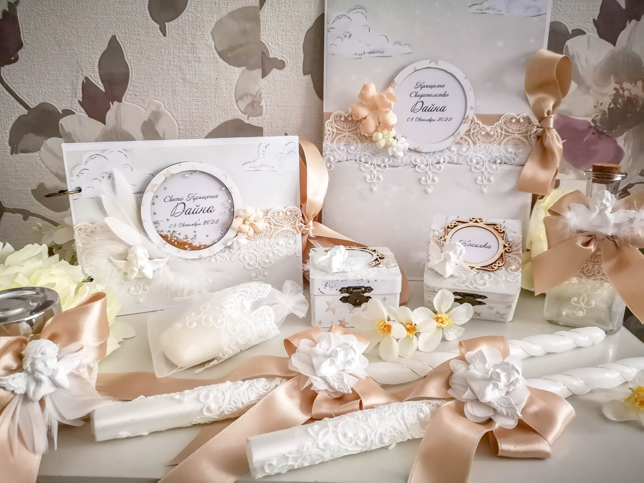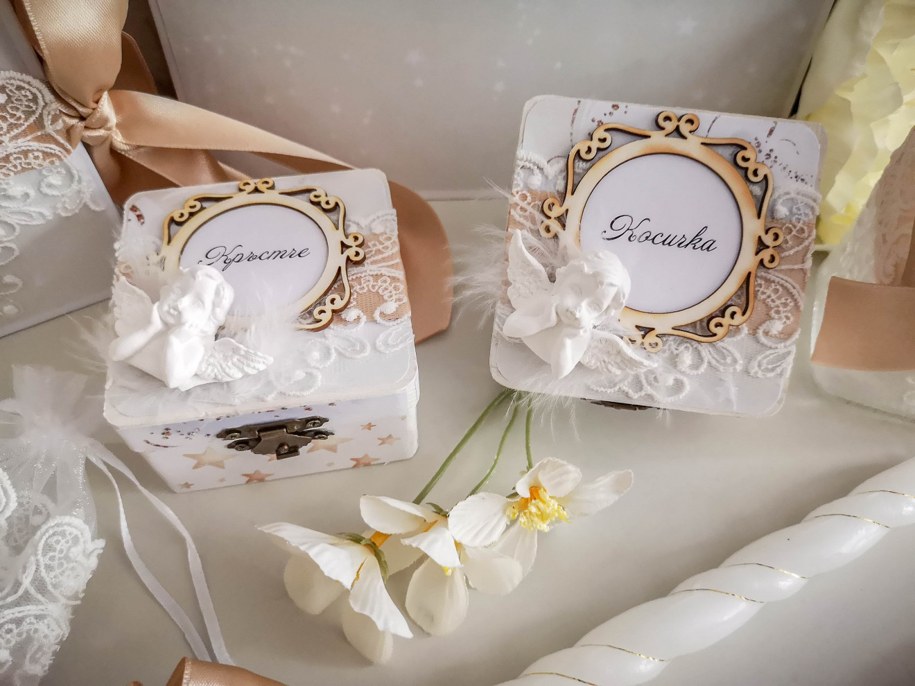 Комплект за кръщене "Ангели", в бежаво, златно и ангелчета, в декорацията още дантела, пера, цветя, керамични фигурки и сатенена панделка. Може да се изработи в различен цвят и сходна декорация, както за момиче, така и за момче. Комплектът се състои от: ?Папка за кръщелно свидетелство ?Малка дървена кутийка за кръстче ?Малка дървена кутийка за косичка ?Комплект ритуални свещи 40см. ?Бурканче за мед ?Шишенце за олио ?Шишенце за светена вода ?Торбичка със сапунче ?Комплект голяма и малка кърпи с бродерия Към него могат да се направят още - голяма дървена кутия съхранение 35х25х15см., книга за пожелания, кутия за пари, бутилка ритуално вино, кърпа за кръстниците, албум за съхранение на снимките от кръщенето, покани за гостите, подаръци за гостите, етикети и др. Изработвам по поръчка в рамките на 14-21 дни. Обявеният срок е ориентировъчен и варира в зависимост от моментната ми натовареност. При интерес, пишете ми или се обадете на посочения телефон. Заповядайте и да разгледате още от моите творения за бебета и деца на страницата ми https://www.facebook.com/ArtelinaByYasnaBozhinova