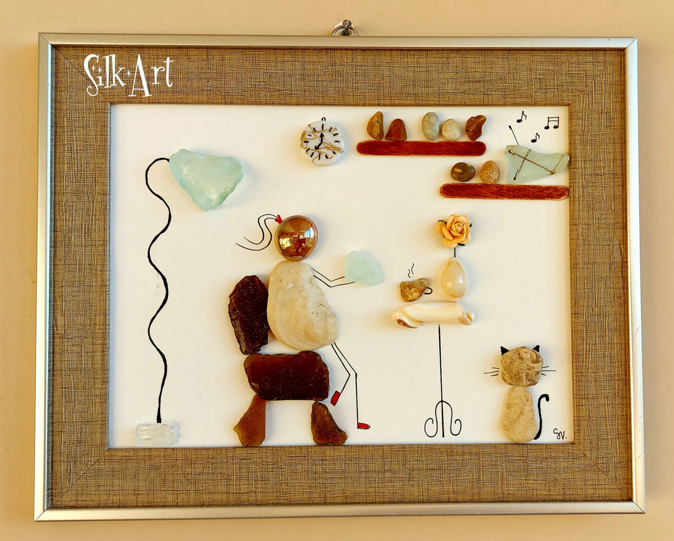 Пано "Дамата с книгите" е с размер 25/20 см. Декорация с морски камъчета и стъкълца.