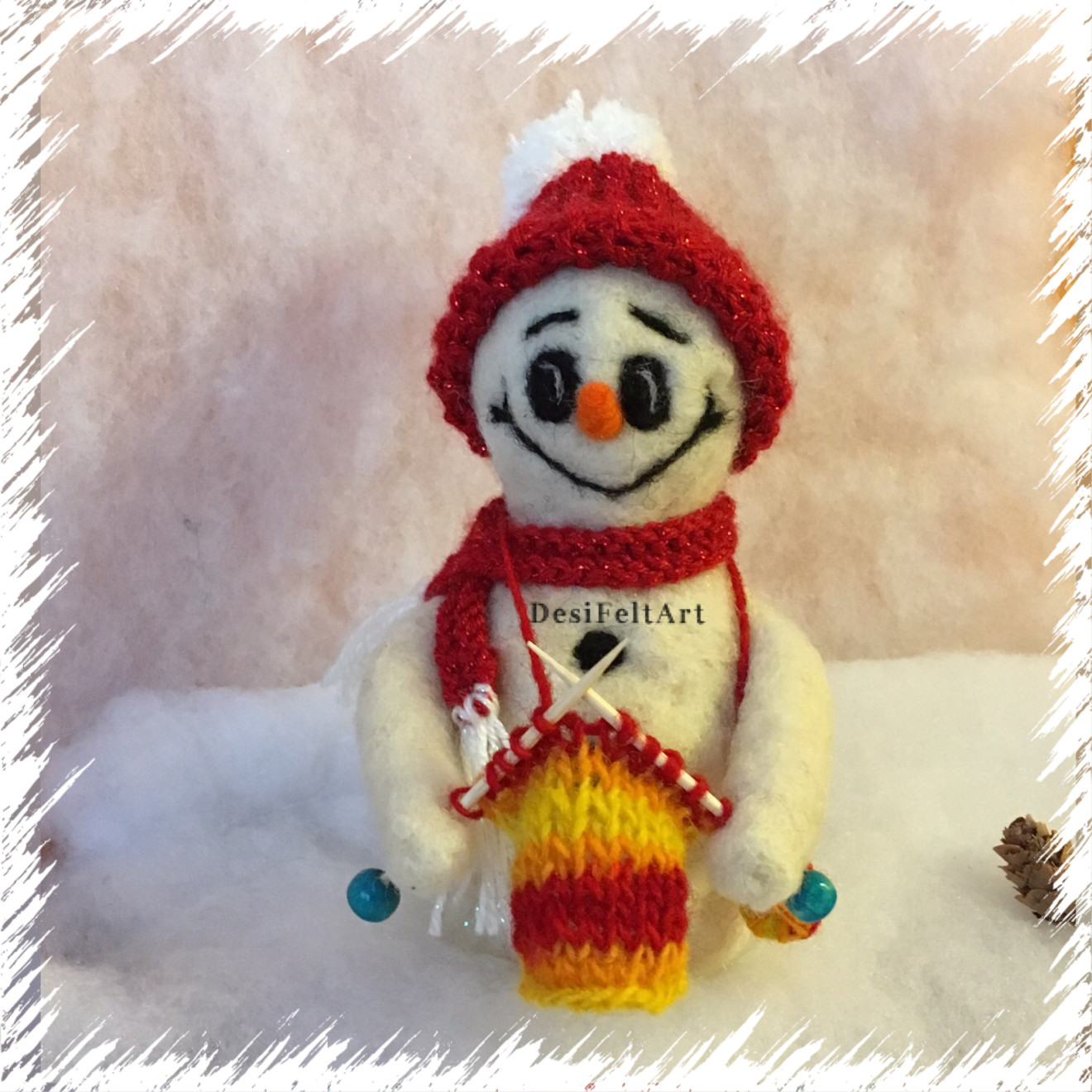Ръчно изработена играчка от вълна, чрез техника - иглонабиване (сухо плъстене). Шапката и шала са изплетени на ръка и могат да се махат Размери - около 13см (с шапката). Подходящ подарък за всички почитатели на плетивото ;)