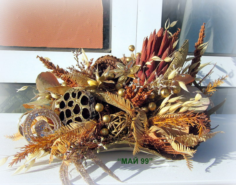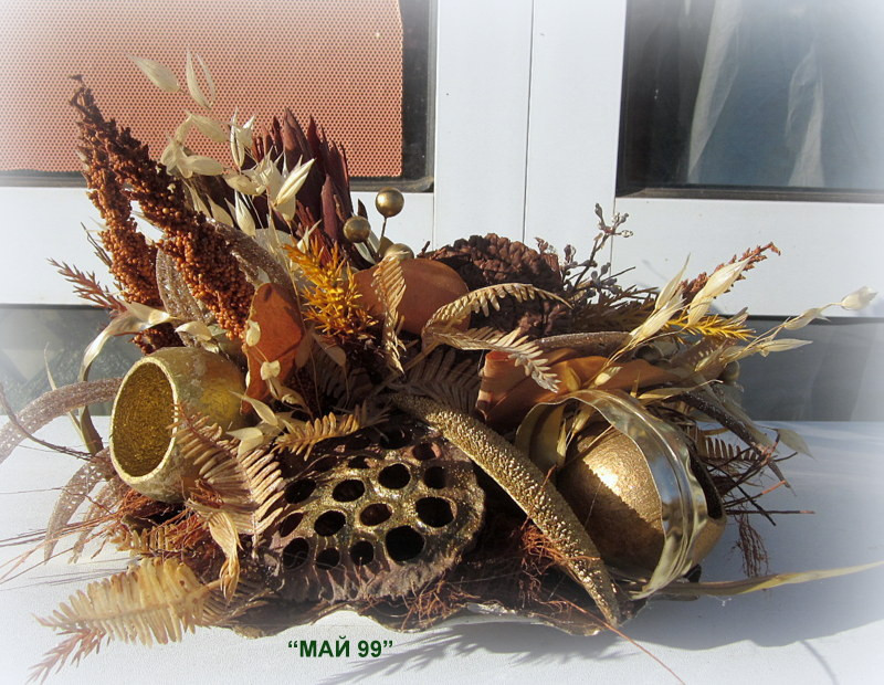 Ефектна и елегантна аранжировка на керамично/кафяво/листо с сухи треви и елементи,изкуствени /златни/клонки и папрат,лотос,еленови рога,бел къп златен и натурал,кокосови влакна и мини златни топчета с размери 30/25/20 см.височина.