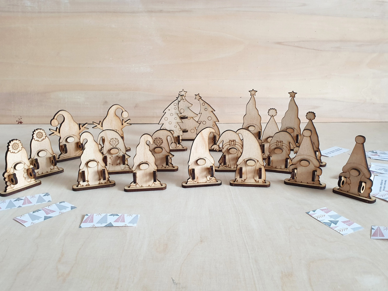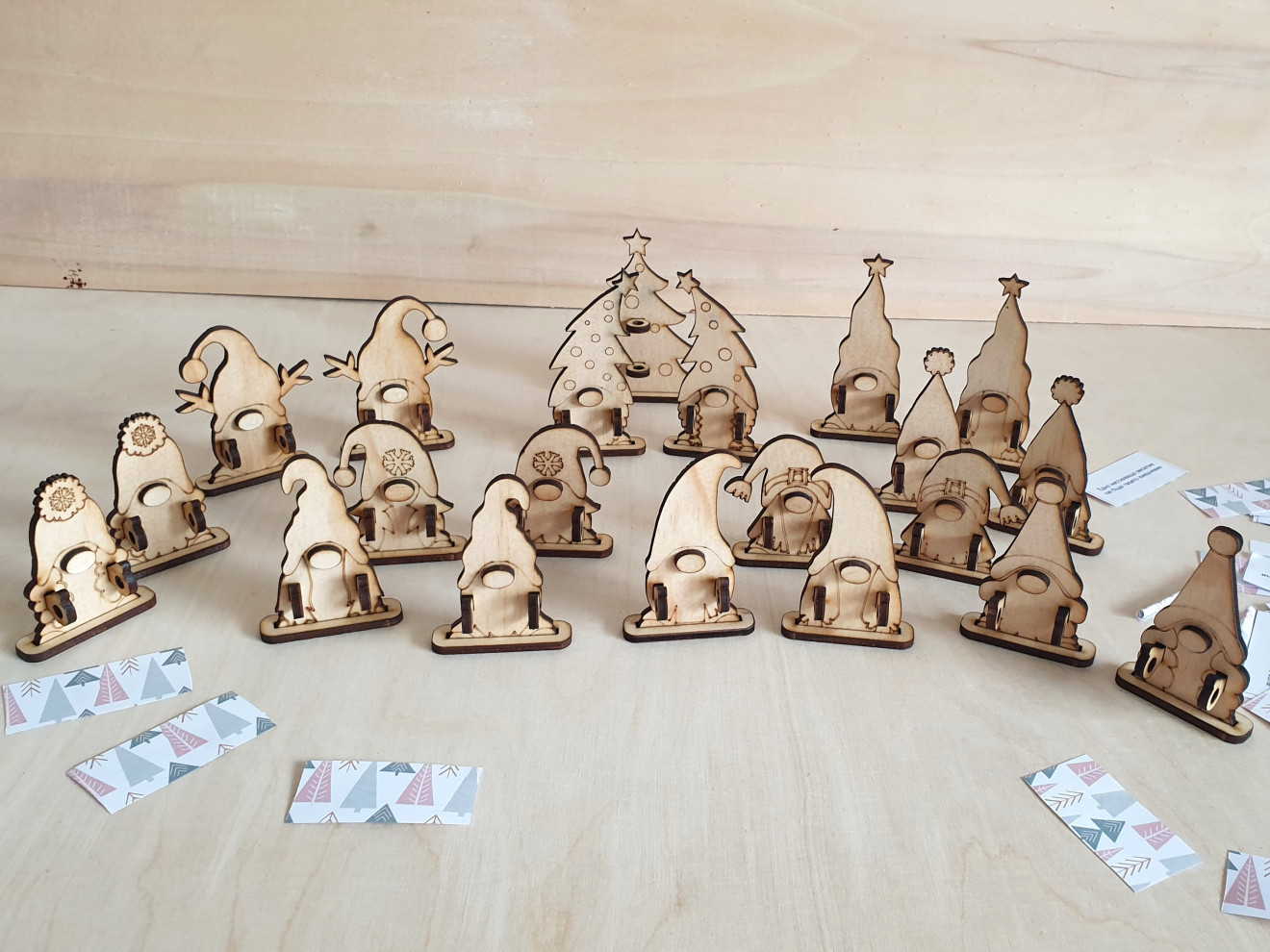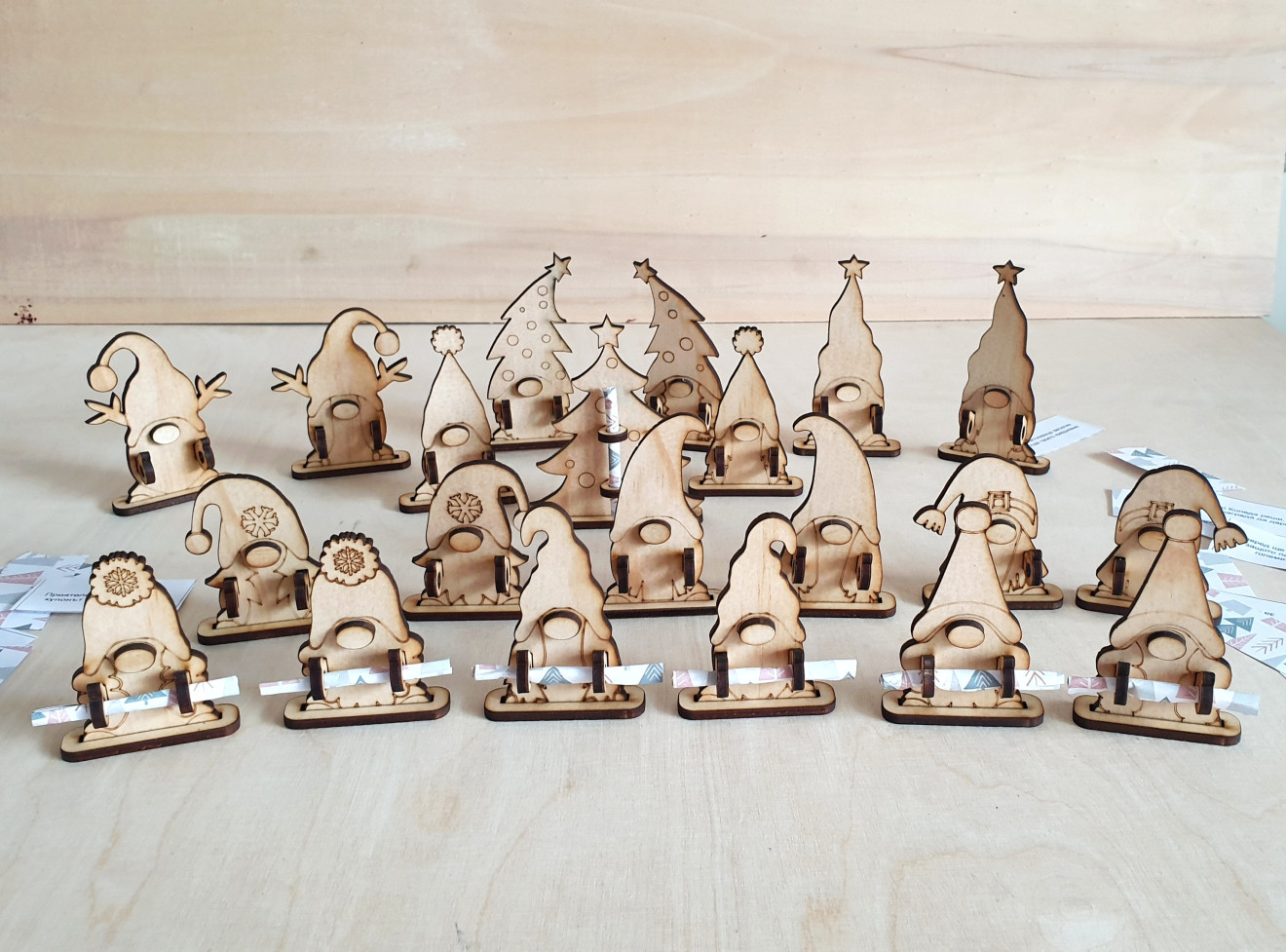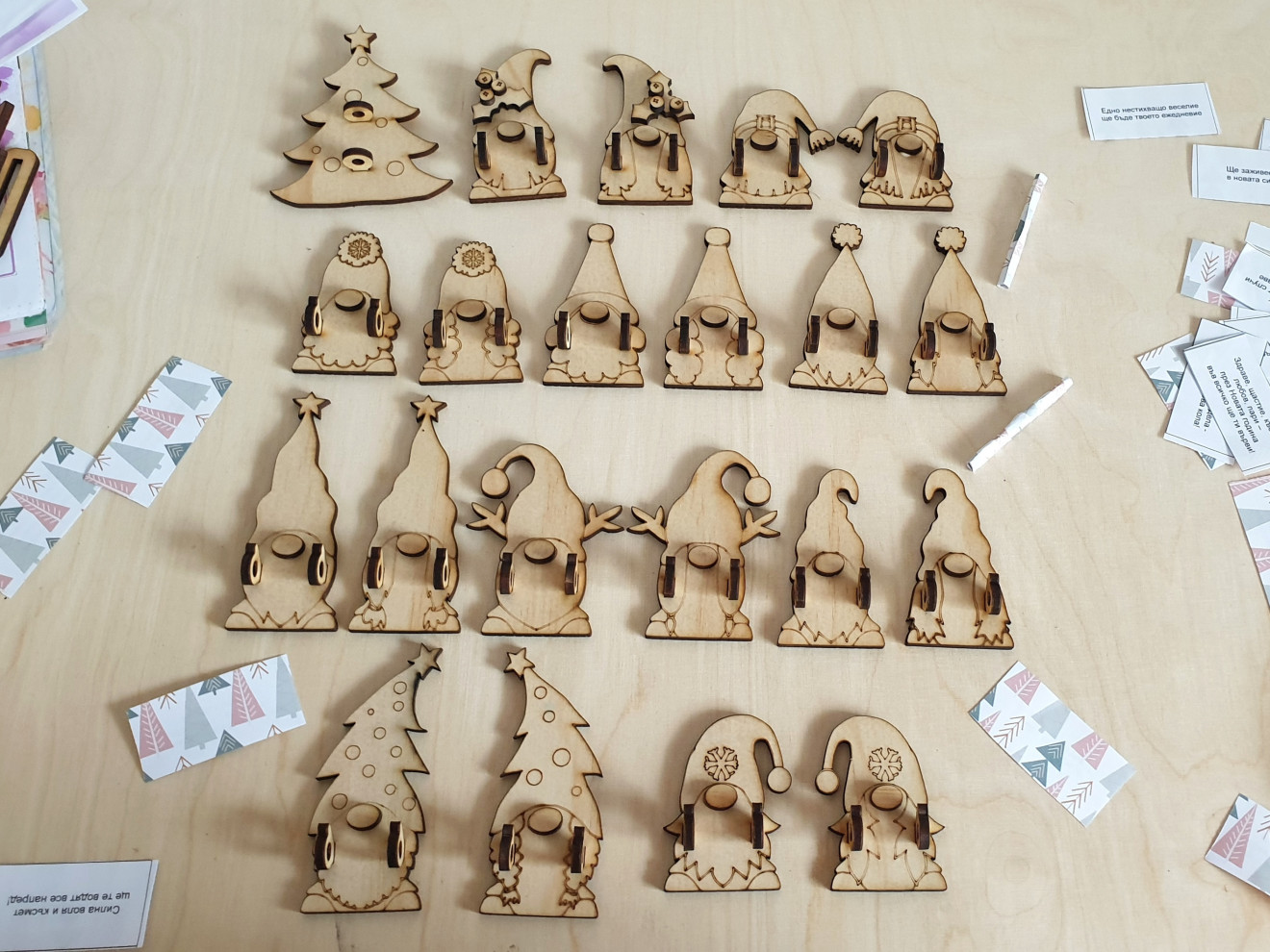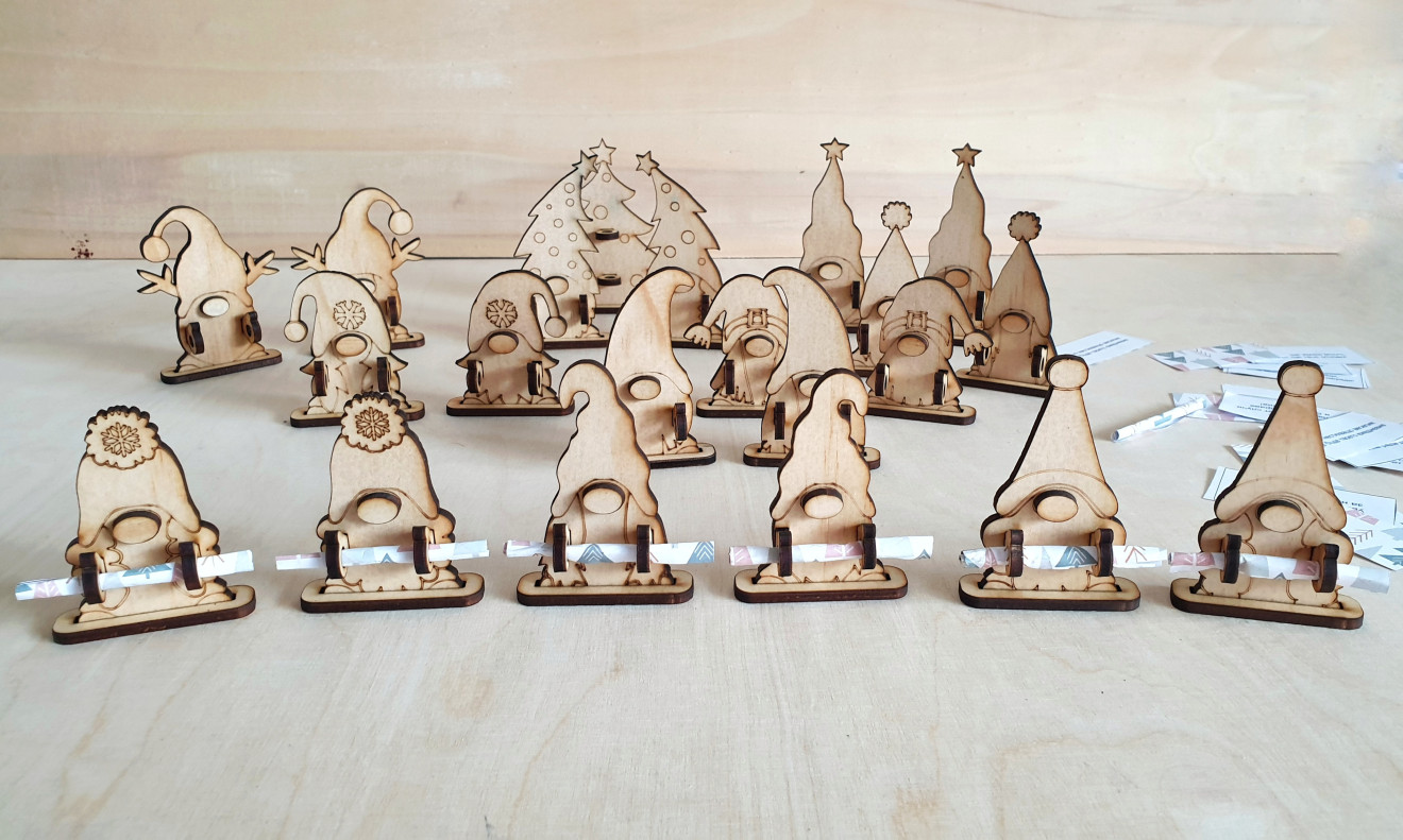 Дървени гномчета държащи коледни късмети (или някоя банкнота за подарък ? ). Гномчетата са 10 вида, като всеки има вариант за момче и момиче, както и една елха. Могат да се изработят в комплекти по 10бр за 30лв с видове гномчета/елхичка по избор, 20бр гномчета + подарък елхичка за 60лв. или на бройка - по 3,50лв. Самите гномчета могат да се персонализират с име, по желание. Могат и да се оцветяват.