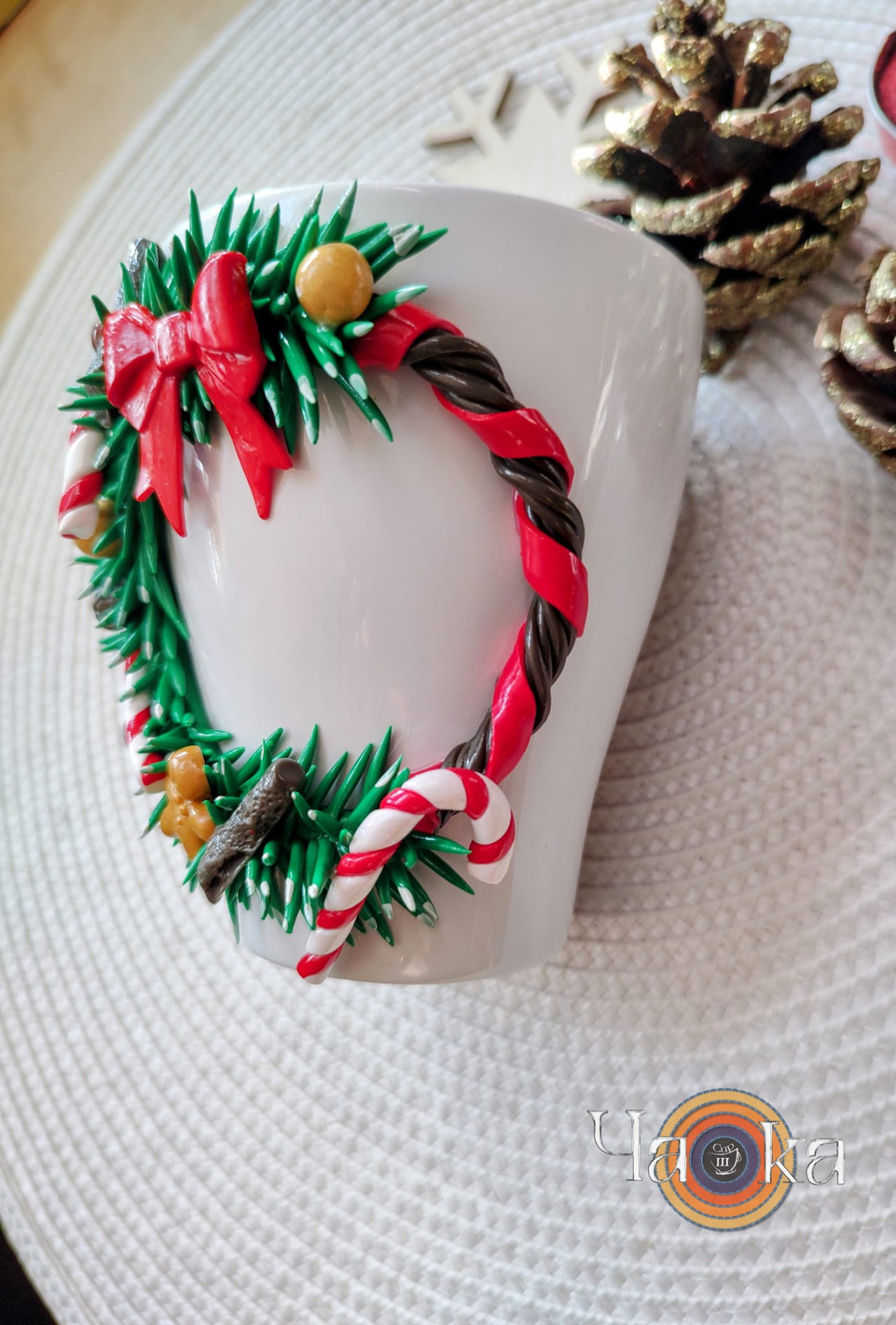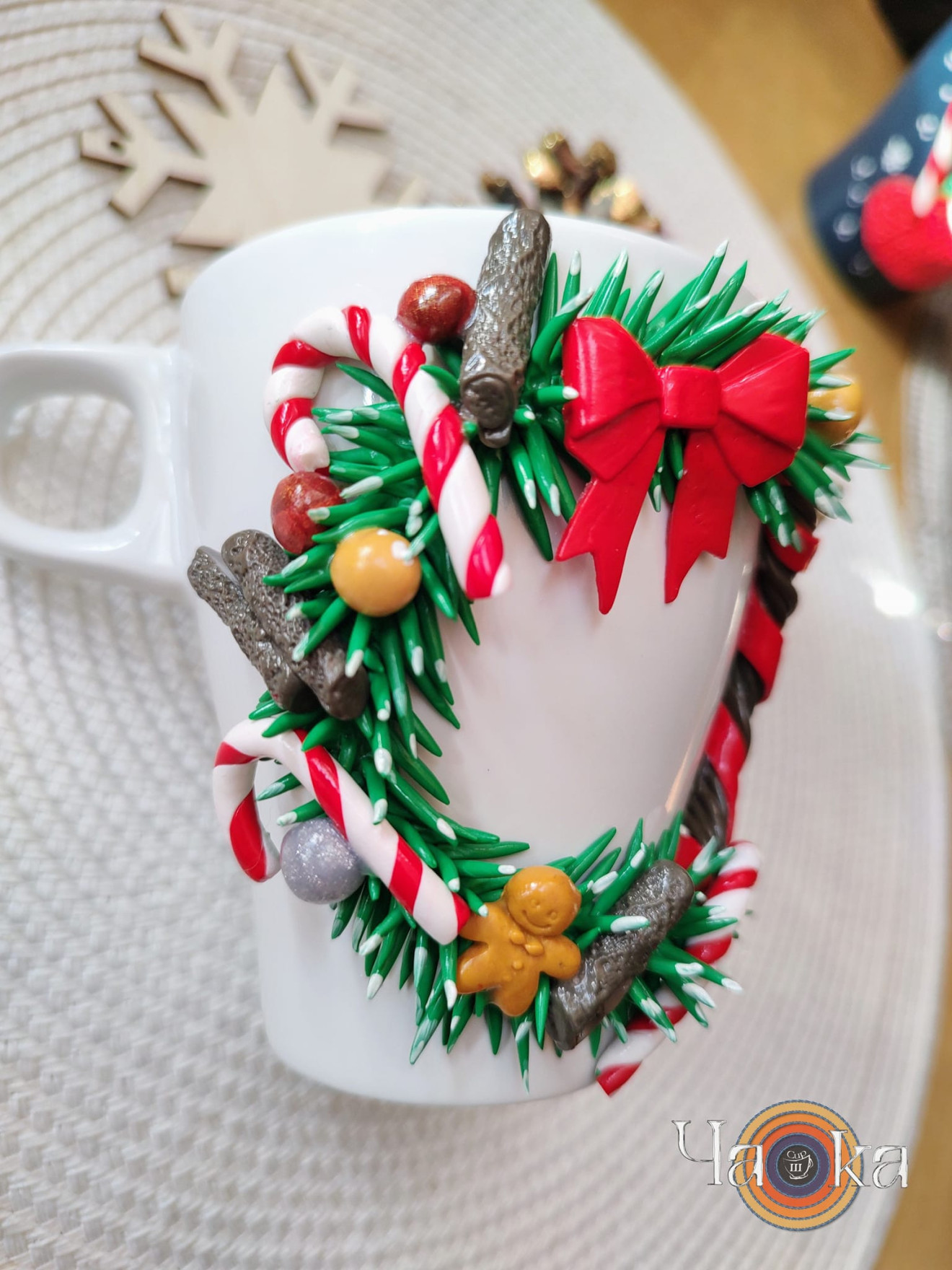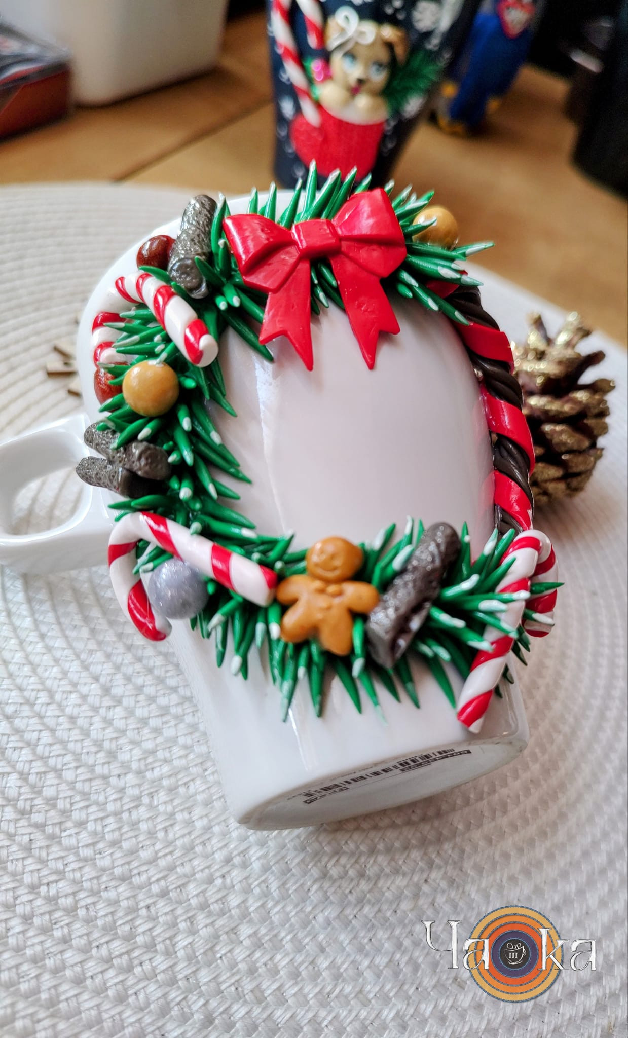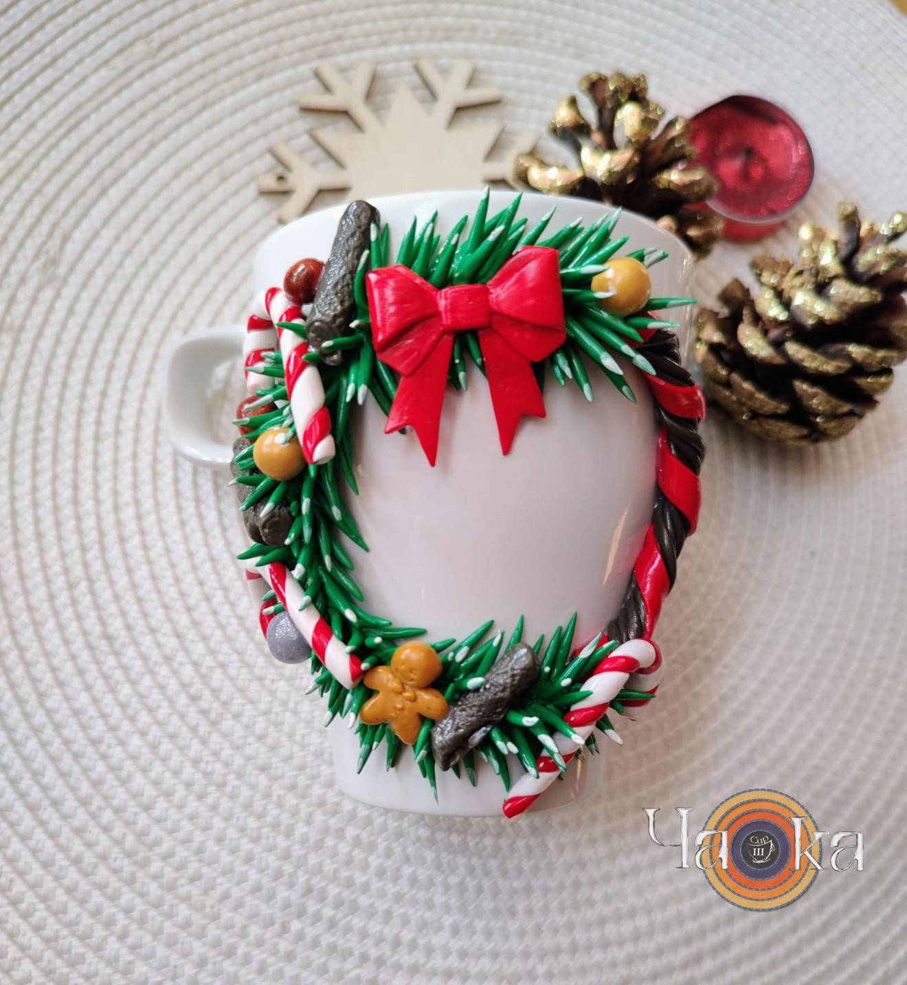 Ръчно декорирана чаша с полимерна глина с Коледен венец. Един уникален и неповторим подарък за теб или твоите близки.