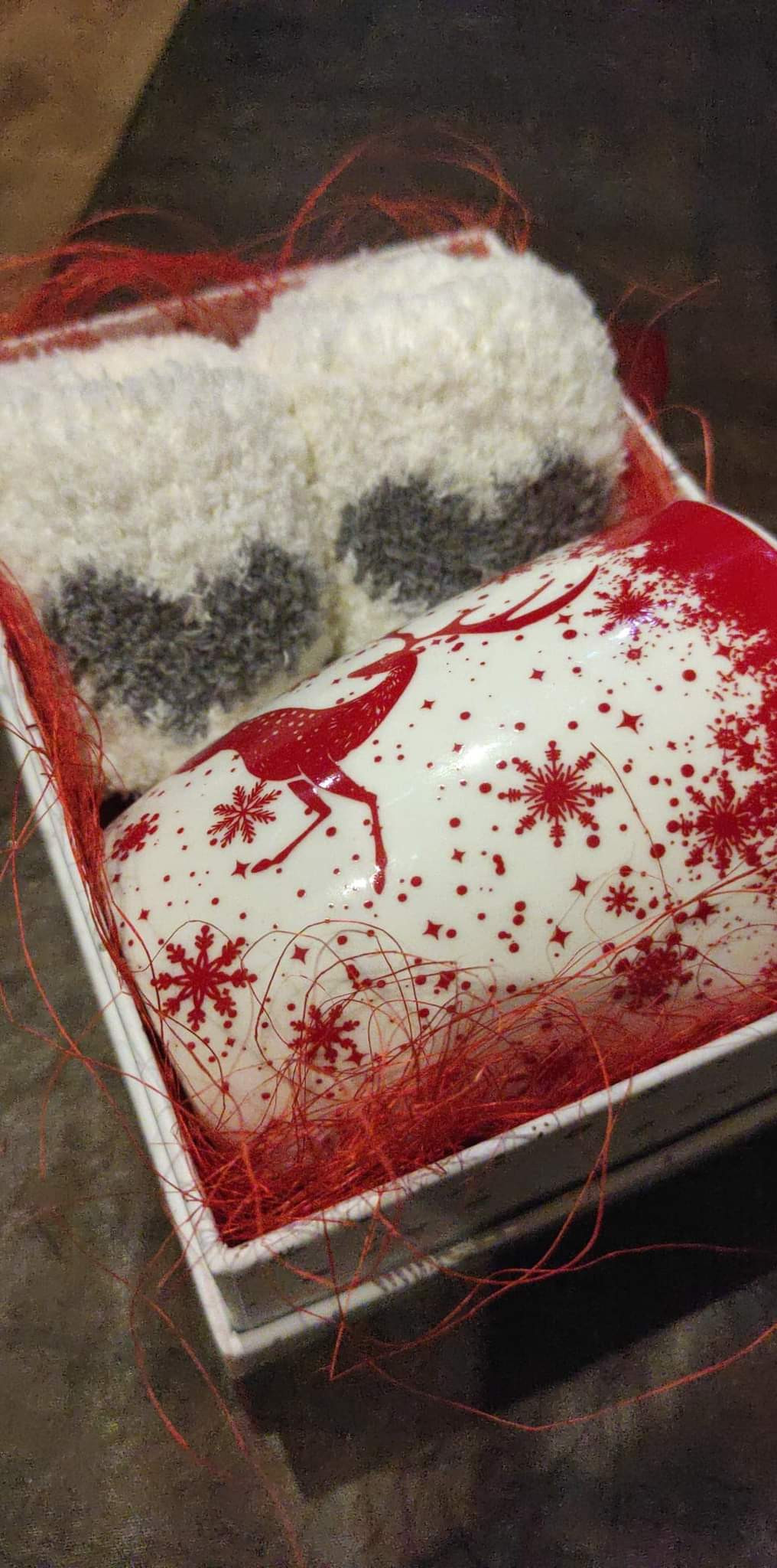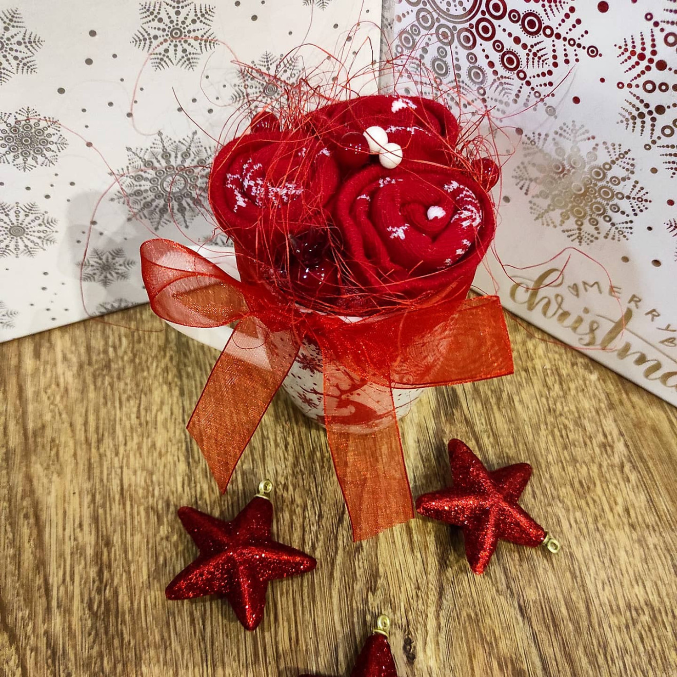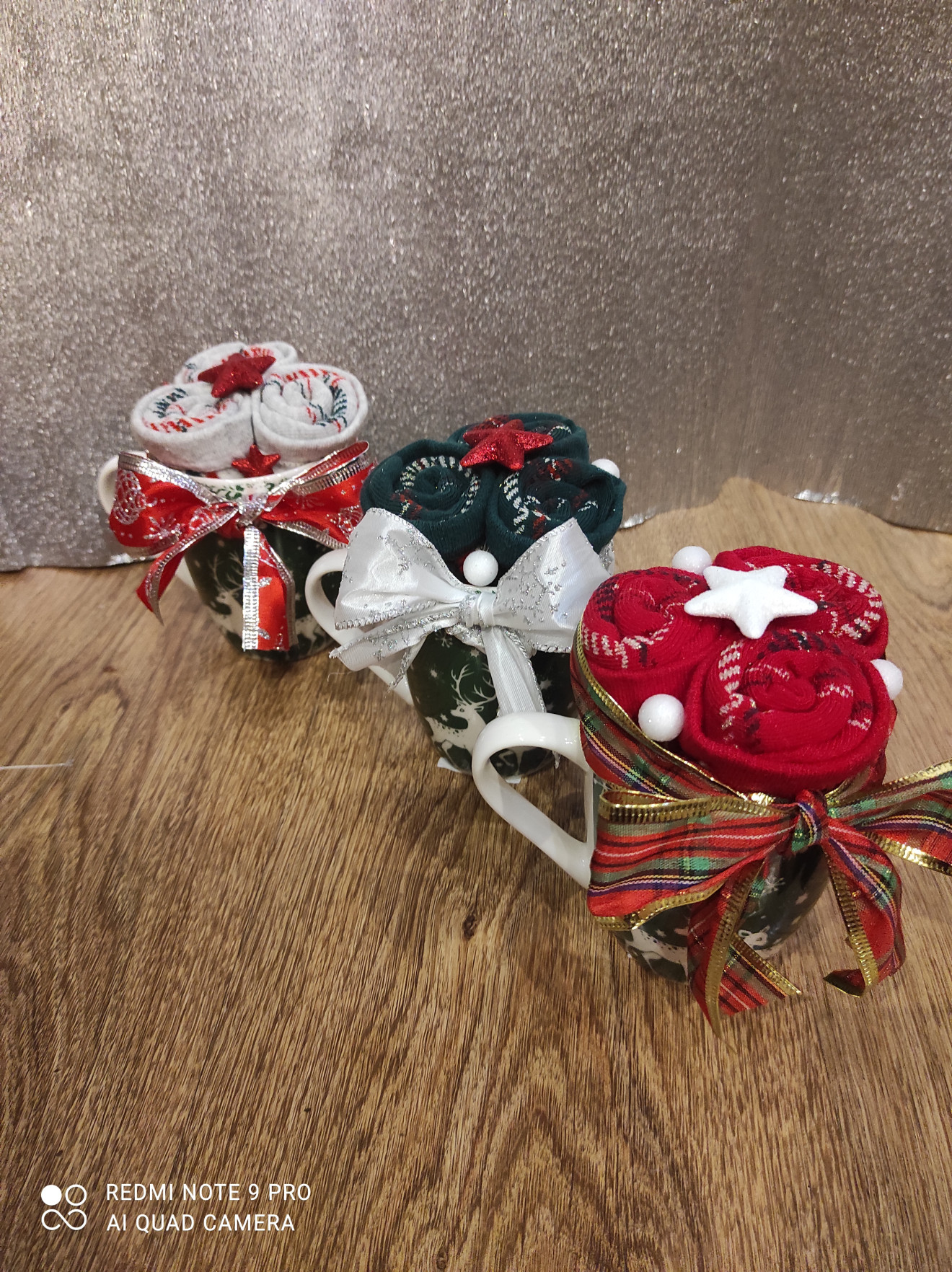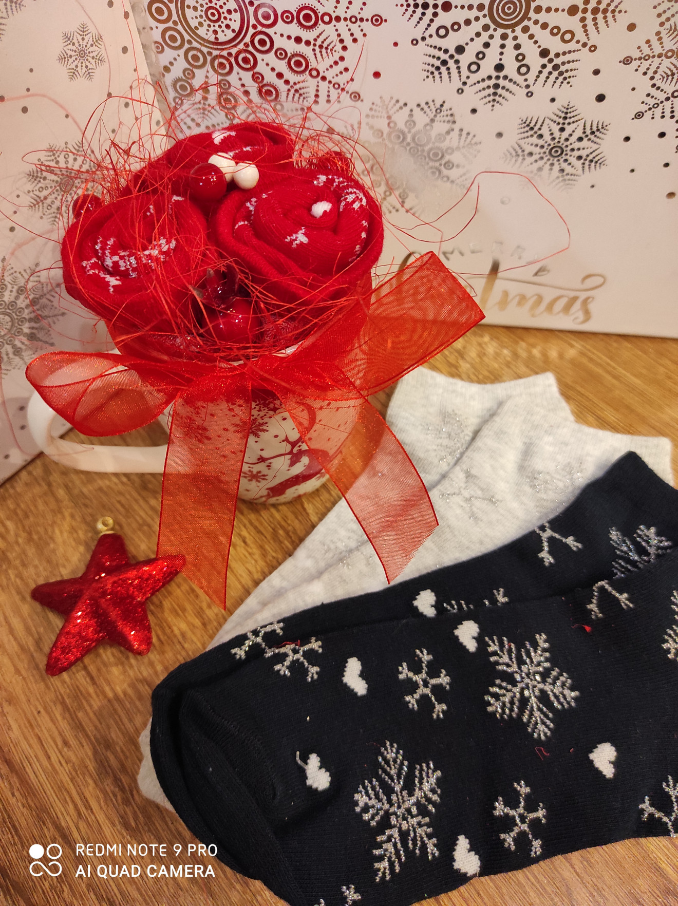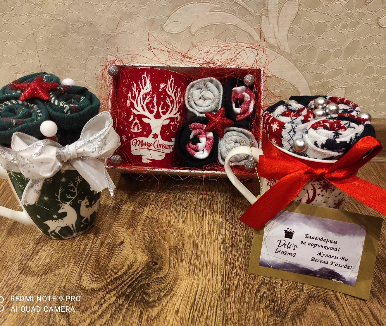 Коледа е топлина и уют. Тези две неща откриваме в чаша топъл чай или горещ шоколад и чифт топли чорапки. За това едно от нещата, които предлагаме тази Коледа, са нашите букети от чорапки в чаша. За да подарите топлина. Букетчетата в чаша за дамите се предлагат в два вида - от къси чорапки и от дълги чорапки. Мъжките чорапи са само дълги. Имаме налични различни модели чашки и чорапки. Пишете ни за повече информация. Цената за чаша с дамски къси чорапи е 12 лв. Цената за чаша с дамски дълги чорапи е 14 лв. Цената за чаша с мъжки дълги чорапи е 14 лв.