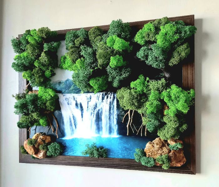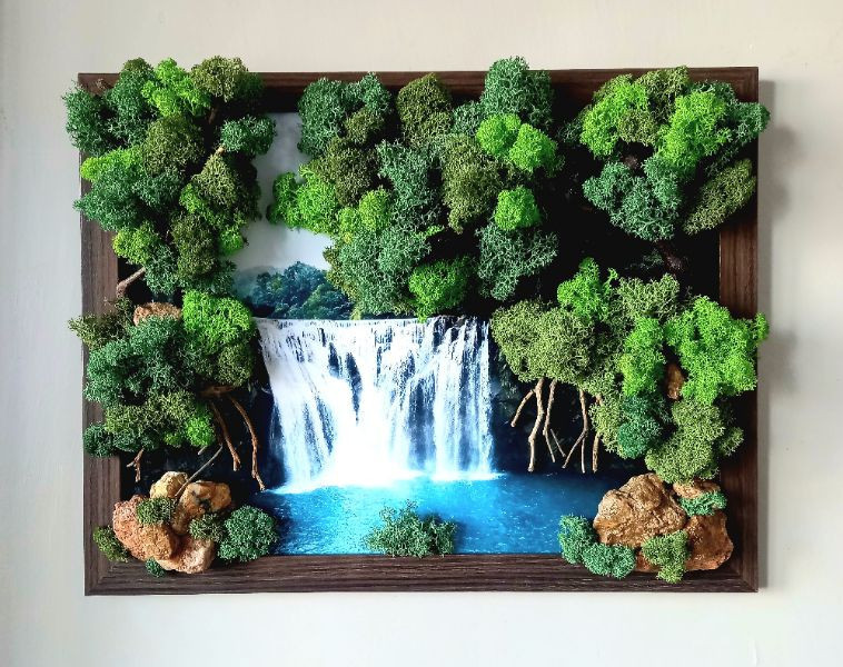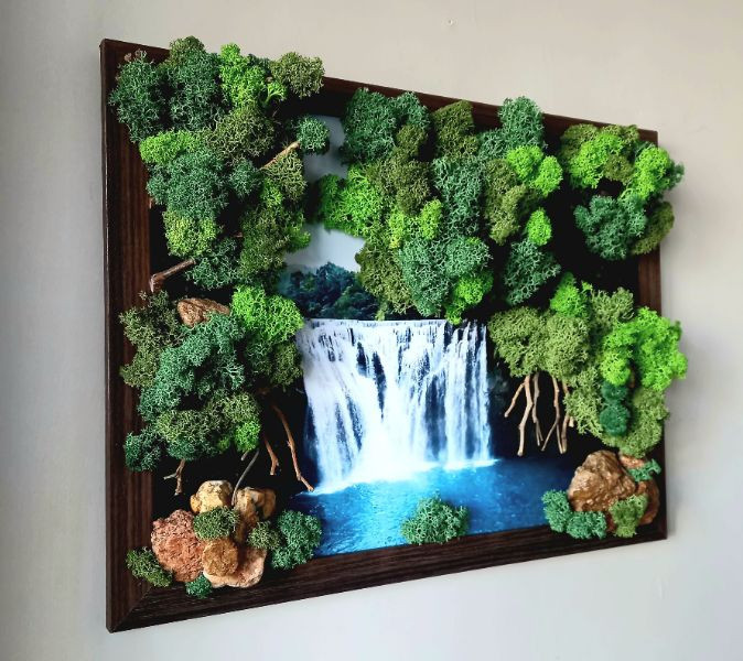 "Сред природата", изработено с естествени материали. За направата са използвани скандинавски мъх, камъчета и клонки. Стенна рамка с размери 44/34 см.