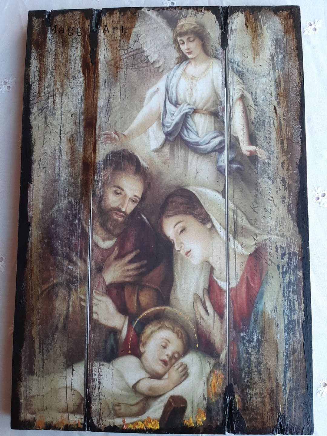 Здравейте. ? Днес Ви представям #Пано"Рождество Христово" направено върху масивна дървена основа с размер 20/29см. носещо #Коледно настроение. ? ?☃ Техника-трансфер. Акрилни бои,контури и байц. Състарено с битумни и антични пасти. #Коледа #интериор