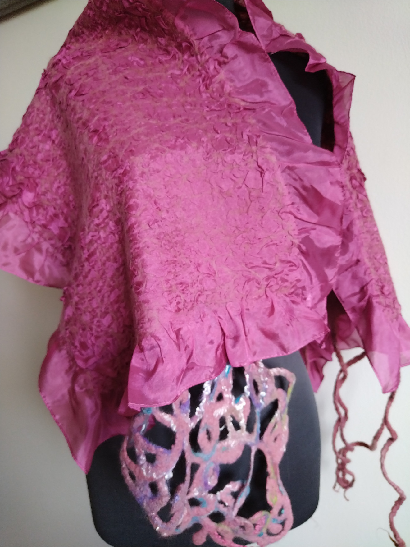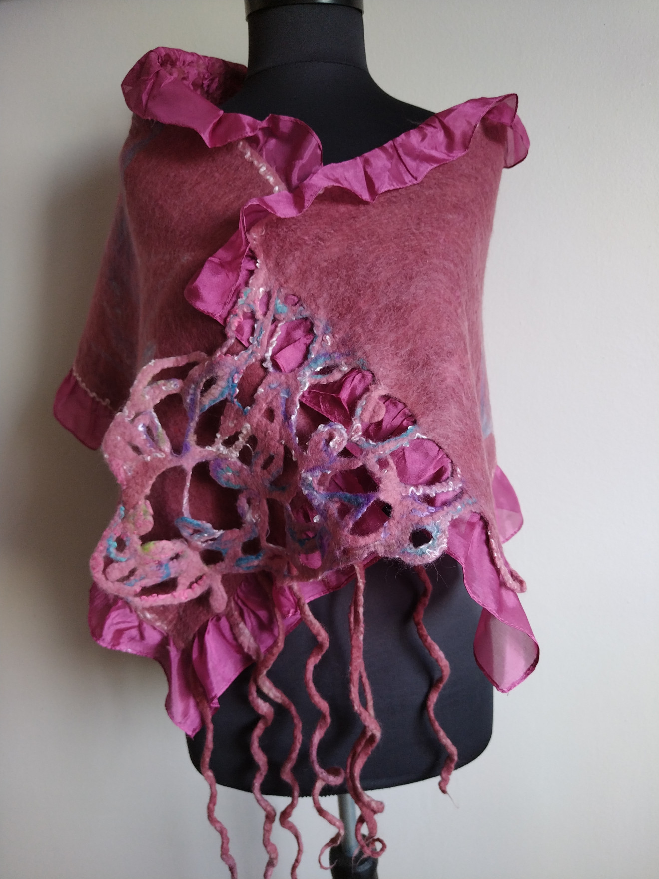 Мериносова вълна, влакна от коприна и вискоза, коприна плат, сплъстени със сапун, вода и много любов.