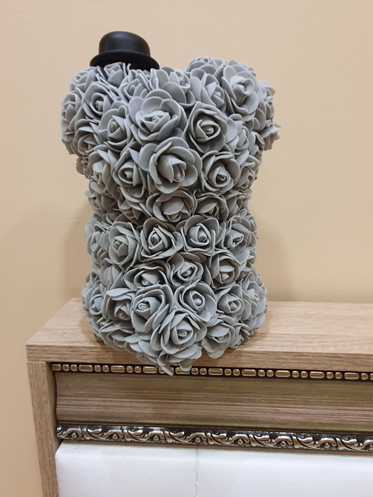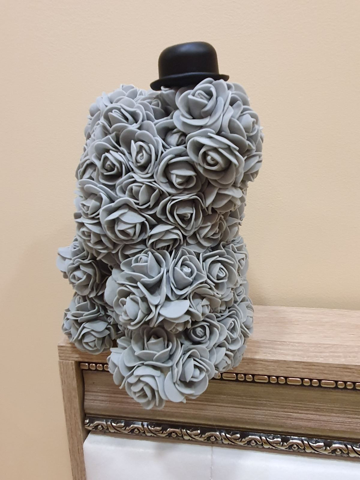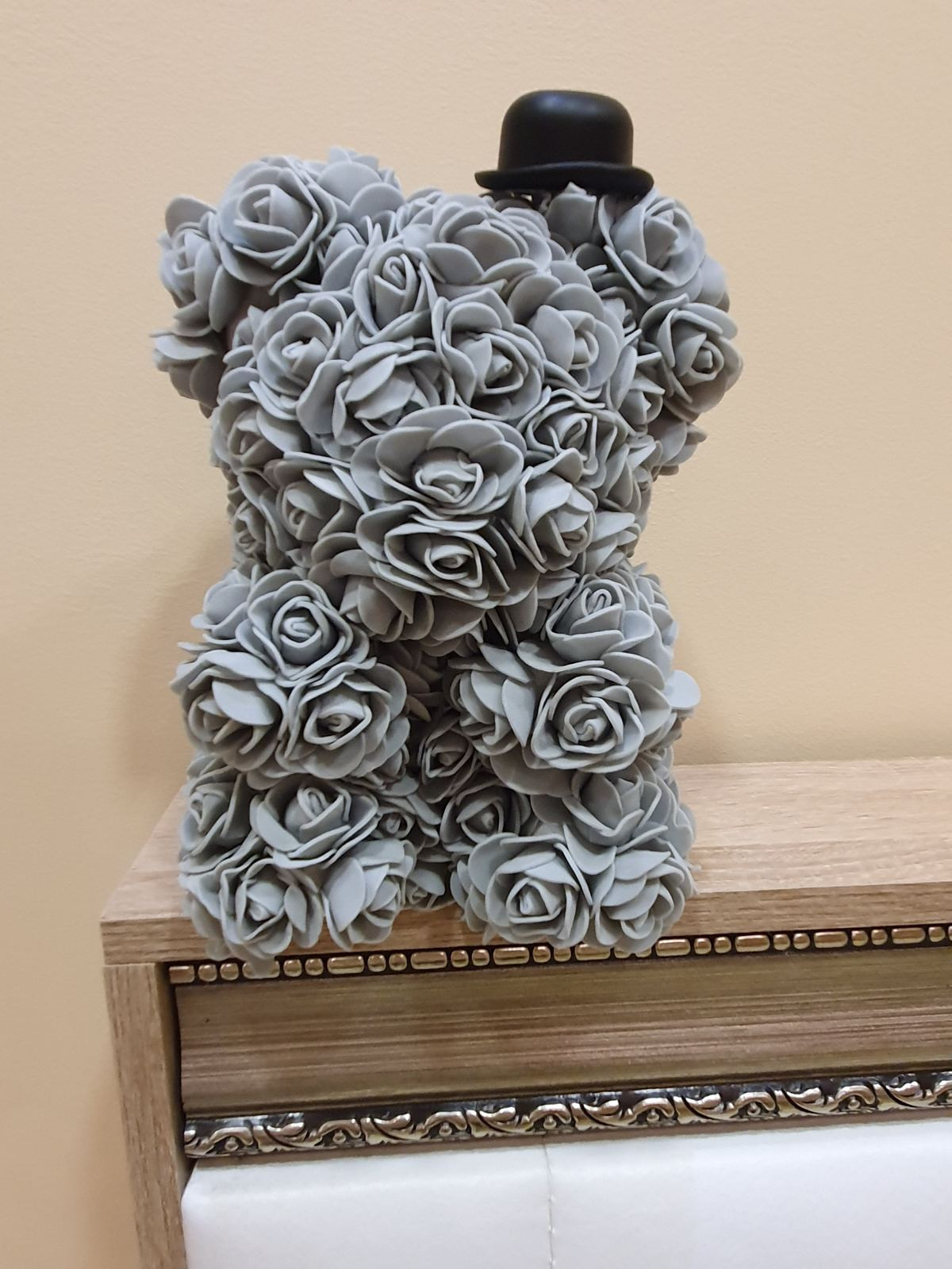 Мече от вечни рози в сив цвят, декорирано с малка черна шапка. Предлага се опаковано в подаръчен целофан с панделка.