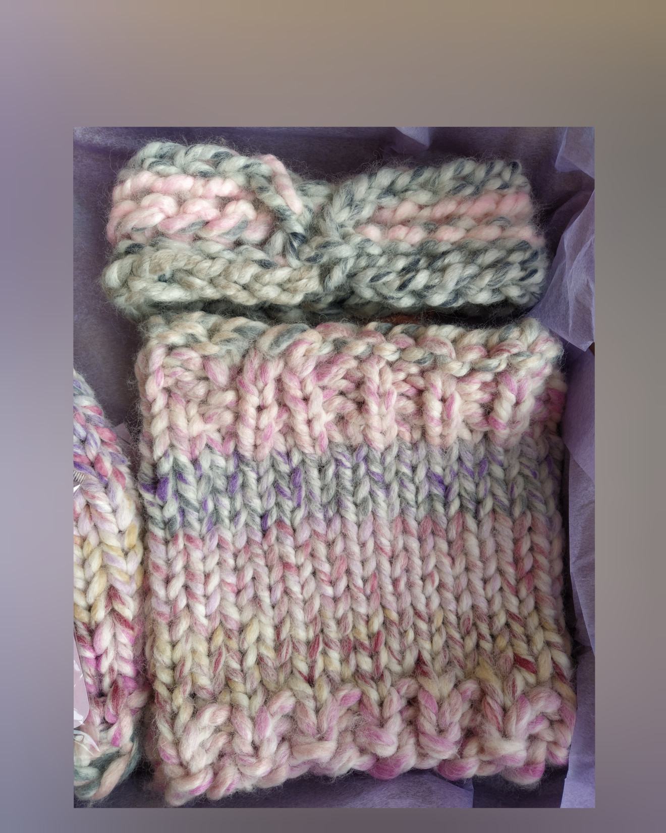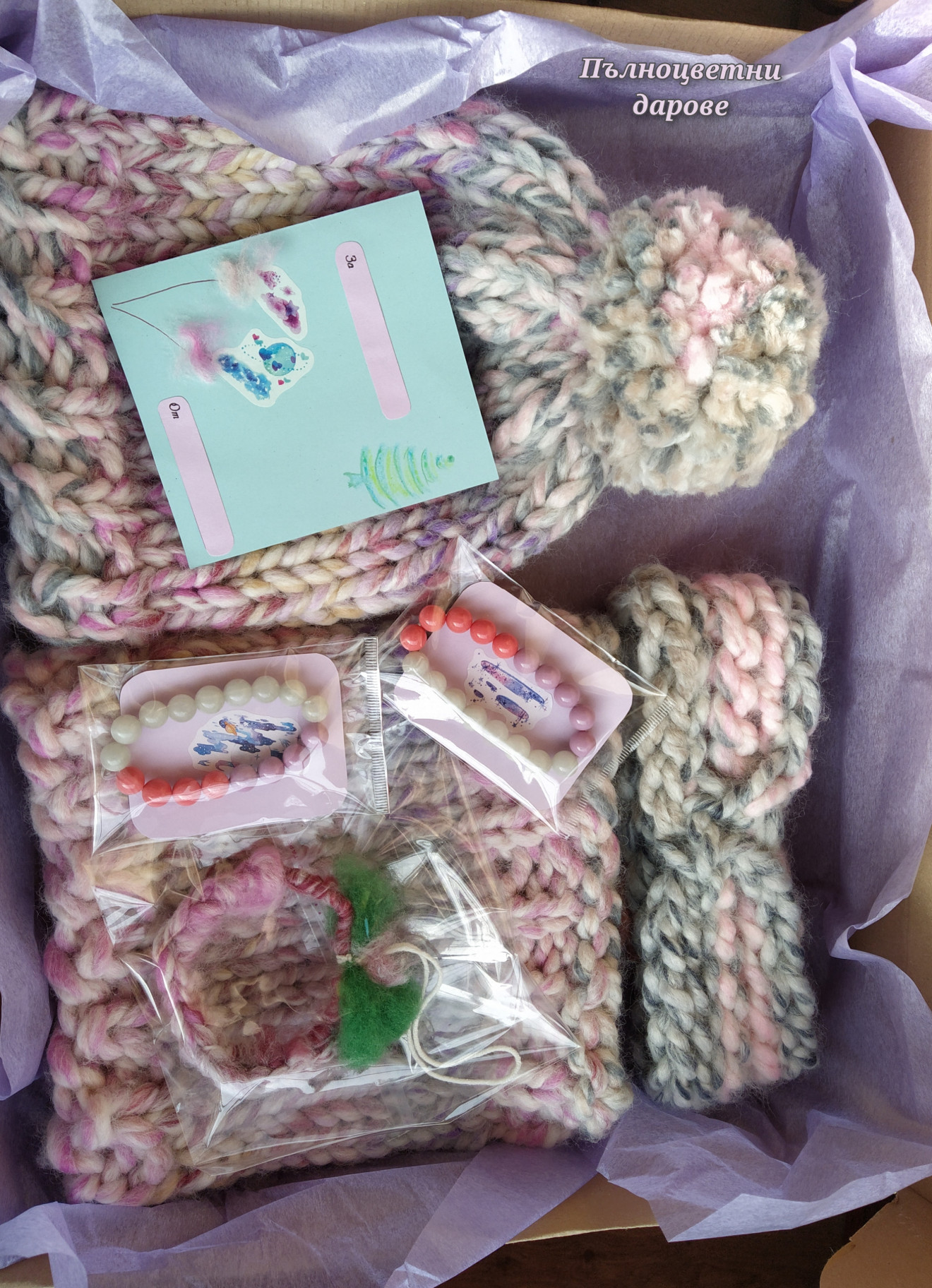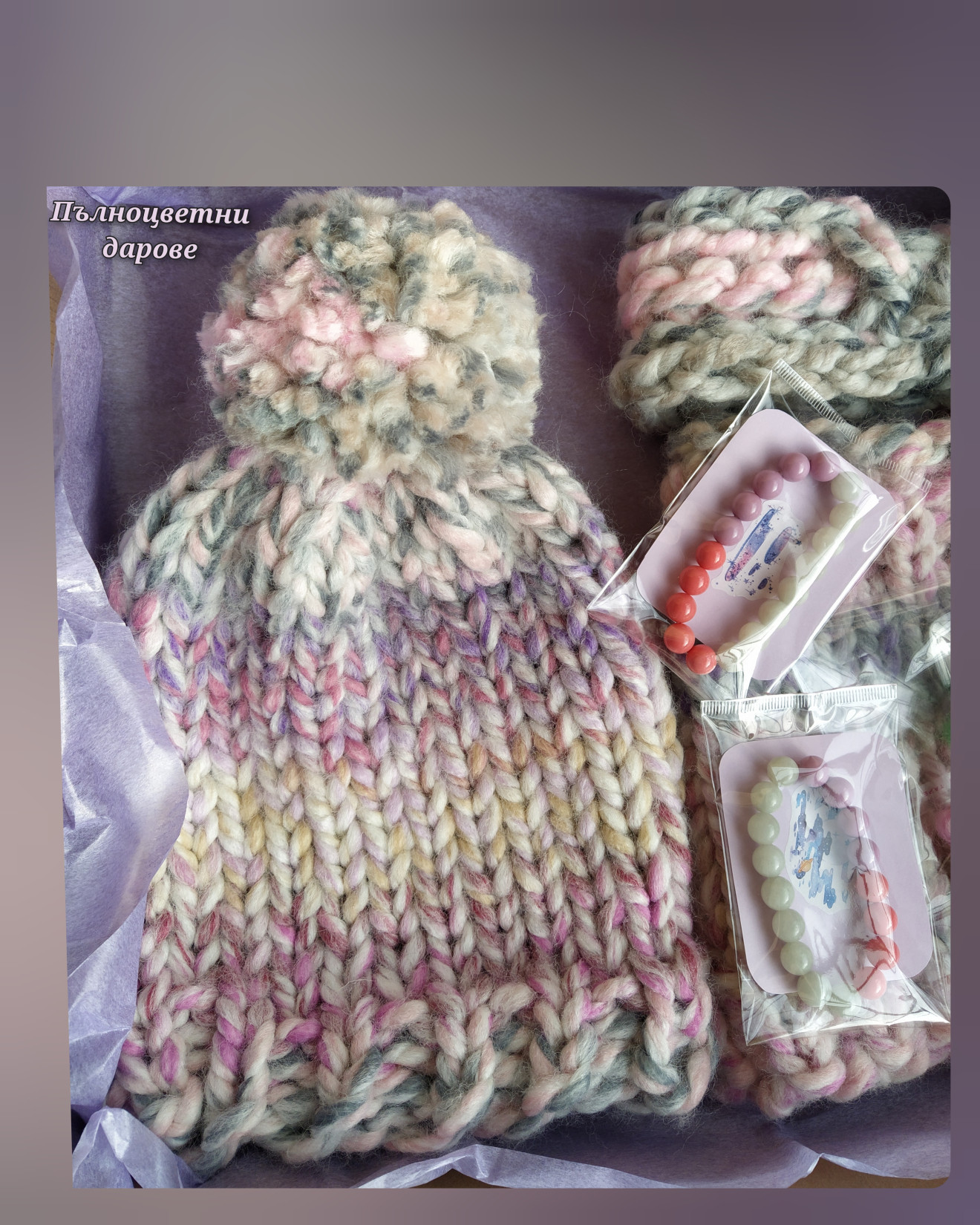 Съдържа плетива от много мека и пухкава прежда. Със състав от 80% висок клас акрил и 20 вълна, която не боцка. Стои обемно, ефектно и същевременно топли достатъчно. ✓ Шапка - размер за възрастни. ✓ Шал яка - подходящ за възрастен или за деца над 9 години. ✓ Лента за глава - подходяща за деца над 9 години и възрастни, които носят шапки с размер 54-55. Отделно добавихме: ✓ Две гривни с бял опал и цветни керамични мъниста. ✓ Играчка за елха в същата цветова гама. ✓ Картичка, на която можете да добавите името на получателя и да напишете пожелания. ✓ Кутия с панделка.