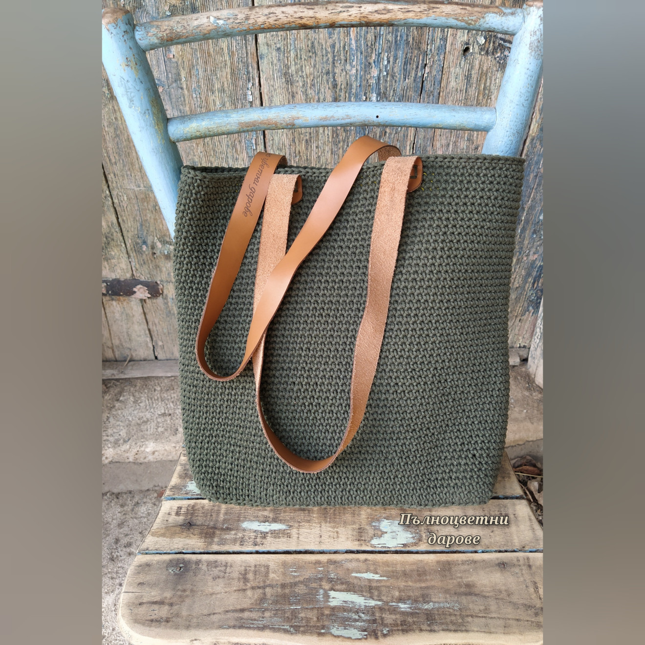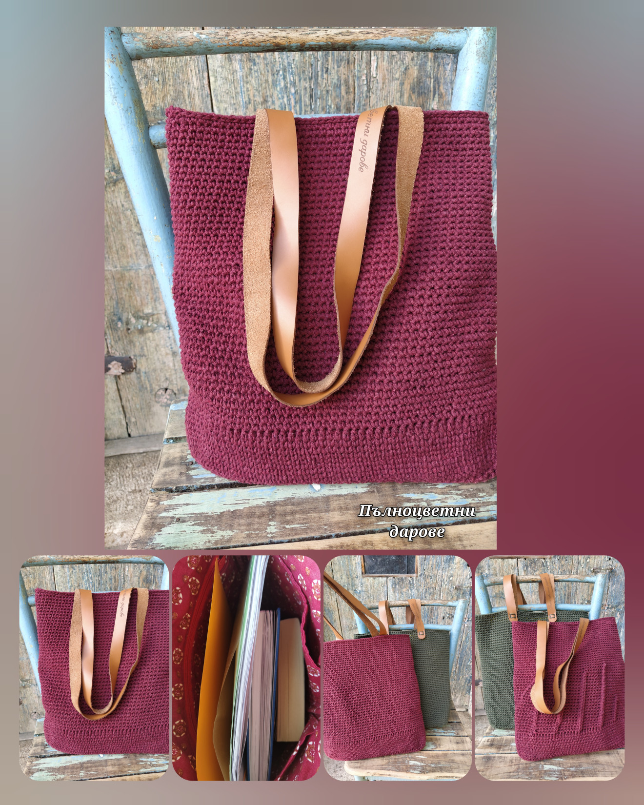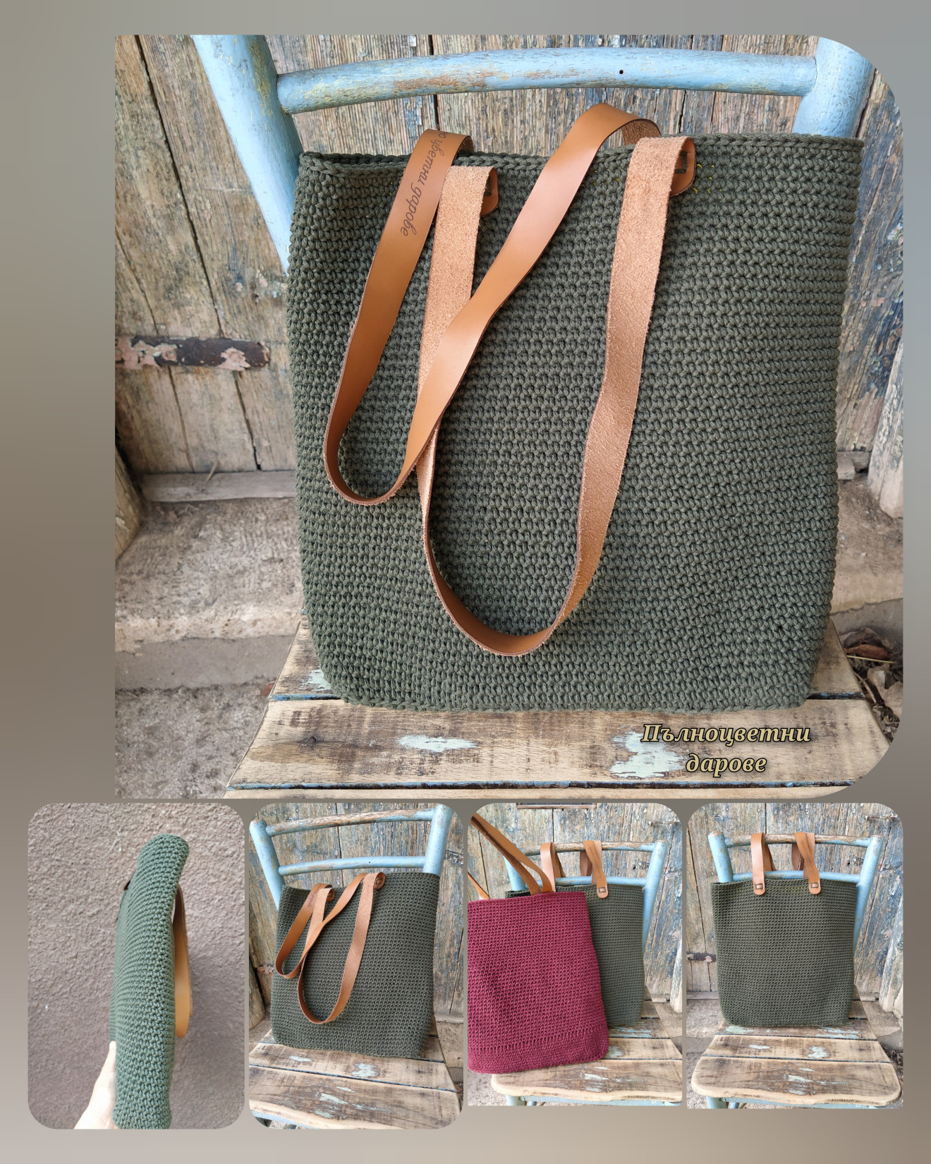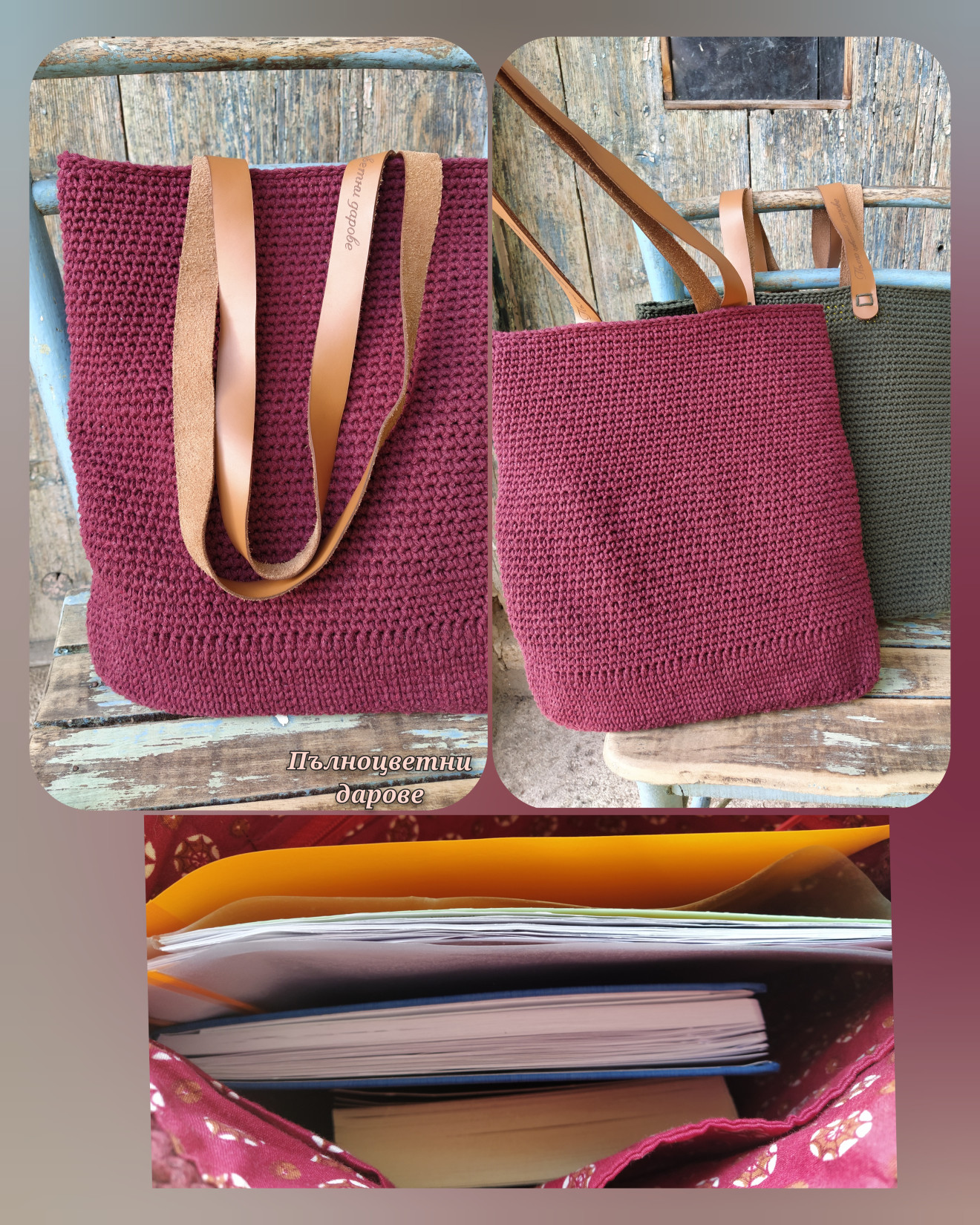 ?Идеята за тези чанти е да са достатъчно големи, за да събират документи и големи книги. Изплетени са от памучно тънко въже - макраме. И двете имат дръжки от естествена кожа с дължина ~ 65 см. Подплата с три допълнителни джоба, един от които с цип. Закопчаване с магнитно копче от вътрешната страна. Вишневата е с размери на дъното ~ 32 см. и височина ~35 см. Маслено зелената е с дъно с размери ~27/6 см. и височина 33 см. ?Събират ли един хляб и бутилка олио? Да. ?Стават ли за дискотека? Не. ????Може ли да се явите на работна среща с някоя от тях? Да. ?Подходящи ли са за официална рокля и вечеря? Зависи. ?Какво харесвам най-много в тях? Много са удобни, издръжливи и стилни. ?️?Цветните варианти са разнообразни. Търпят промени по отношение на размера, закопчаването и подплатата. Пристигат опаковани в кутия с панделка и инструкции за употреба и поддържане. Може да се добави картонче с името на получателя и лично послание. ℹ️☕ Пишете, ако пожелаете да носите или подарите подобна.
