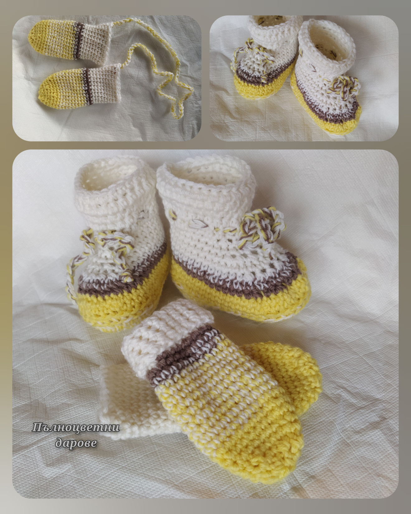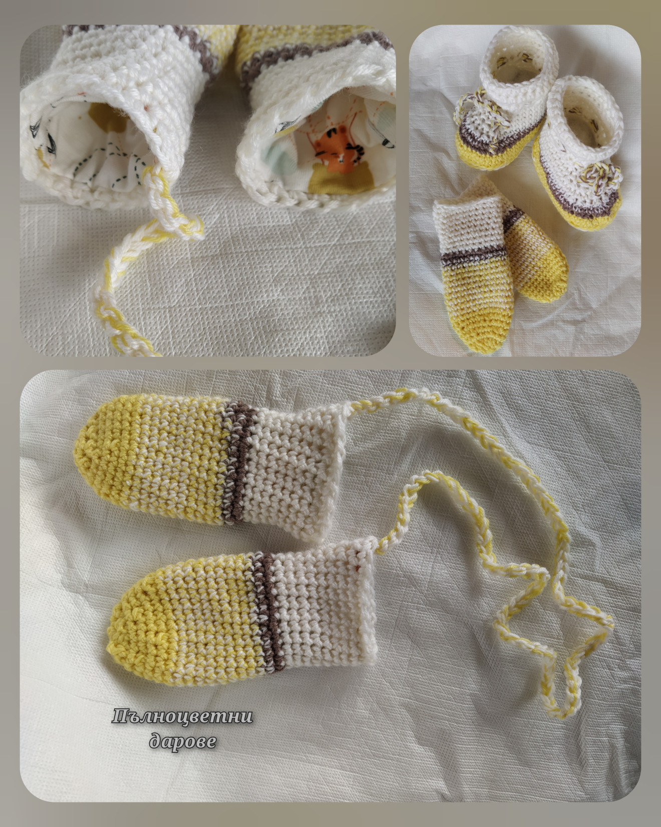Комплект от плетени детски терлички и ръкавички с еластична памучна подплата. Изплетени от бебешка прежда със състав: 40% вълна, 40% акрил и 20% полиамид (тип кашмир). Не боцка и е подходяща и за най-малките, както се подразбира и от името й. Може да се направят и от нишка със състав 100% акрил или смес от памук и акрил. Терличките и ръкавичките се изработват в желан размер, който започва от 0 месеца. Цветовете също търпят промени. Напишете ни съобщение, за да уточним идеята Ви и срока за изработка. Понякога е възможно да станат и по-бързо от посоченото време. ?