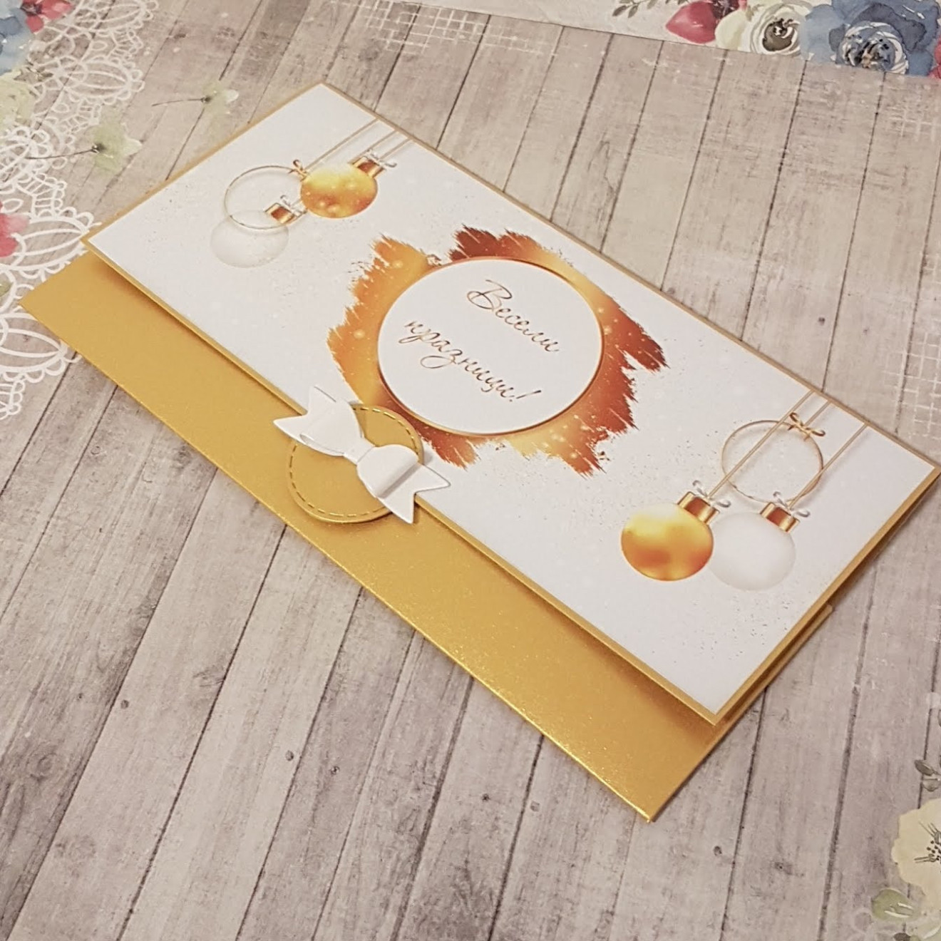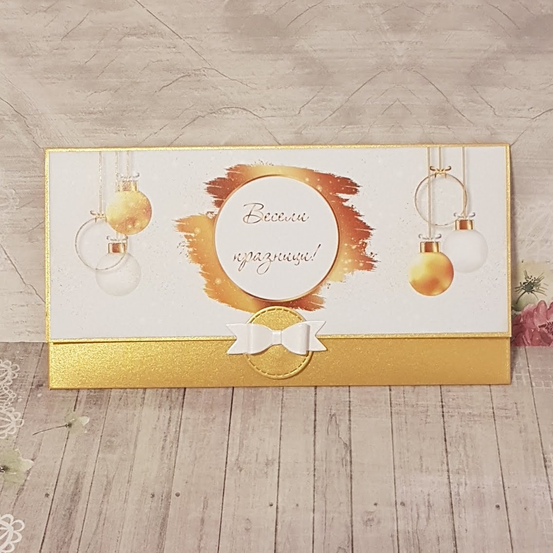 • Картичка-плик с джобче за банкнота и цветно картонче с място за пожелание. • Размер: 10х19см. • Срок за изработка: 2-3 дни. • Автор: ФлориАртс бутик