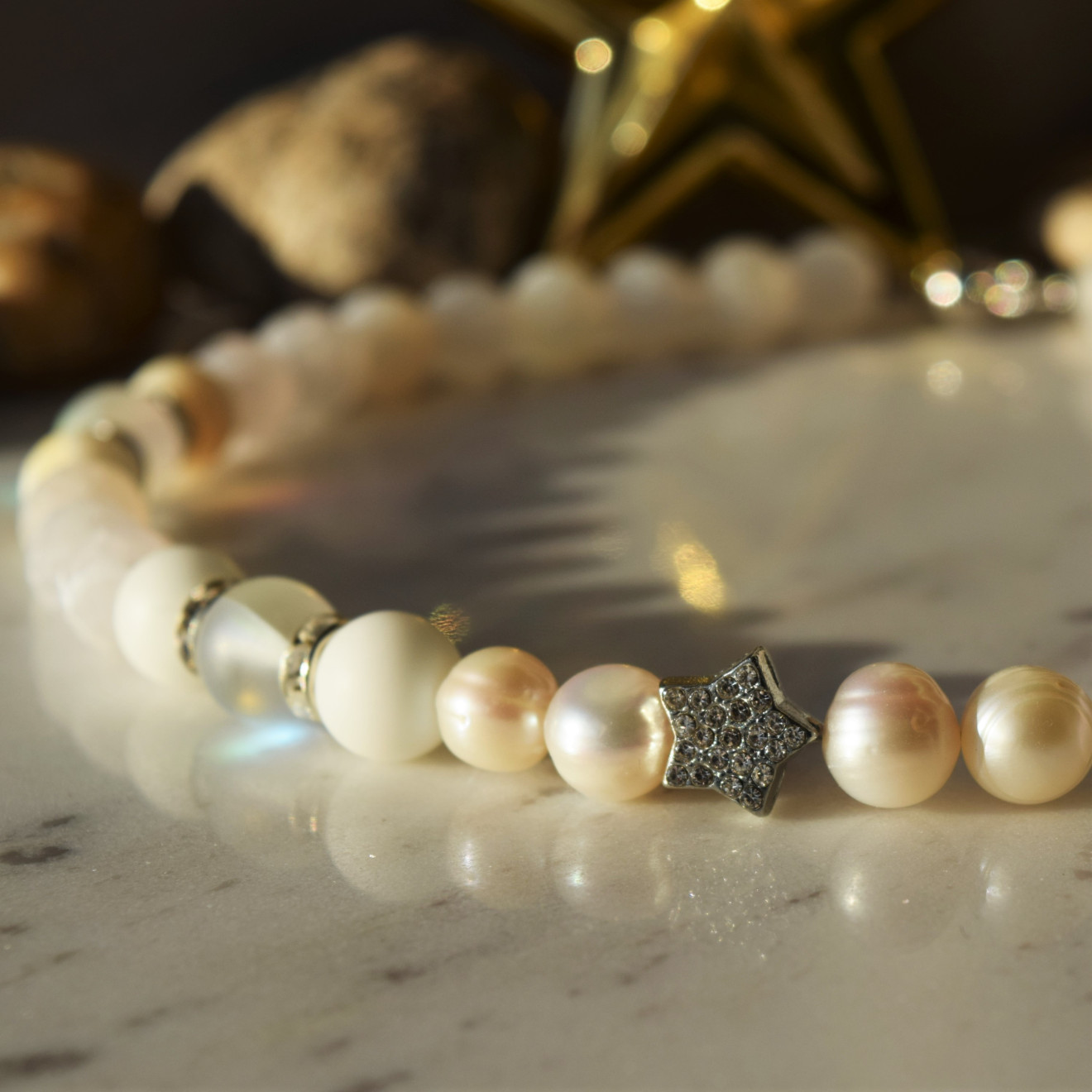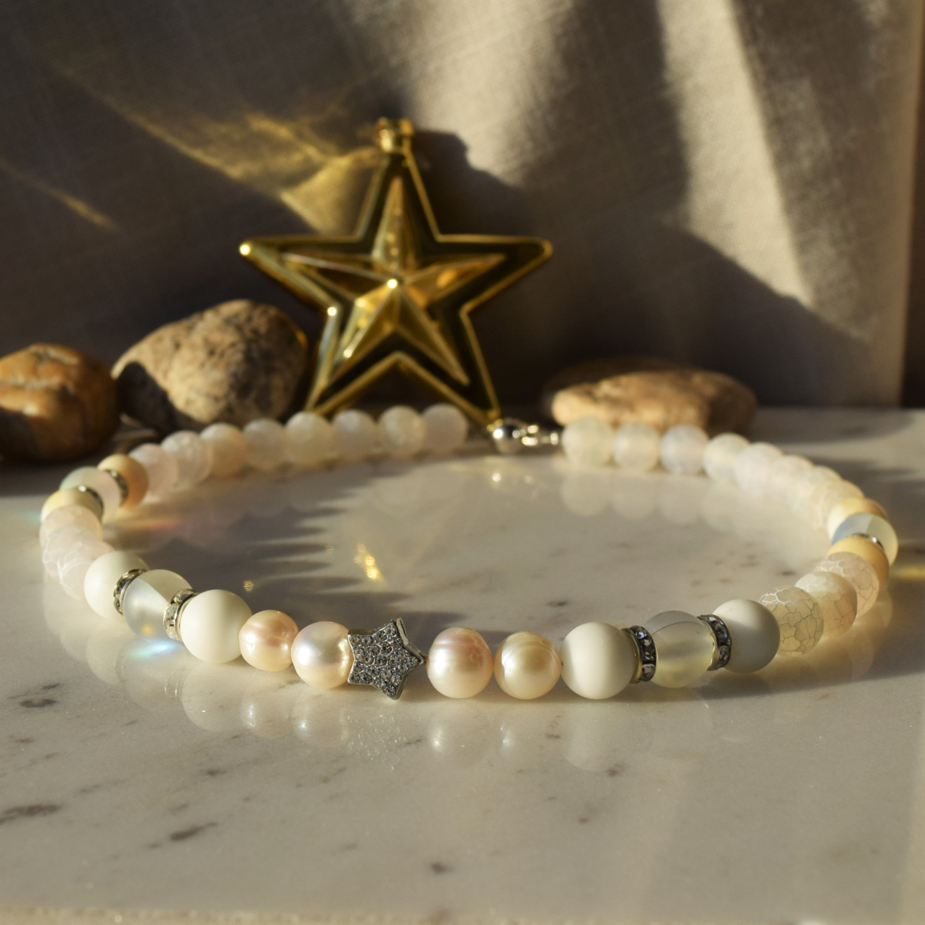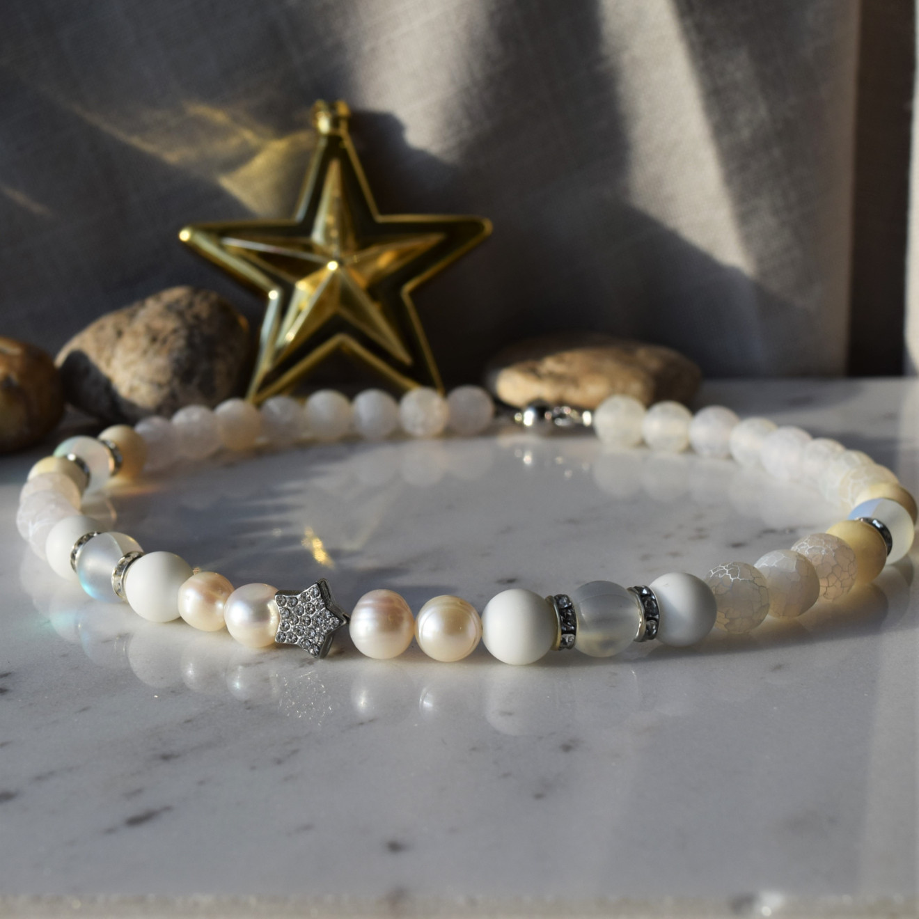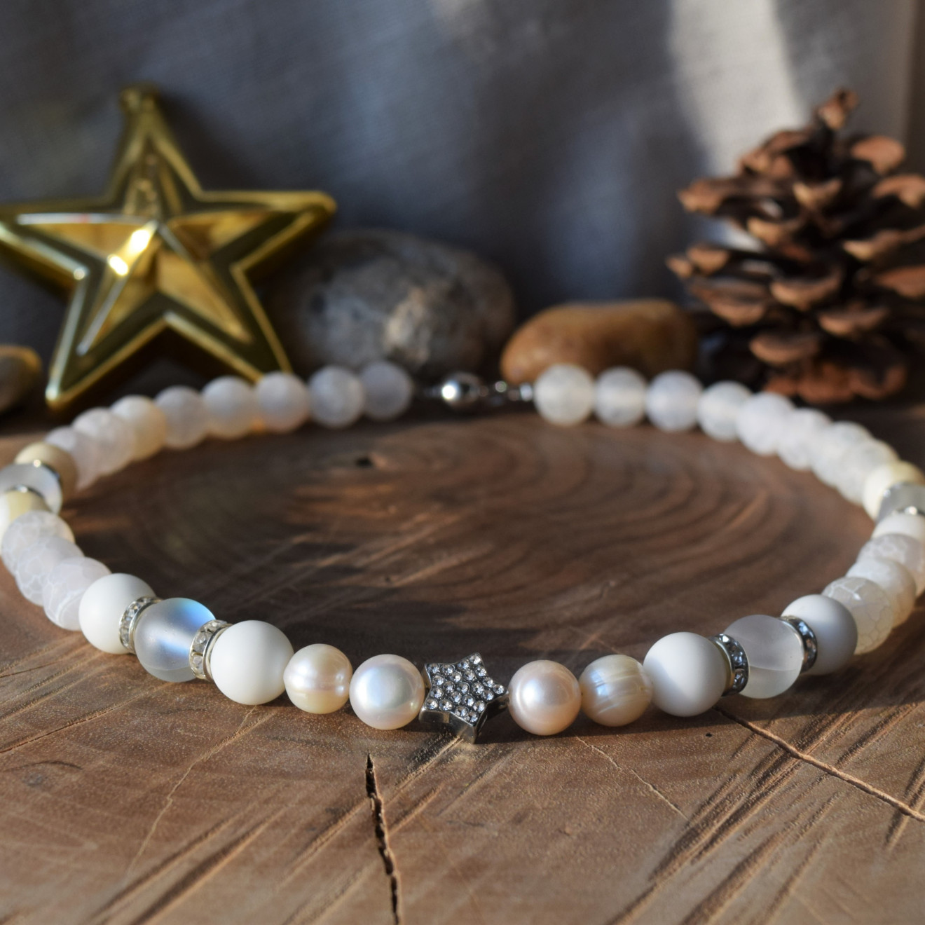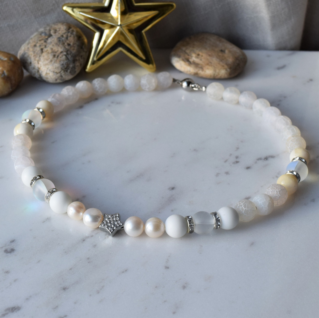 Ръчно изработено колие от естествени камъни в бялата гама " Снежна Звезда " . Колието е направено от мъниста напукан Ахат (10мм) , Седеф (10мм) ,Опалит Ангелска Аура (10мм), Млечен Кварц (10мм) , Речна Перла (8мм) и метална Звезда инкрустирана с кристали, и метални разделители с кристали , нанизани на стоманена тел и завършва със стоманена закопчалка . Дължина 42см . Много стилно колие създаващо празнично настроение, страхотно допълнение към тоалета Ви .