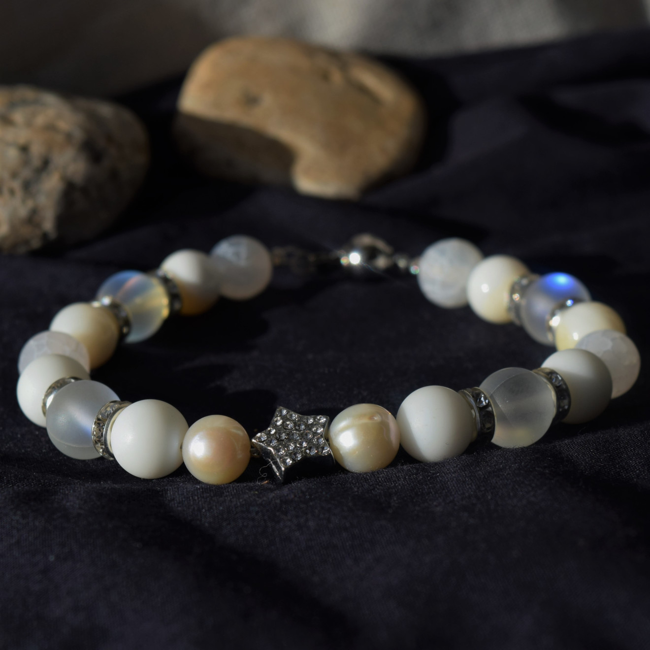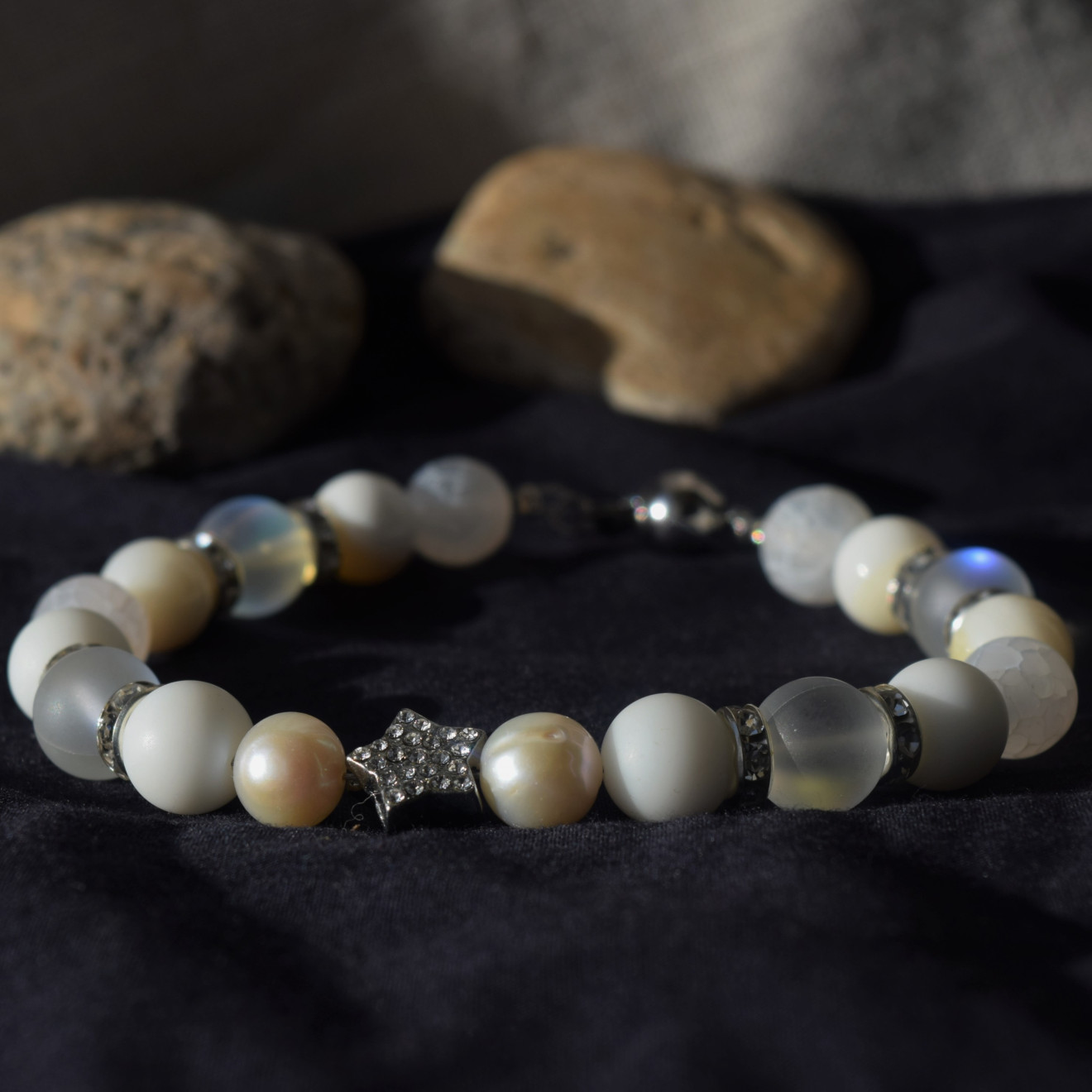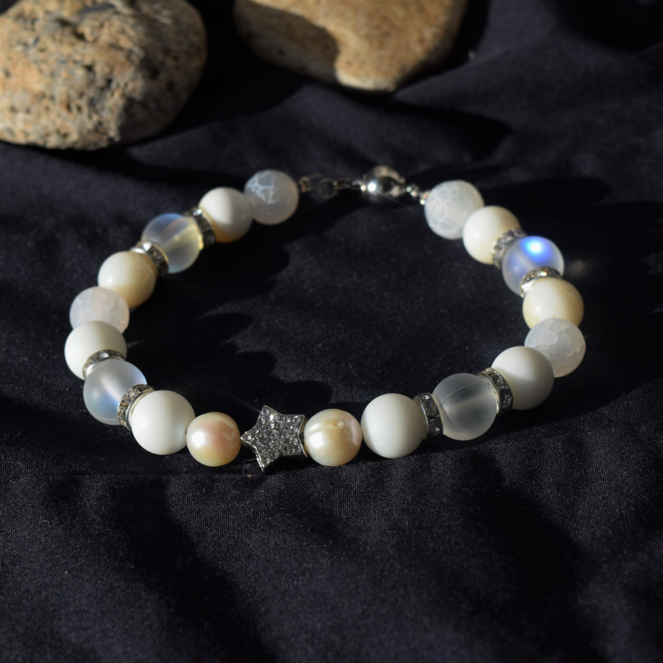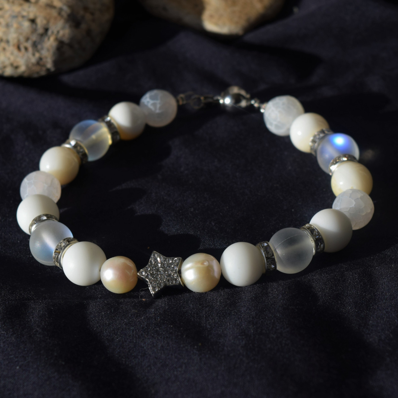 Страхотна комбинация от мъниста естествени камъни в бяло , отлично съчетаващи се в красиво украшение за Вашата ръка , прекрасно допълнение към празничният Ви тоалет . Гривната е ръчно изработена от мъниста Седеф(10мм) , речна Перла (10мм), Опалит Ангелска Аура10мм) , напукан Ахат(10мм) и мънисто Звезда инкрустирана с кристали , и метални разделители с кристали , нанизани върху стоманена корда , завършваща със стоманена закопчалка . Гривната може да се изработи в желаният от Вас размер , само трябва да го напишете като коментар към поръчката си .