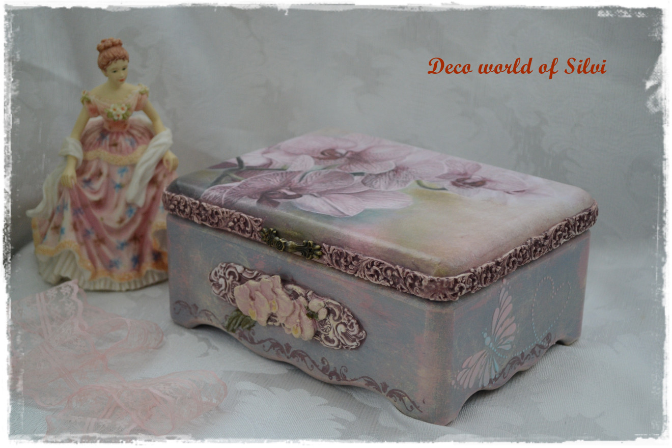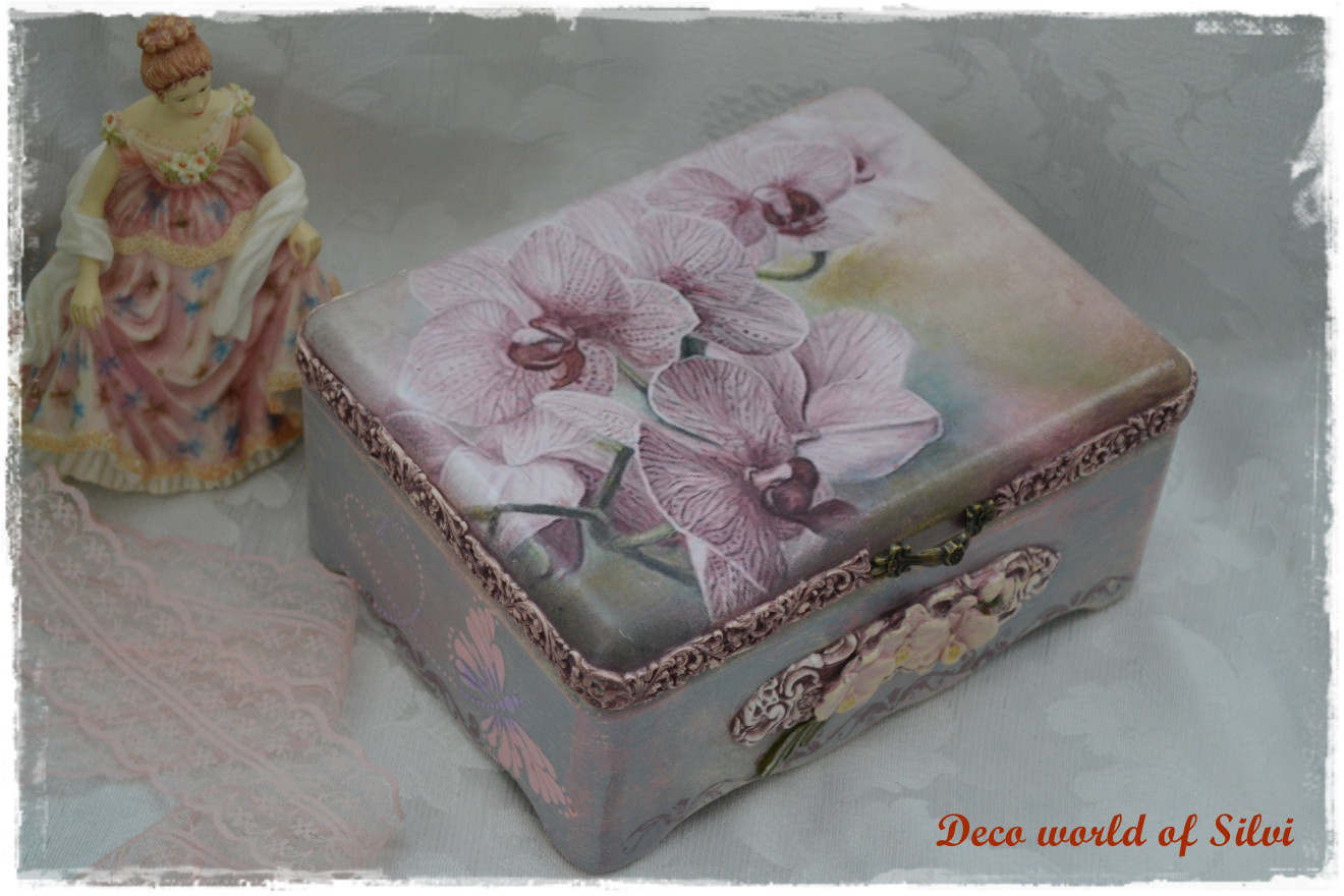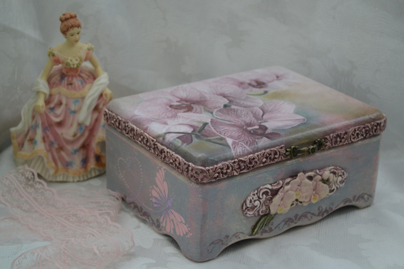 Елегантна и стилна кутия за бижута "Орхидеи".Изработена в техника декупаж и елементи от глина.