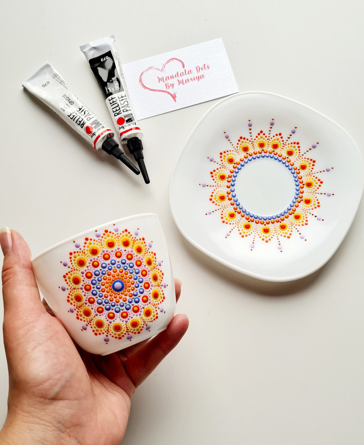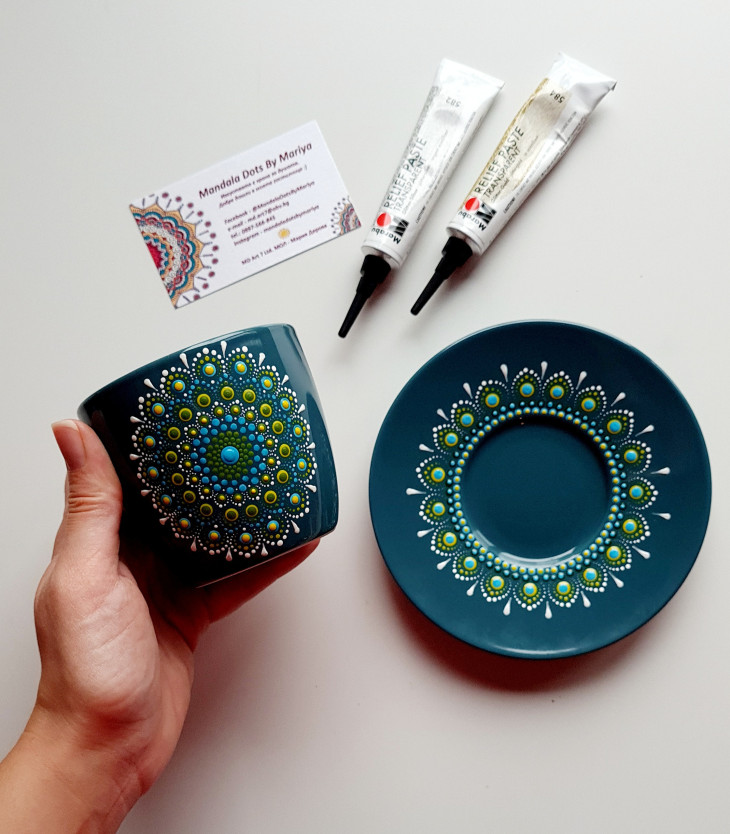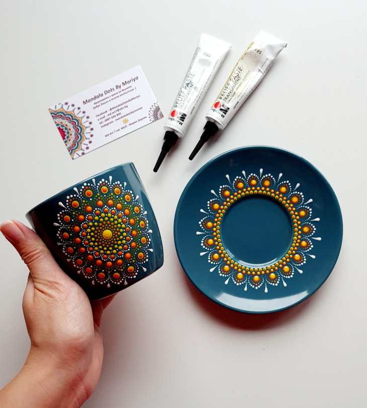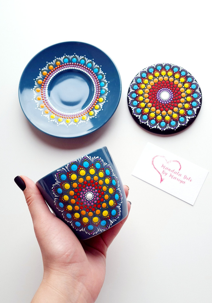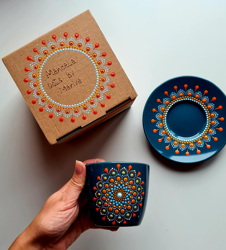 Изцяло ръчно рисувана чаша 250мл. Техниката е поантилизъм, или иначе казано рисуване с точки :) Цветовете може да са по ваш избор. Боите са НЕ токсични, може да се мие в миялна машина, но имайте предвид, че тя е агресивна. Чашката може да се изработи спрямо символиката на цветовете в мандала, за да научите повече се свържете с мен :)) Цената е за брой.