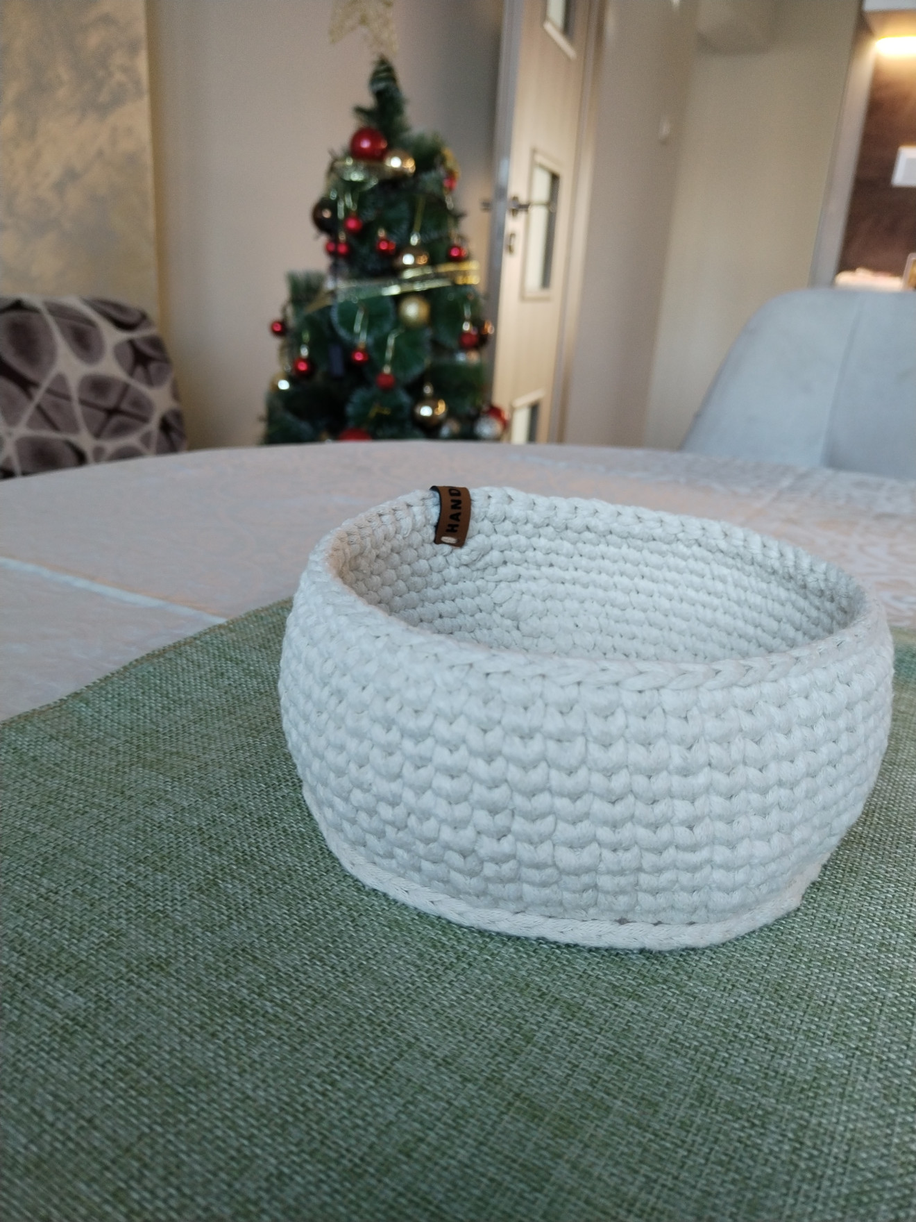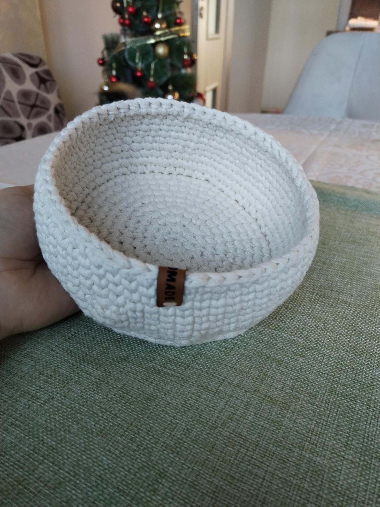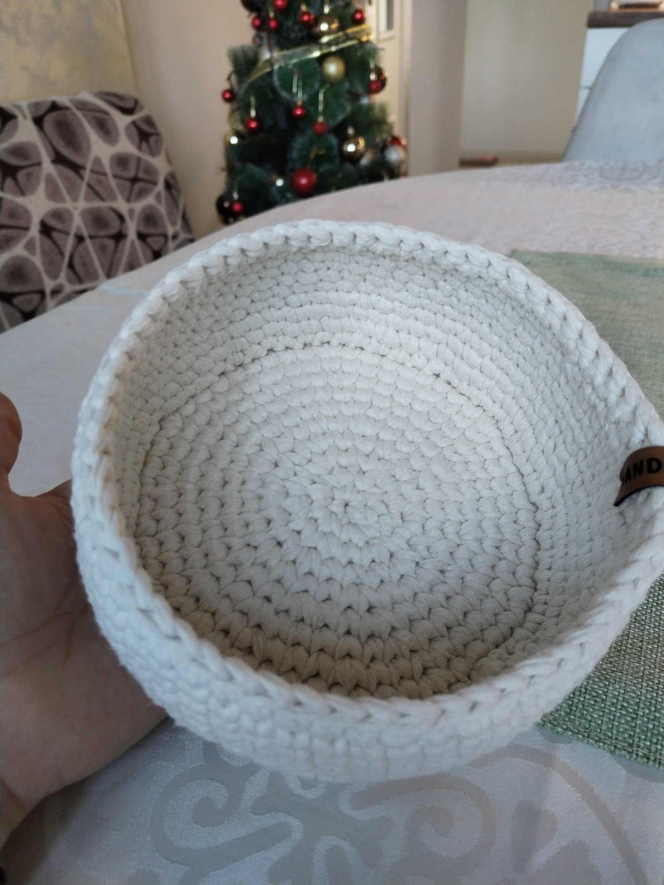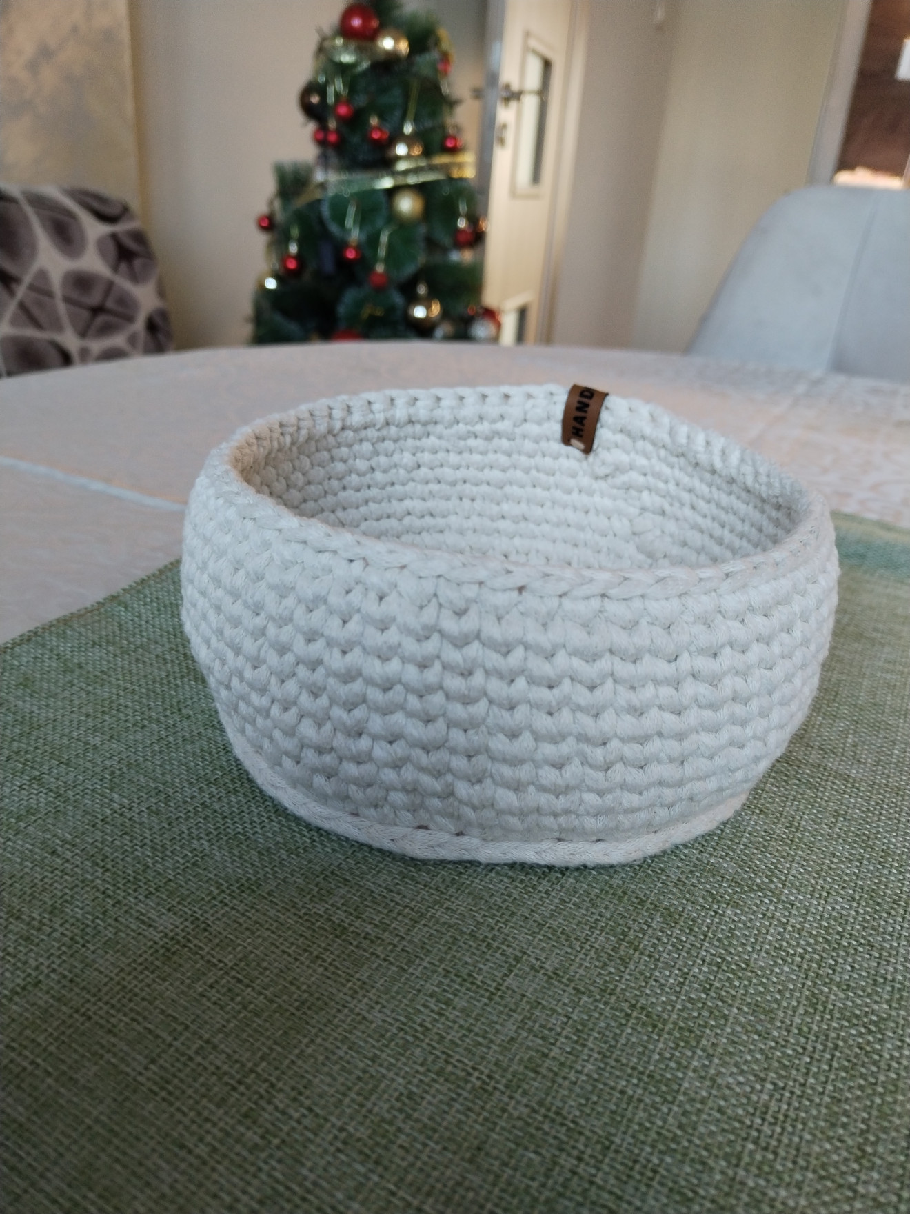 Панер изцяло изплетен на една кука. Диаметър 15 см, височина на стените 7,5 см. Перфектното решение за организиране на вашите козметични продукти, принадлежности и като допълнение за декора на вашия дом.