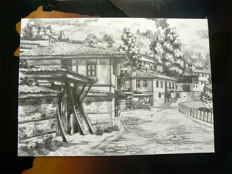 Рисунка с къщи от Копривщица ? Молив върху картон. Размери 21 на 29,7 см. 2022 г.