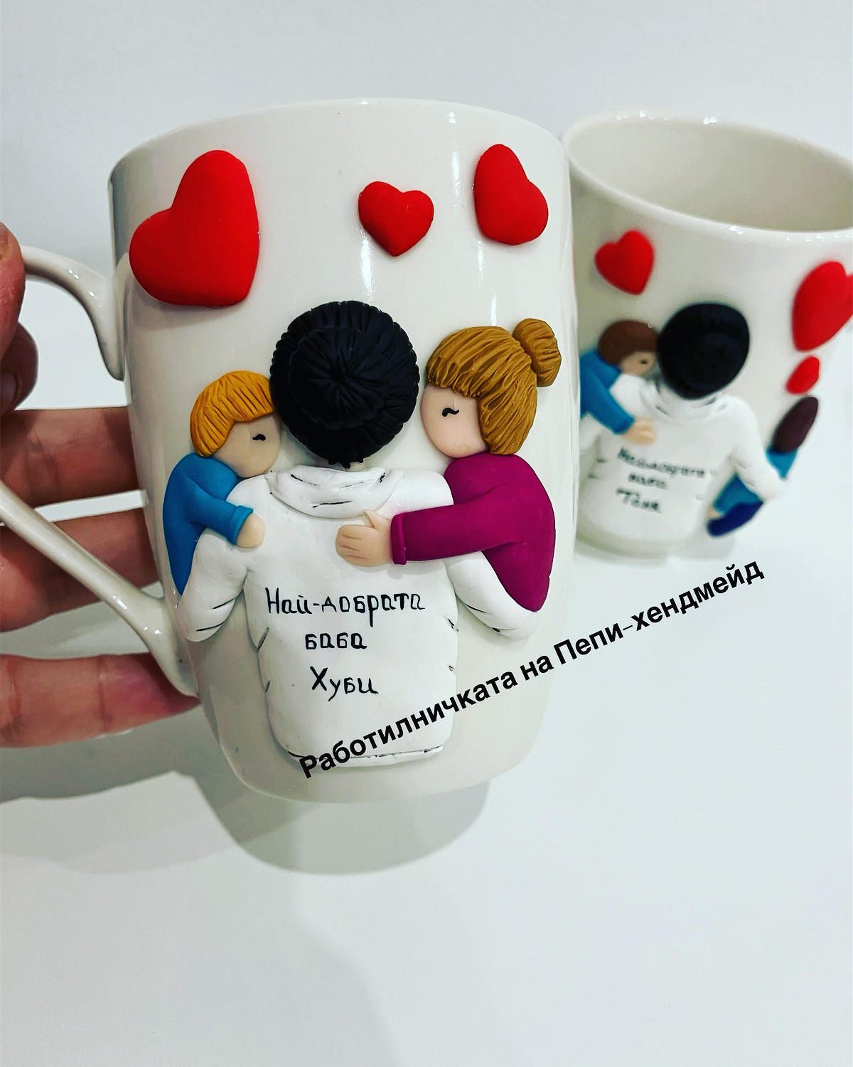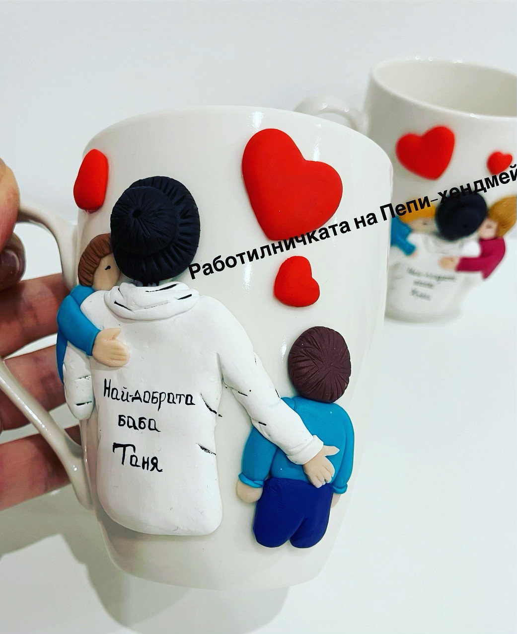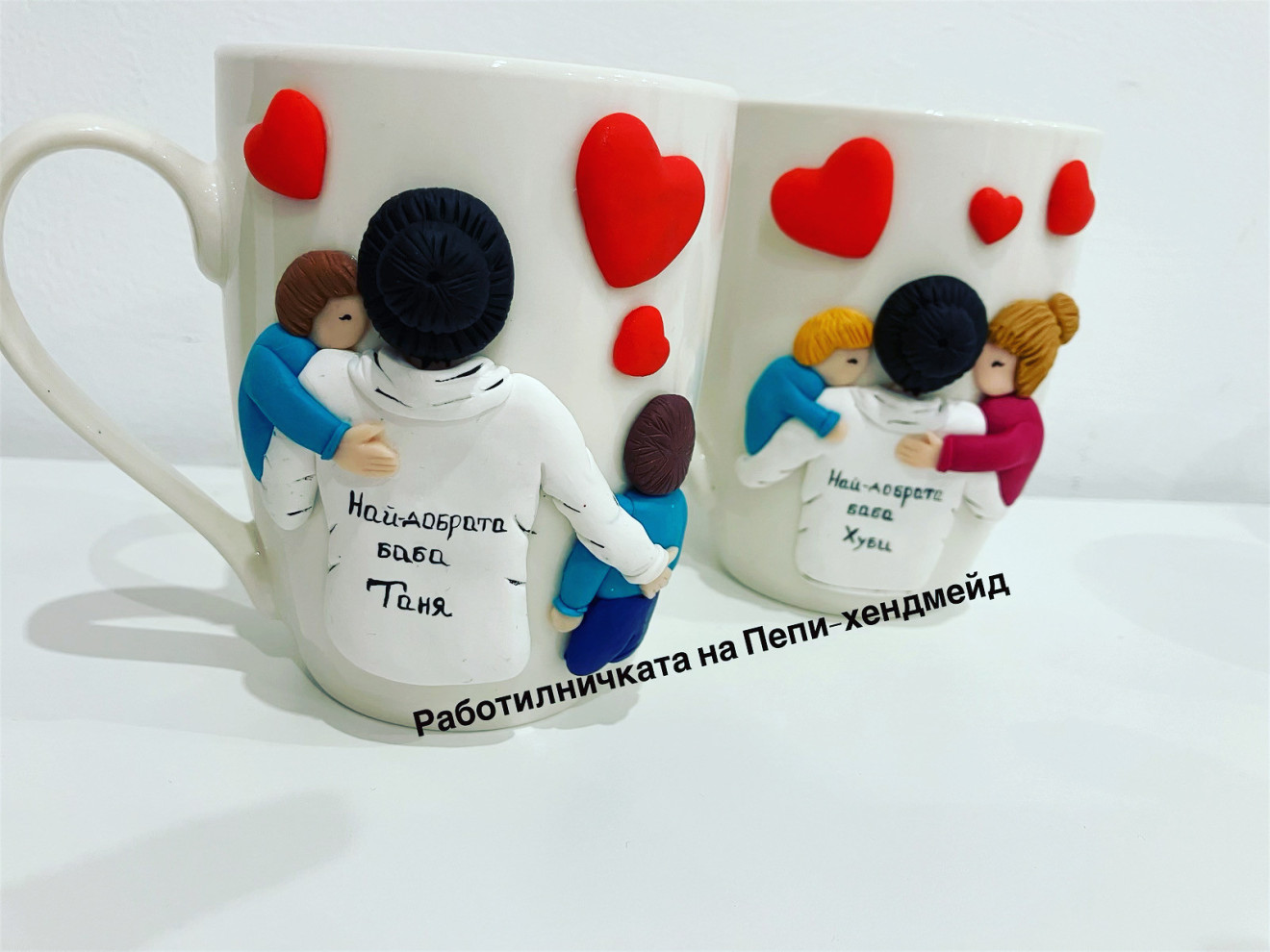 Керамична чаша с декорация от полимерна глина за “Баба” с възможност за добавяне на кратък надпис от полимерна глина +5лв