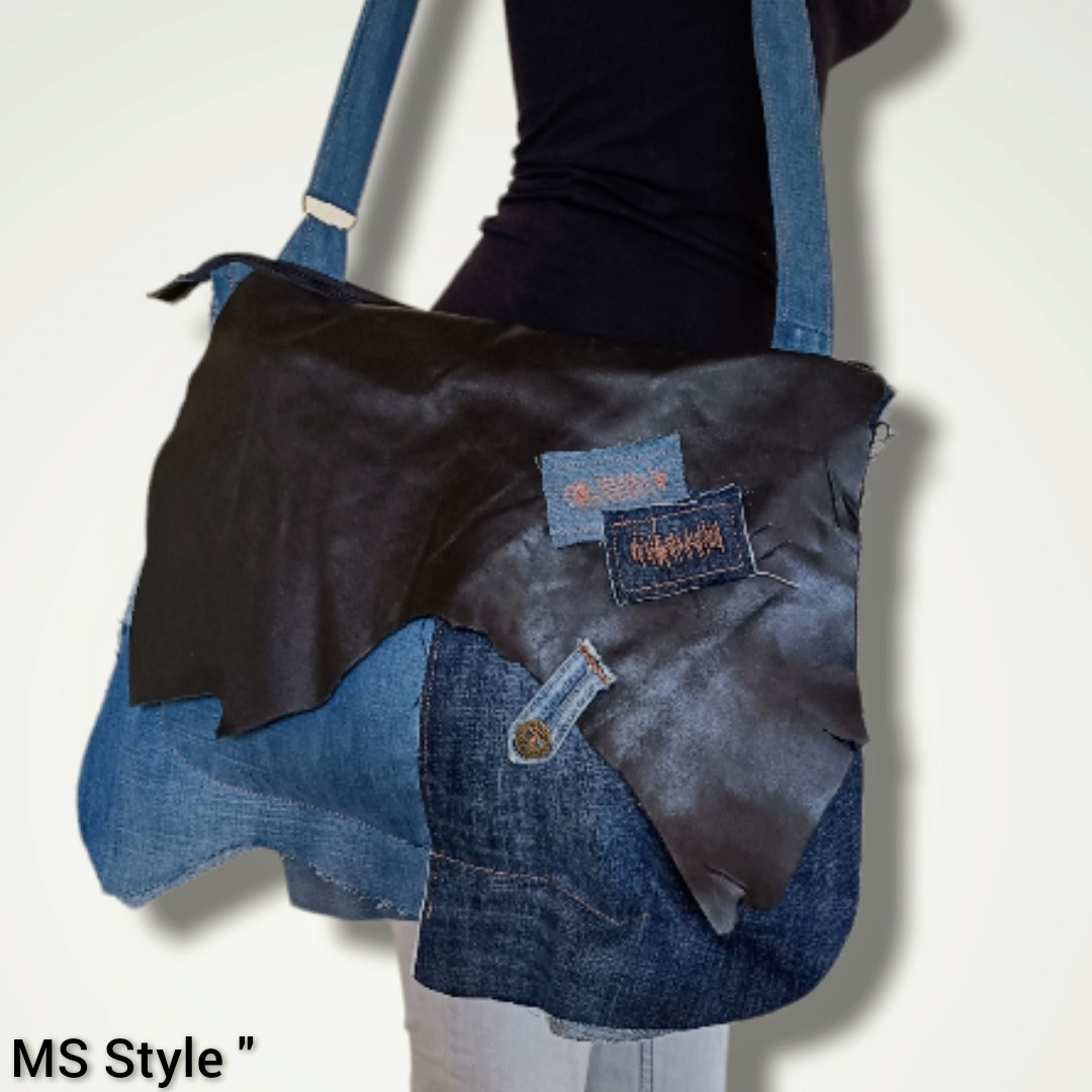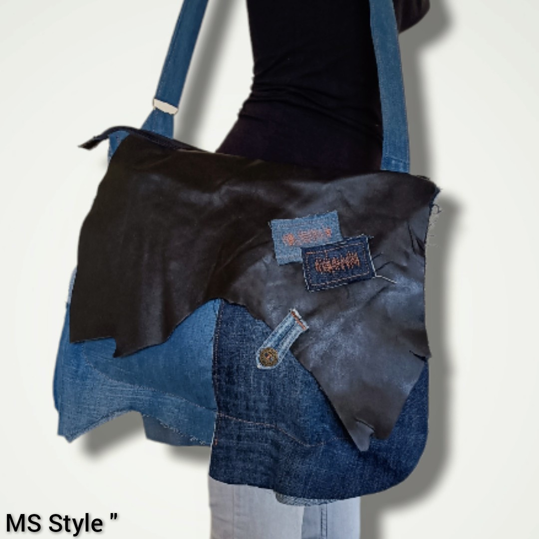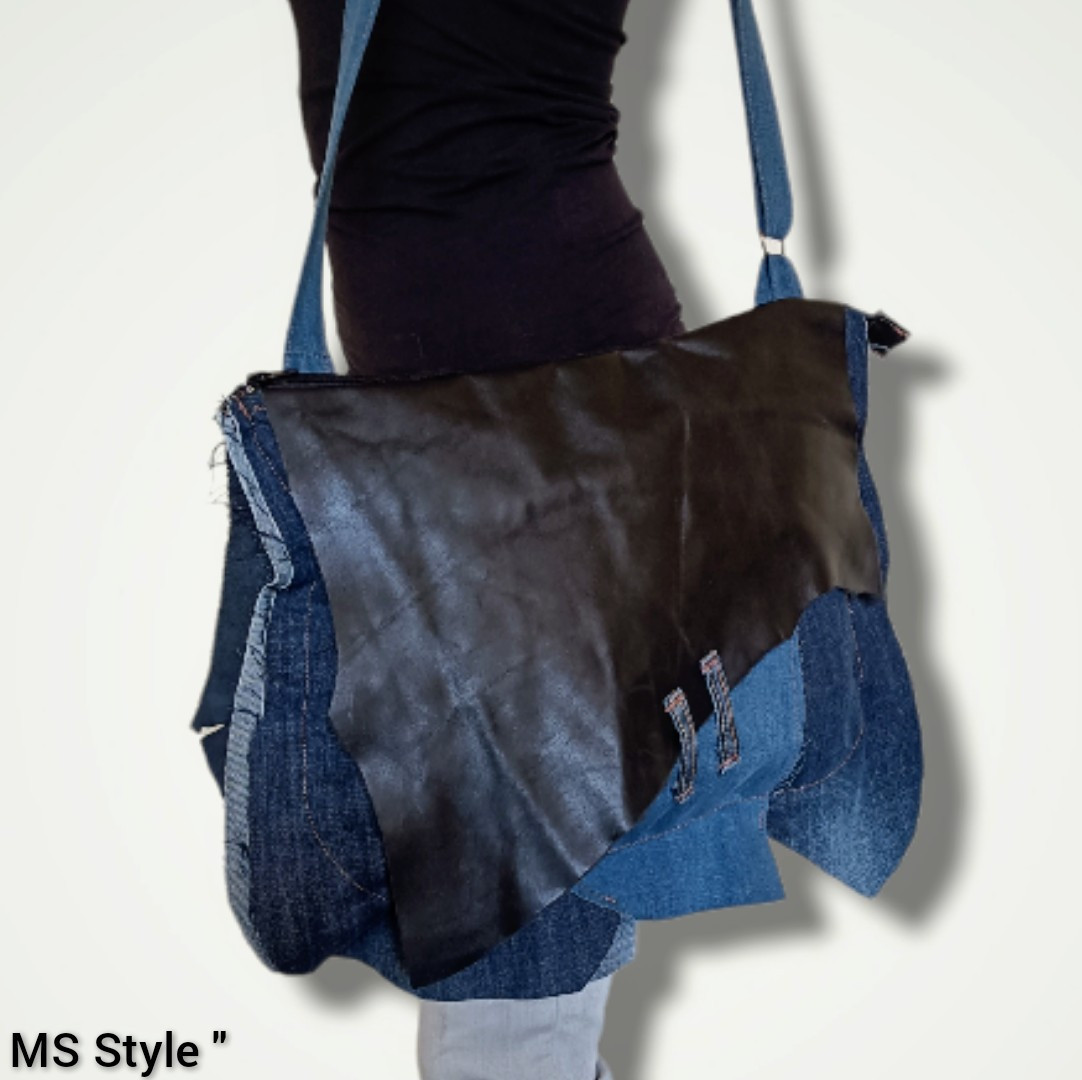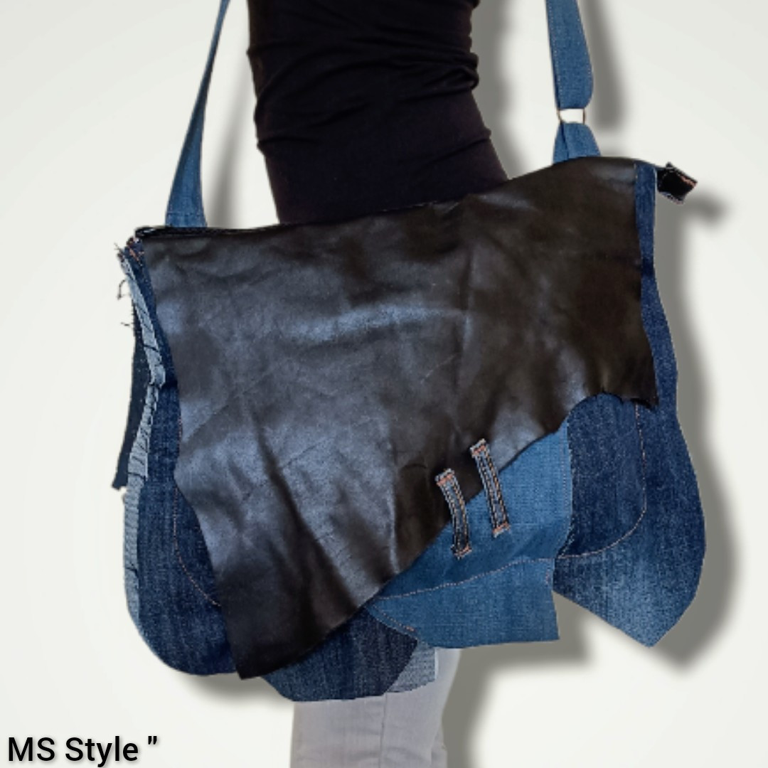 #Асиметрична #дамска #чанта от #деним и #естествена #кожа" Разчупена и атрактивна, чантата е #ръчно #изработена в комбинация от #деним и #естествена #кожа, с #две #лица, различна от двете страни, с #дълга регулираща се #дръжка, с #едно #отделение закопчава се с #цип, #памучна #подплата и два вътрешни джоба, размери на вместимост 41/33 см без висящата част, цена 72 лв.