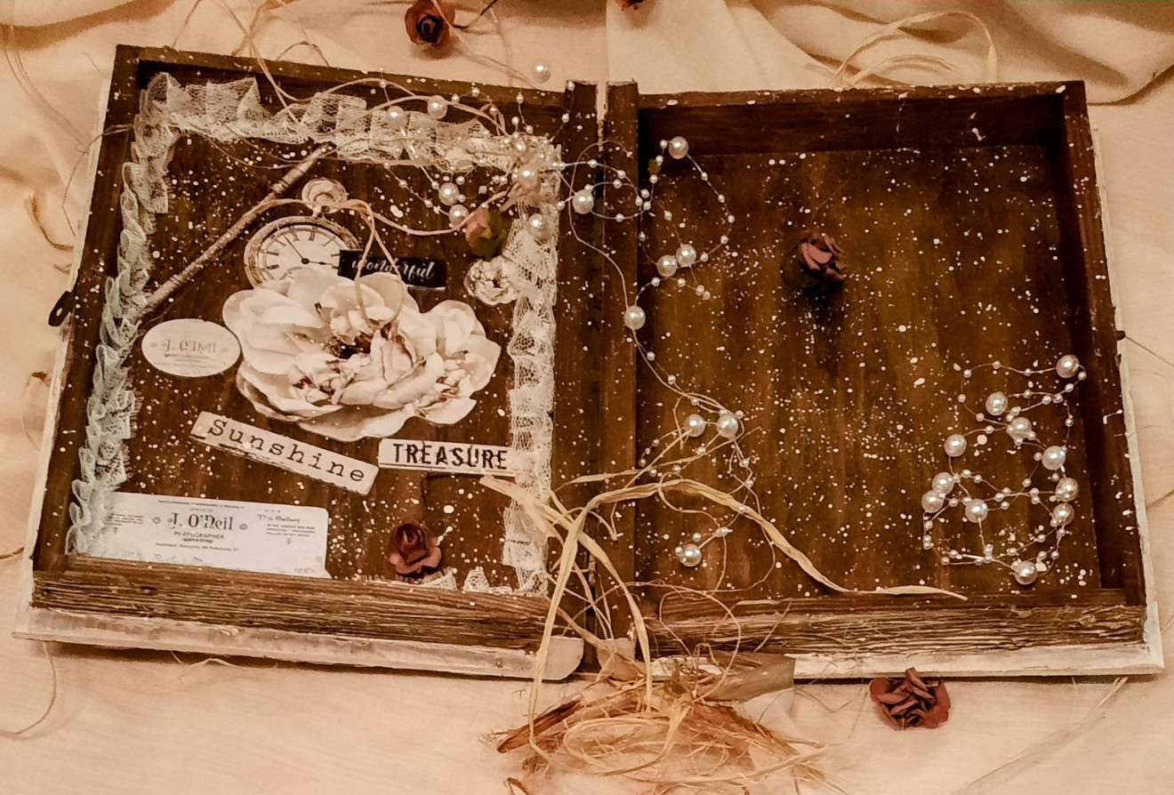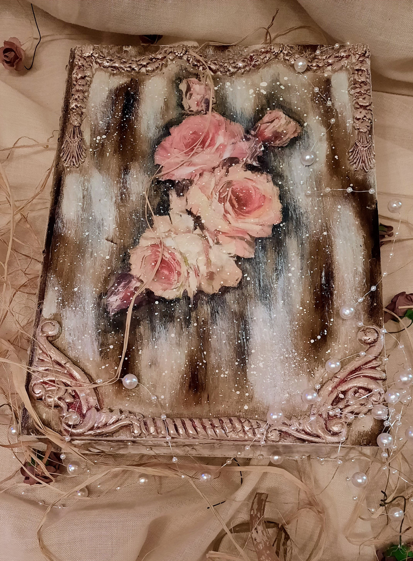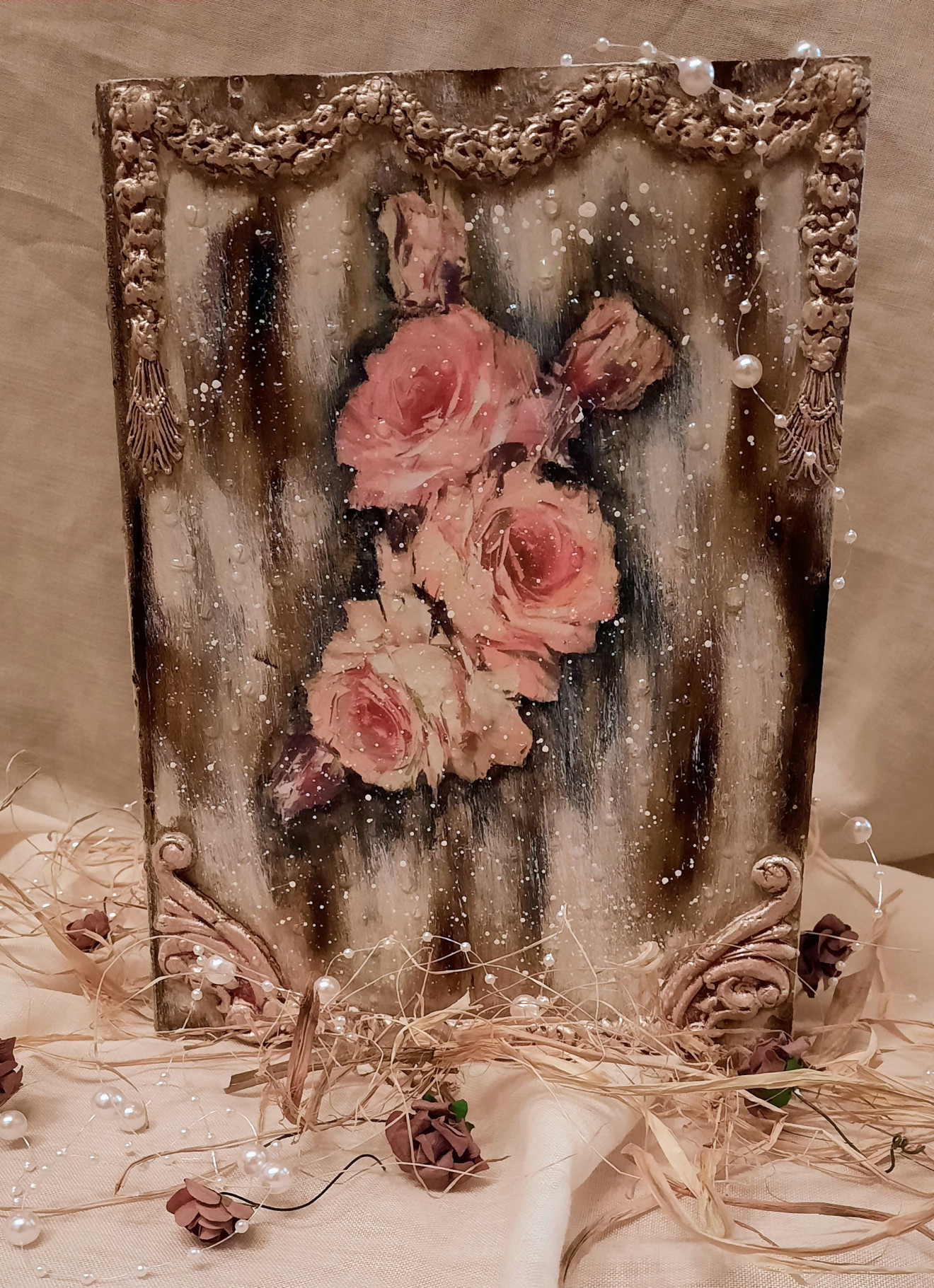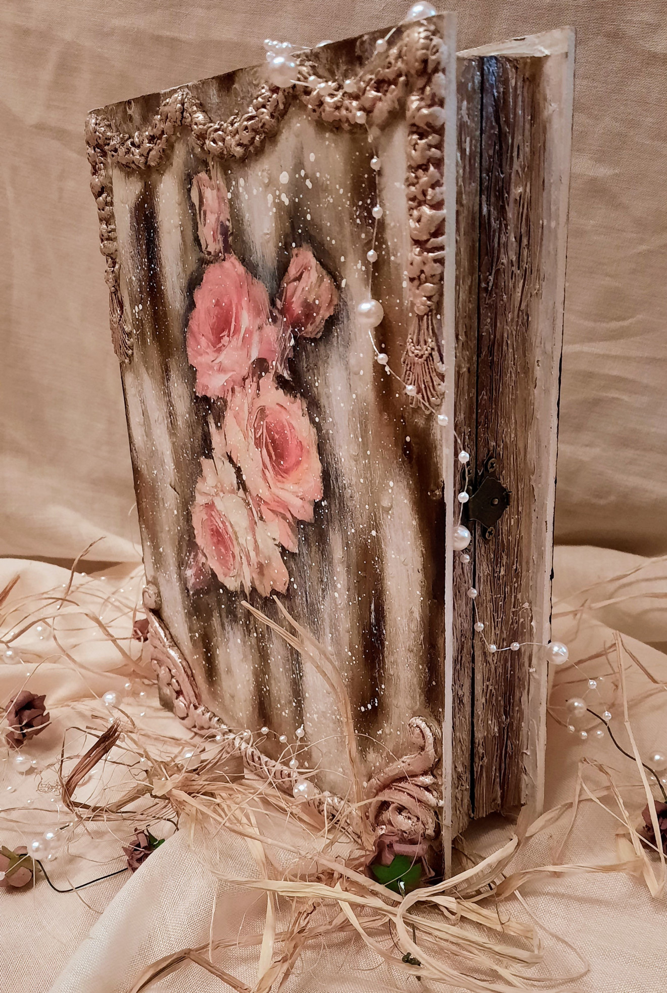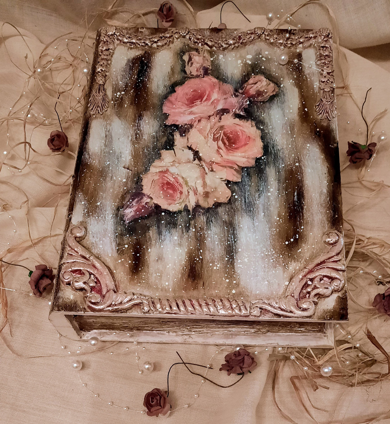 Ръчно направена дървена кутия за бижута "рози". Използвани материали, акрилни бои, битум асфалт, антични пасти, глина, паста за релеф и лак за завършек. Размери на кутията 25/18/5 см.