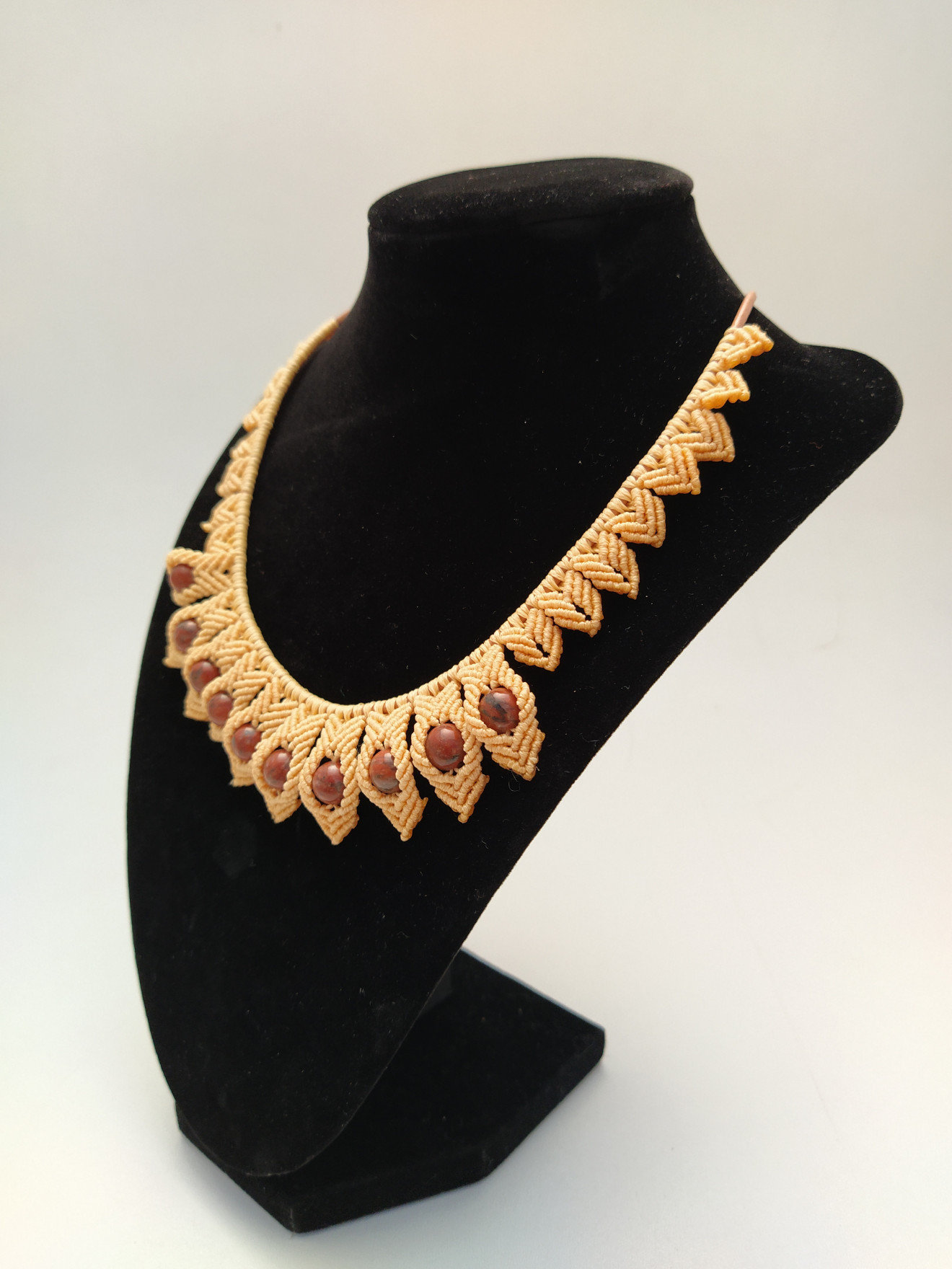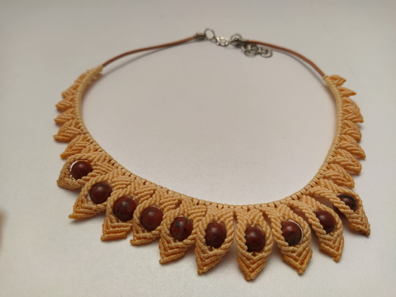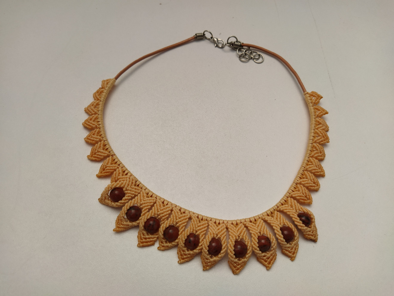 Колието е изработено с техниката макраме или вид плетене с възли. Верижката е бежава кожа със метална закопчалка. Плетената част е около 25-26 см. Използвани са восъчни конци и естествен камък Яспис. Колието е леко и удобно, подходящо за ежедневно носене. Дължината е 40 + 5 см. в най-широката си част е 3 см. За допънителна информация, въпроси или друго, моля, не се колебайте да се свържете с мен. Артикула идва опакован и готов за подаряване.