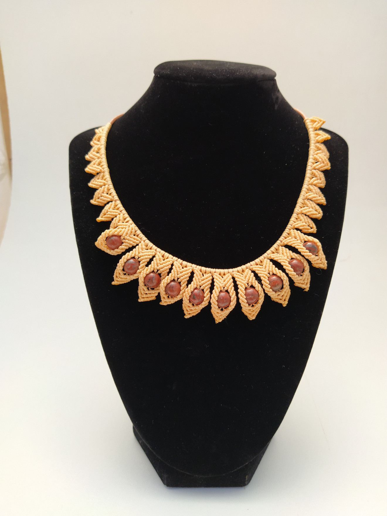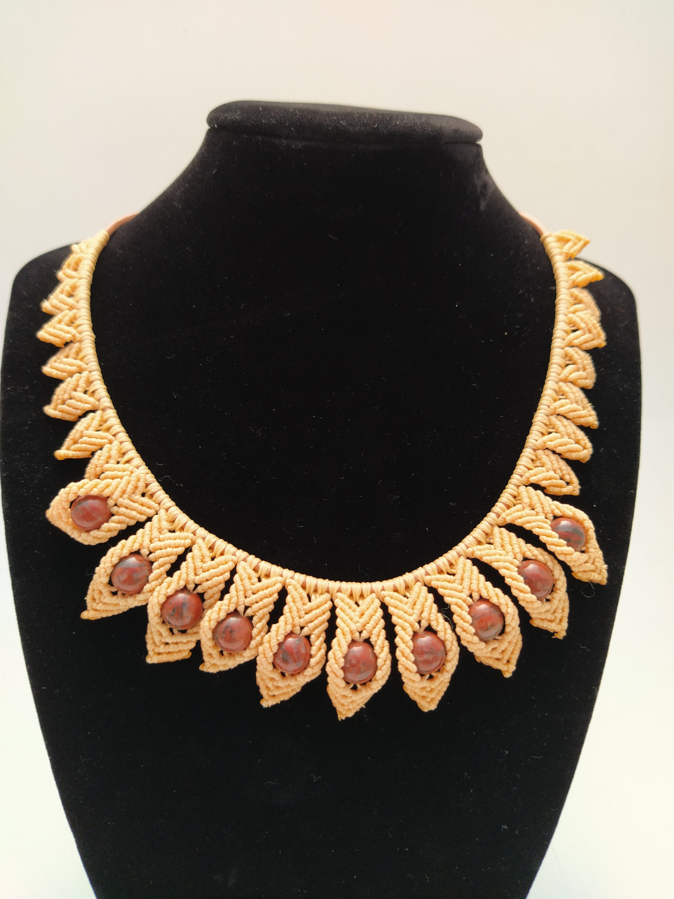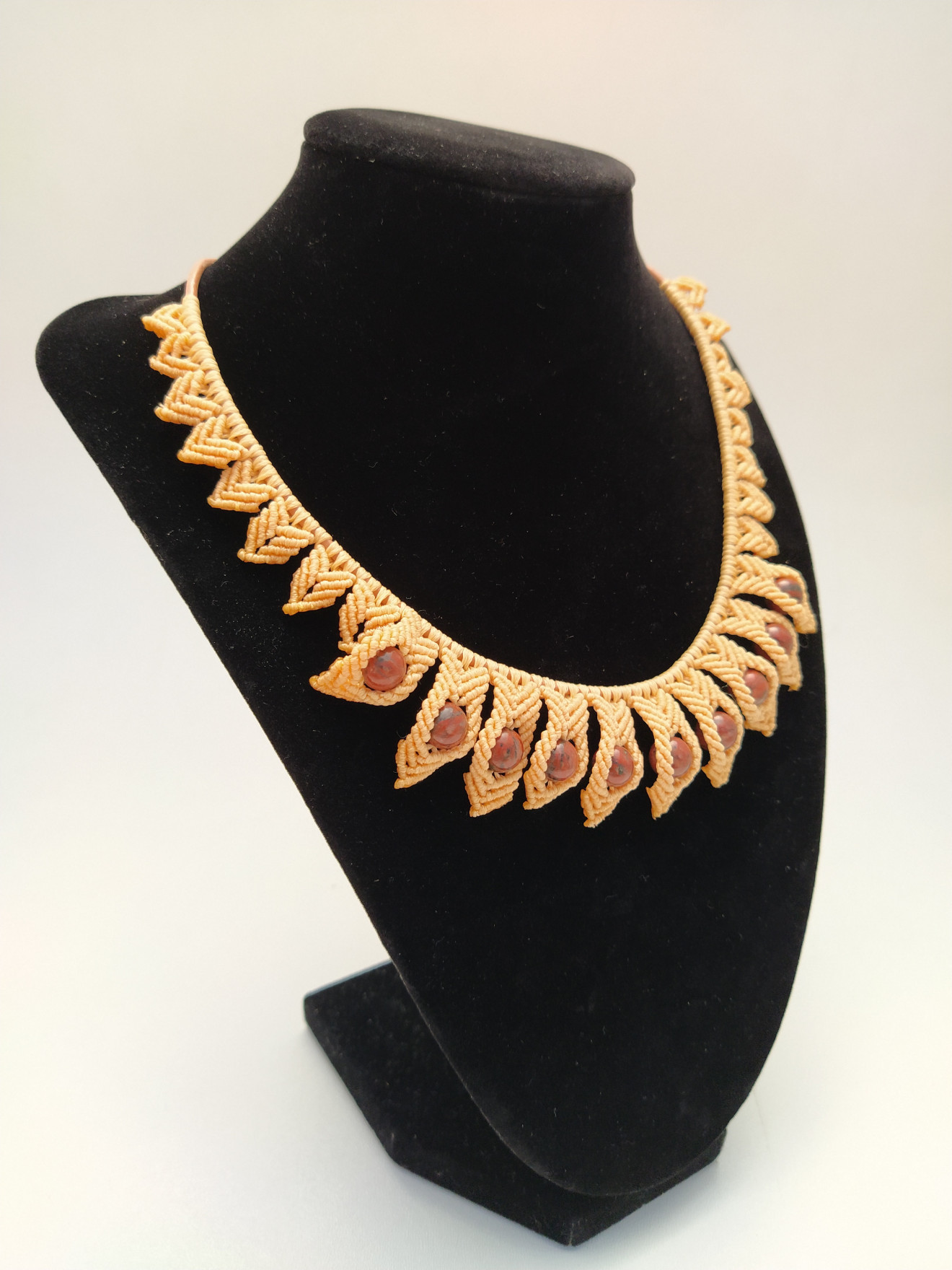 Колието е изработено с техниката макраме или вид плетене с възли. Верижката е бежава кожа със метална закопчалка. Плетената част е около 25-26 см. Използвани са восъчни конци и естествен камък Яспис. Колието е леко и удобно, подходящо за ежедневно носене. Дължината е 40 + 5 см. в най-широката си част е 3 см. За допънителна информация, въпроси или друго, моля, не се колебайте да се свържете с мен. Артикула идва опакован и готов за подаряване.